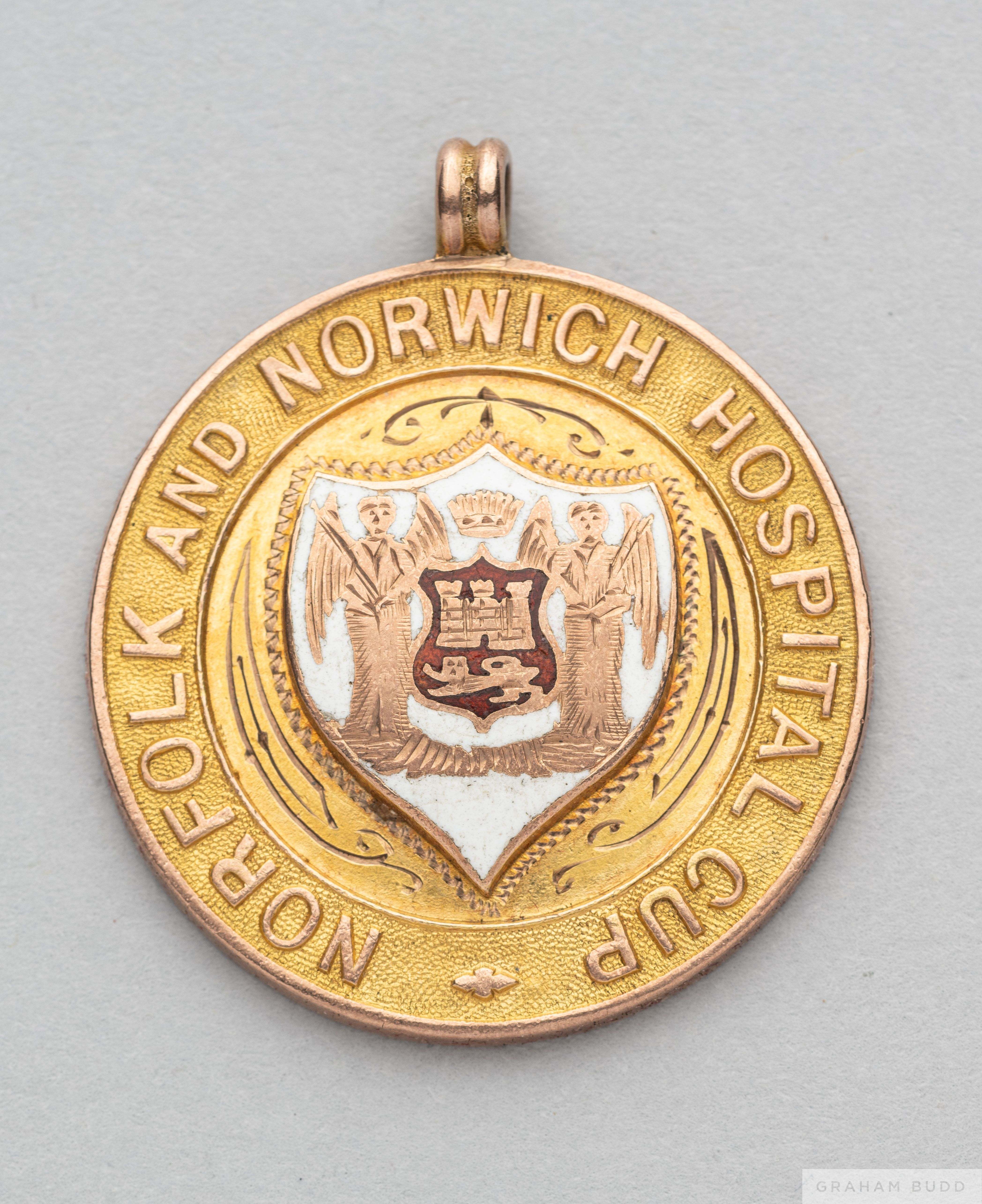 Tom Wilson 9ct gold and enamel 1922-23 Norfolk and Norwich Hospital Cup medal the obverse inscribed NORFOLK AND NORWICH HOSPITAL CUP, the reverse ins