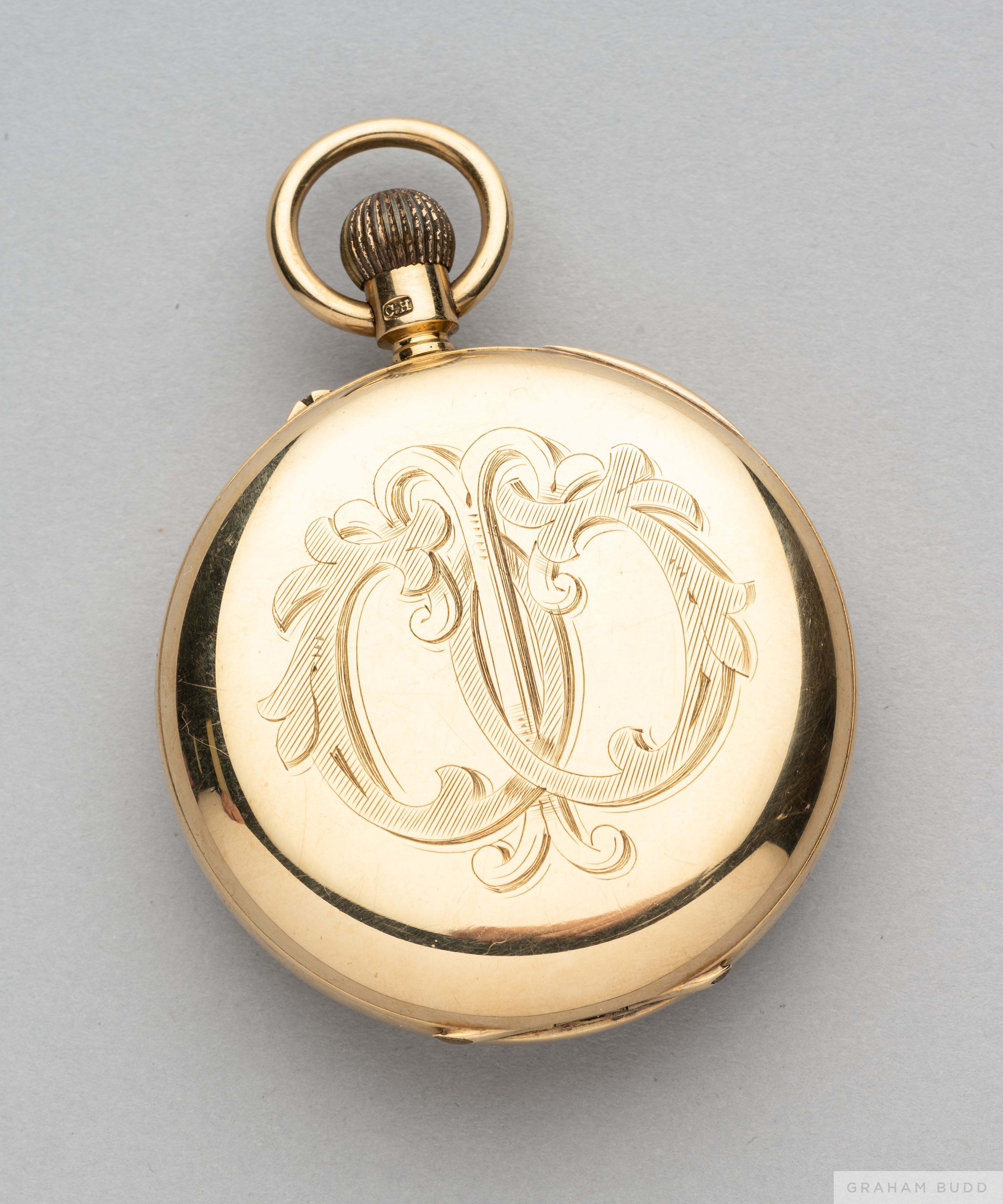 Tom Wilson 18ct gold 1921-22 Commemorative F.A.Cup pocket watch retailed by Fillans & Sons, Huddersfield with white enamel dial, black Roman numerals and subsidiary seconds, the interior of the case inscribed HUDDERSFIELD TOWN F.C., Season 1921-22, Winners of the English Cup, Presented to T. Wilson, with decorative case, overweight including movement 123grms In the 1922 F.A.Cup final played on 29th April at Stamford Bridge for the last time, Huddersfield Town defeated Preston North End 1-0, this was the club's first ever major honour. The following lots 902 to 943 relate to the career of Huddersfield Town Legend and England International Tom Wilson. See player bio at foot of description for Lot 902 PROVENANCE: Tom Wilson thence by family descent