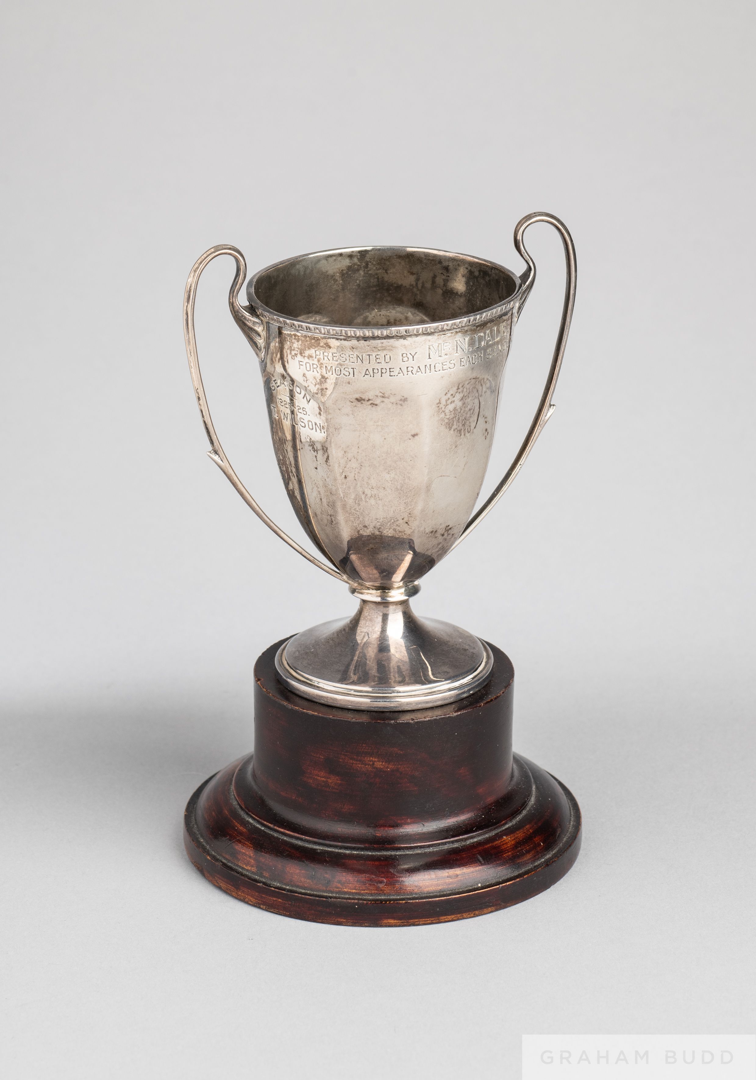 Tom Wilson 1925-26 silver two-handled trophy awarded for most appearances inscribed HUDDERSFIELD TOWN A.F.C., Presented By Mr. N Dale, For Most Appearance each Season. SEASON 1925-26, T. WILSON, on circular wooden base, 15cm high overall, 77grms The following lots 902 to 943 relate to the career of Huddersfield Town Legend and England International Tom Wilson. See player bio at foot of description for Lot 902 PROVENANCE: Tom Wilson thence by family descent