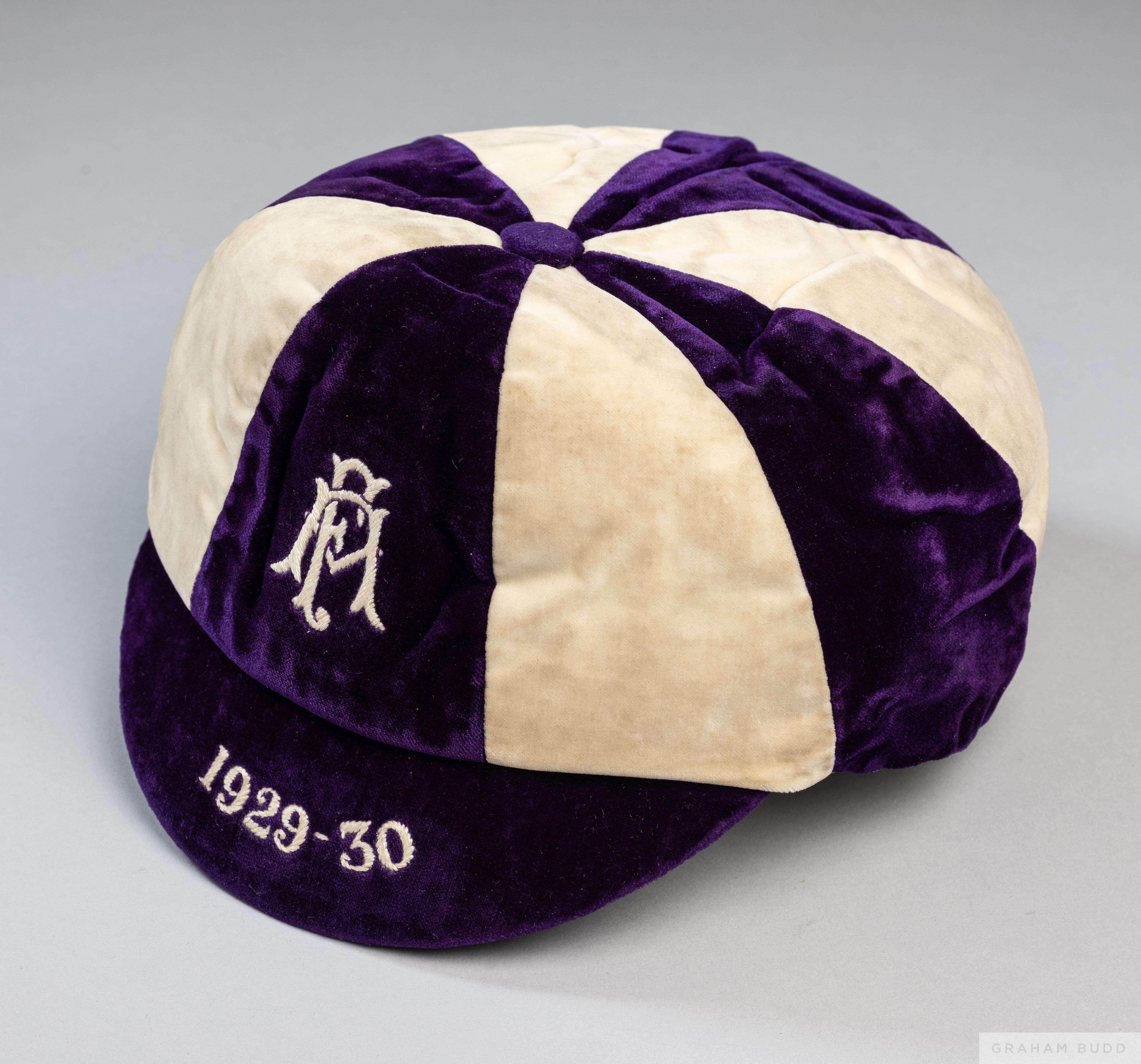Tom Wilson purple and white Football Association trial cap, 1929-30 the quartered velvet cap embroidered FA and dated 1929-30 The following lots 90