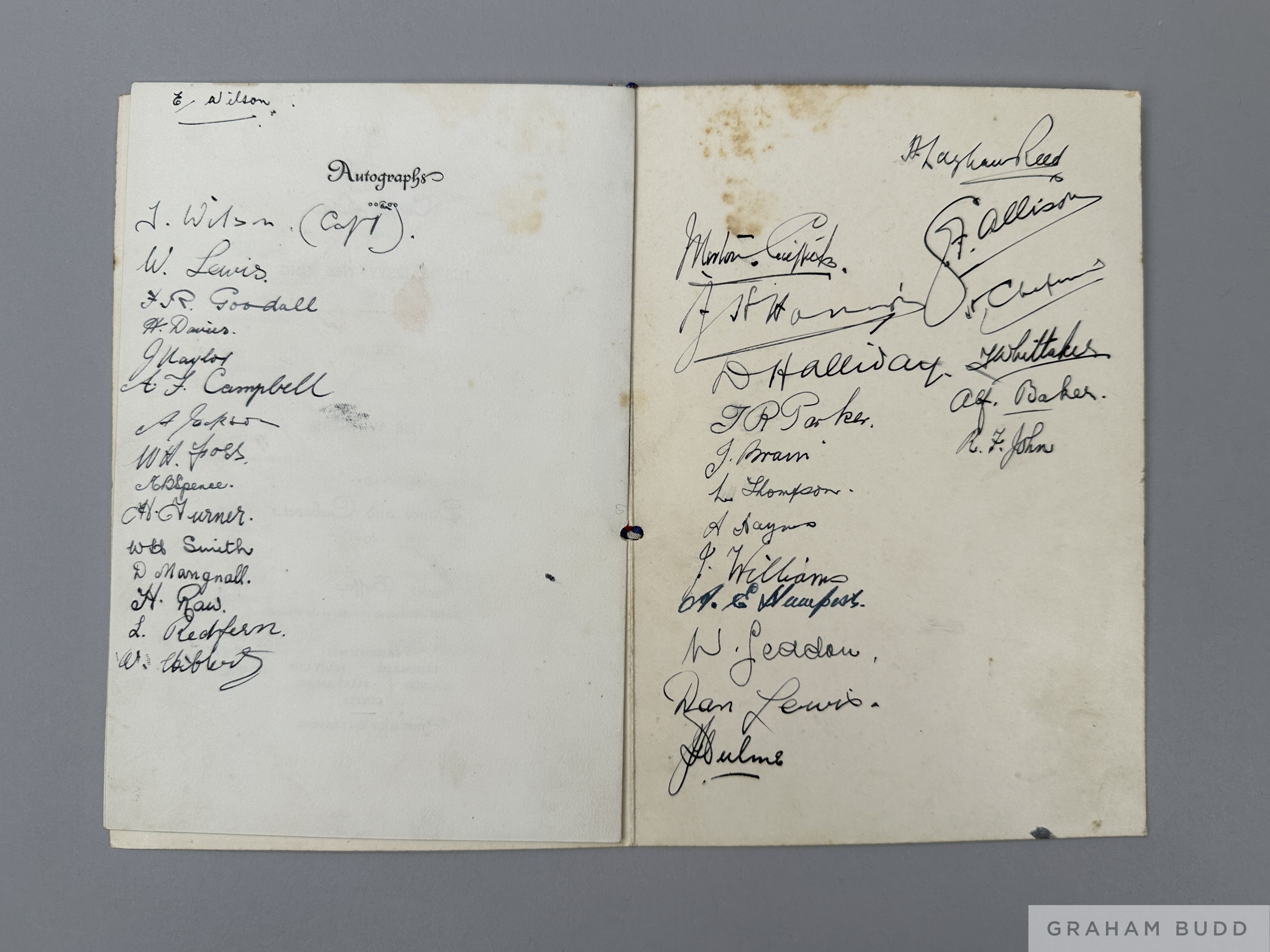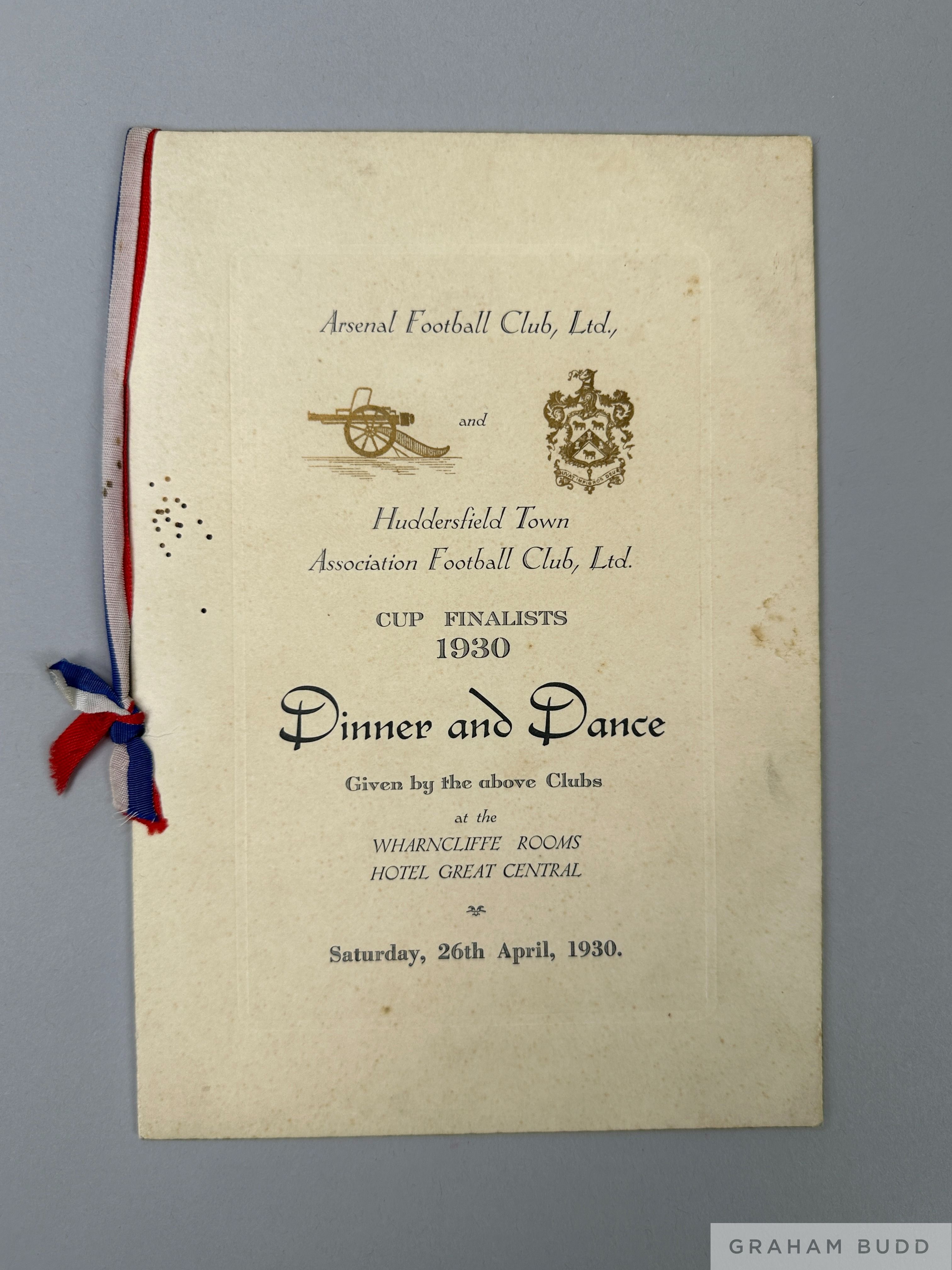 Tom Wilson banquet menu card for the 1930 Huddersfield Town v. Arsenal F.A.Cup Final the menu card signed by ten of the Huddersfield team, lacking Bob Kelly and with five other Huddersfield autographs, the opposite page autographed by seven of the Arsenal side, lacking Preedy, Jack, James and Bastin and with eleven other Arsenal autographs, held at the Wharncliff Rooms, Hotel Great Central, 26th April 1930 The following lots 902 to 943 relate to the career of Huddersfield Town Legend and England International Tom Wilson. See player bio at foot of description for Lot 902 PROVENANCE: Tom Wilson thence by family descent