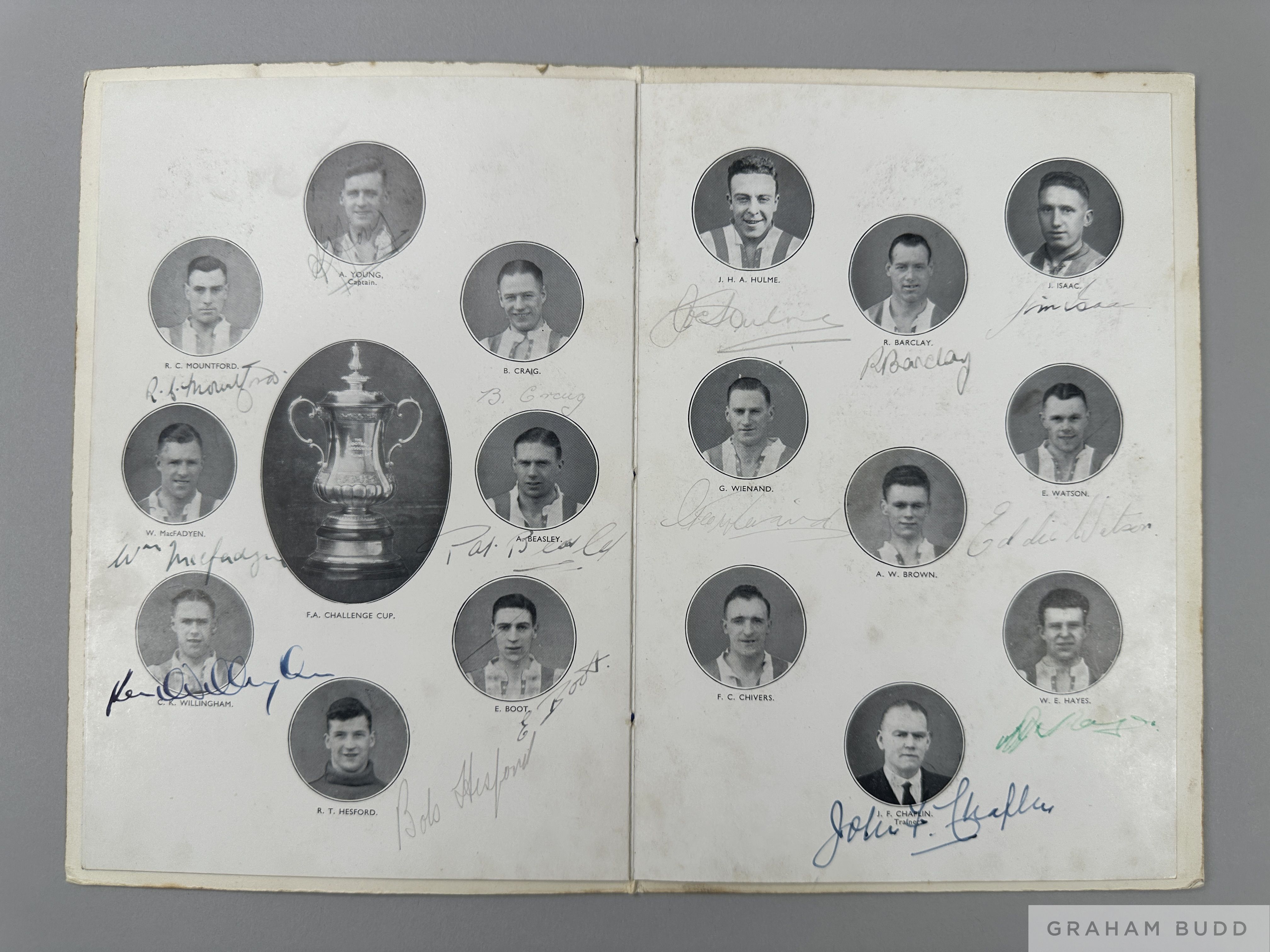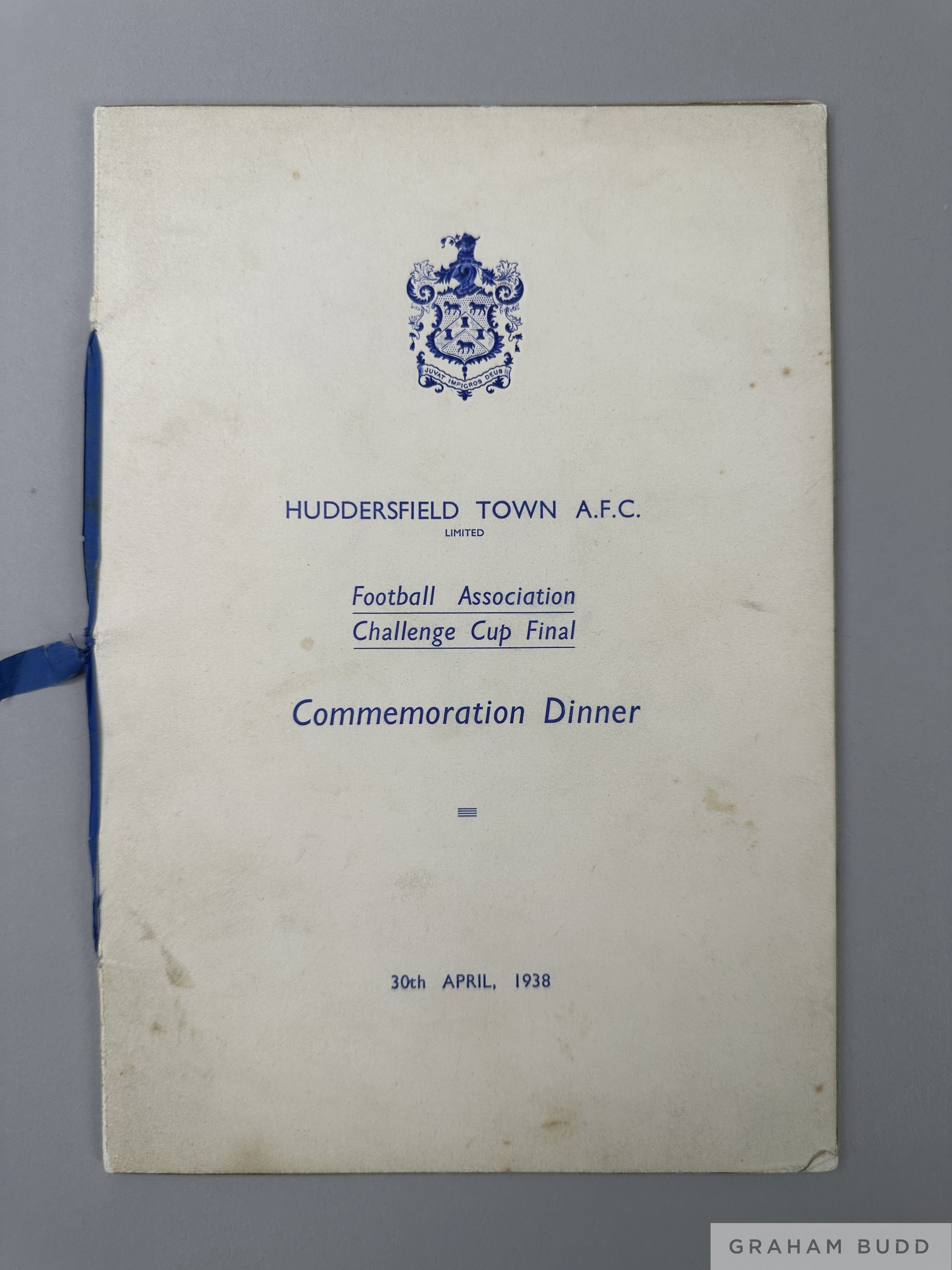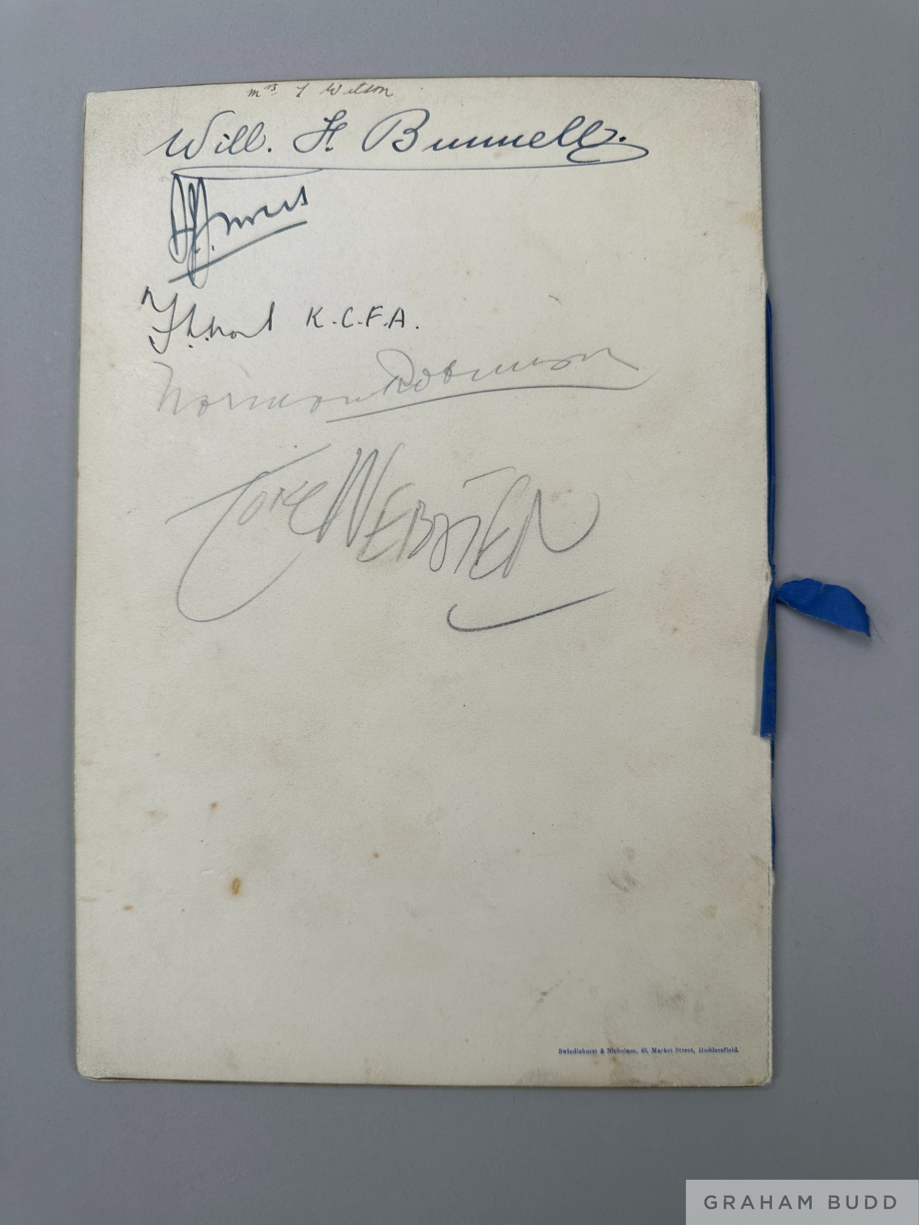Tom Wilson Huddersfield Town 1938 F.A.Cup Final Commemoration Dinner menu the team line up page autographed lacking Brown & Chivers, the back cover six further autographs, held at Hotel Great Central, 30th April 1938 The following lots 902 to 943 relate to the career of Huddersfield Town Legend and England International Tom Wilson. See player bio at foot of description for Lot 902 PROVENANCE: Tom Wilson thence by family descent