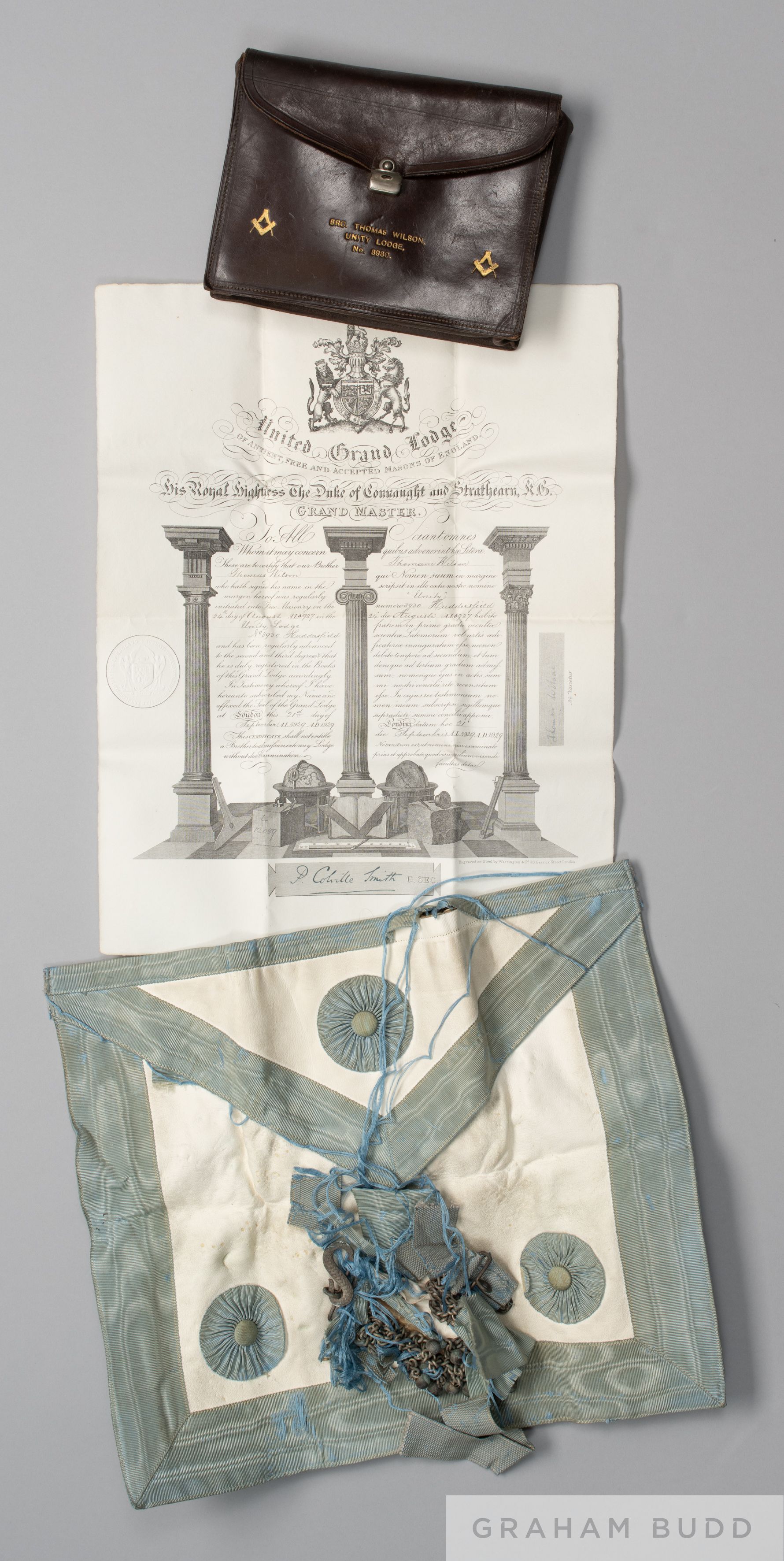 Tom Wilson masonic apron and certificate dated 24th August 2917 in original leather case with gilt-tooled lettering Bro. Thomas Wilson, Unity Lodge, No,8980 The following lots 902 to 943 relate to the career of Huddersfield Town Legend and England International Tom Wilson. See player bio at foot of description for Lot 902 PROVENANCE: Tom Wilson thence by family descent