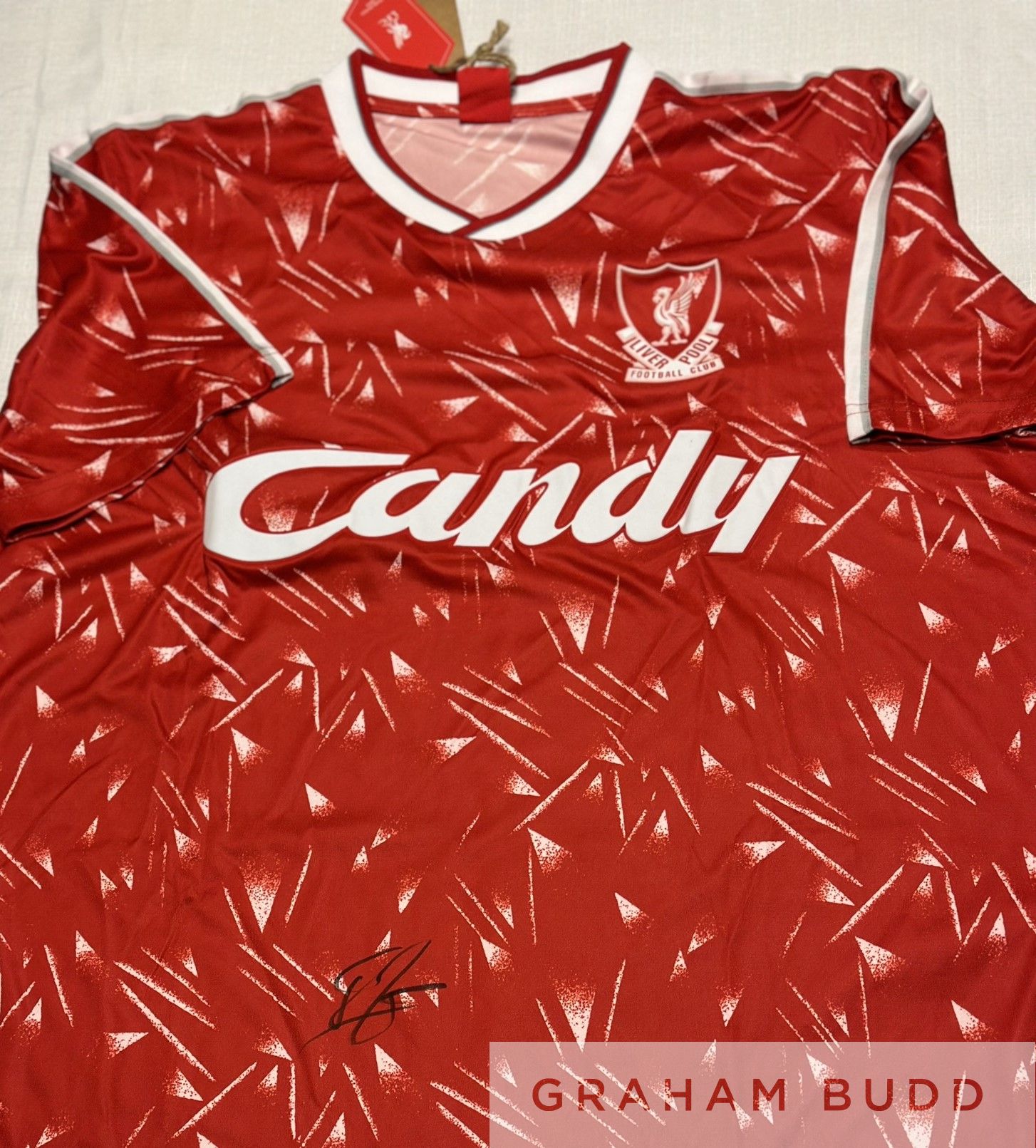 Liverpool: John Barnes signed retro “Candy” Liverpool FC shirt, 1989/1990/1991 Liverpool FC retro replica shirt. Signed by John Barnes with black sharpie on front of shirt. Size XL. New with tags on. Comes with Certificate of Authenticity and photo proof of signing, (2)