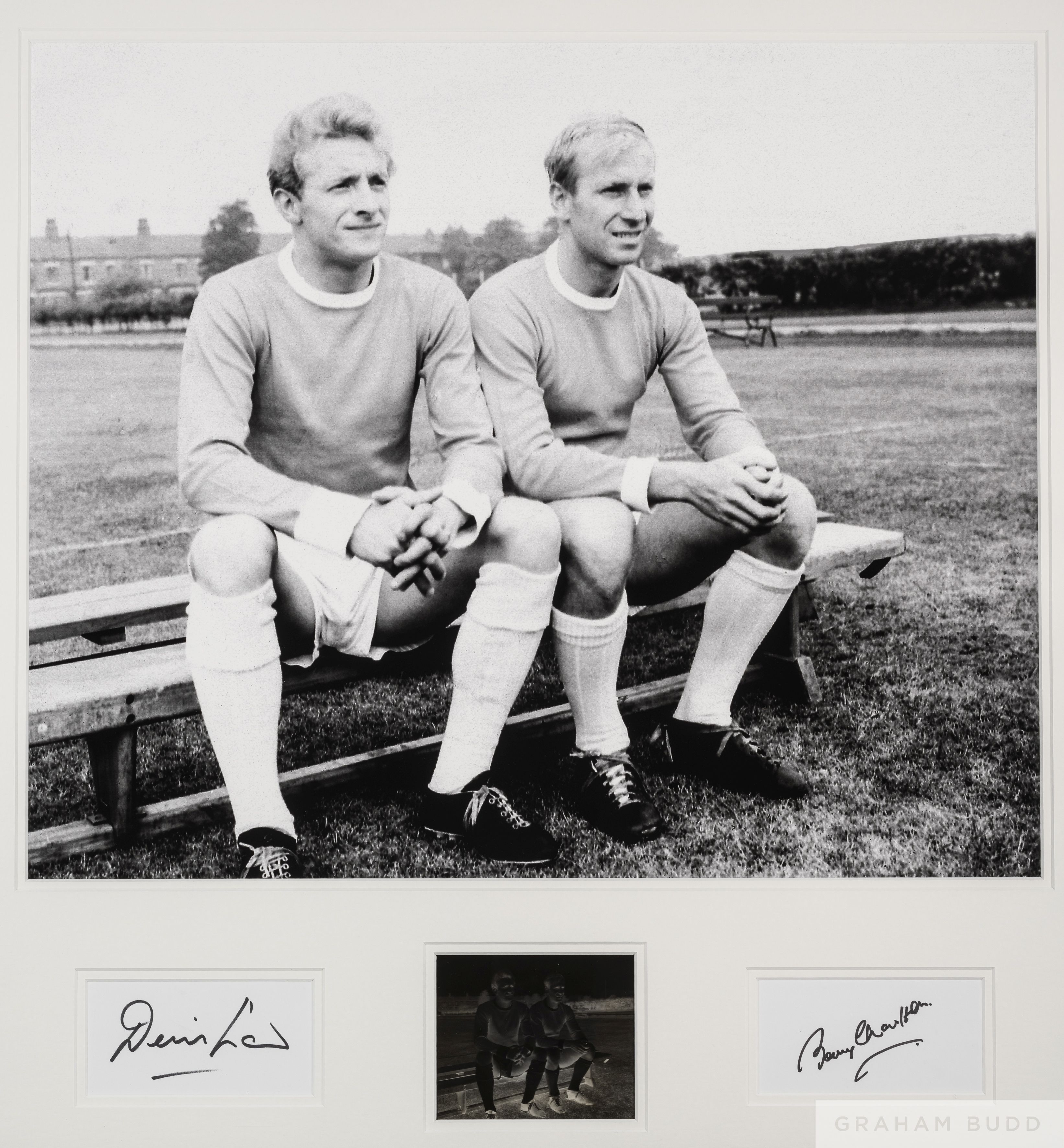 Large b&w autographed photograph of Bobby Charlton and Denis Law, taken during a break in a training season with original glass of the image, 1960s, in common-mount, 31 by 30cm, framed and glazed All glass will be removed from framed and glazed items prior to posting and may result in delays to shipping your items. (This service is included in the cost of postage and packing). We can also totally remove all framing and mounts upon request to reduce shipping costs. Alternatively, lots can be collected in person by prior appointment from NN8 1RT.