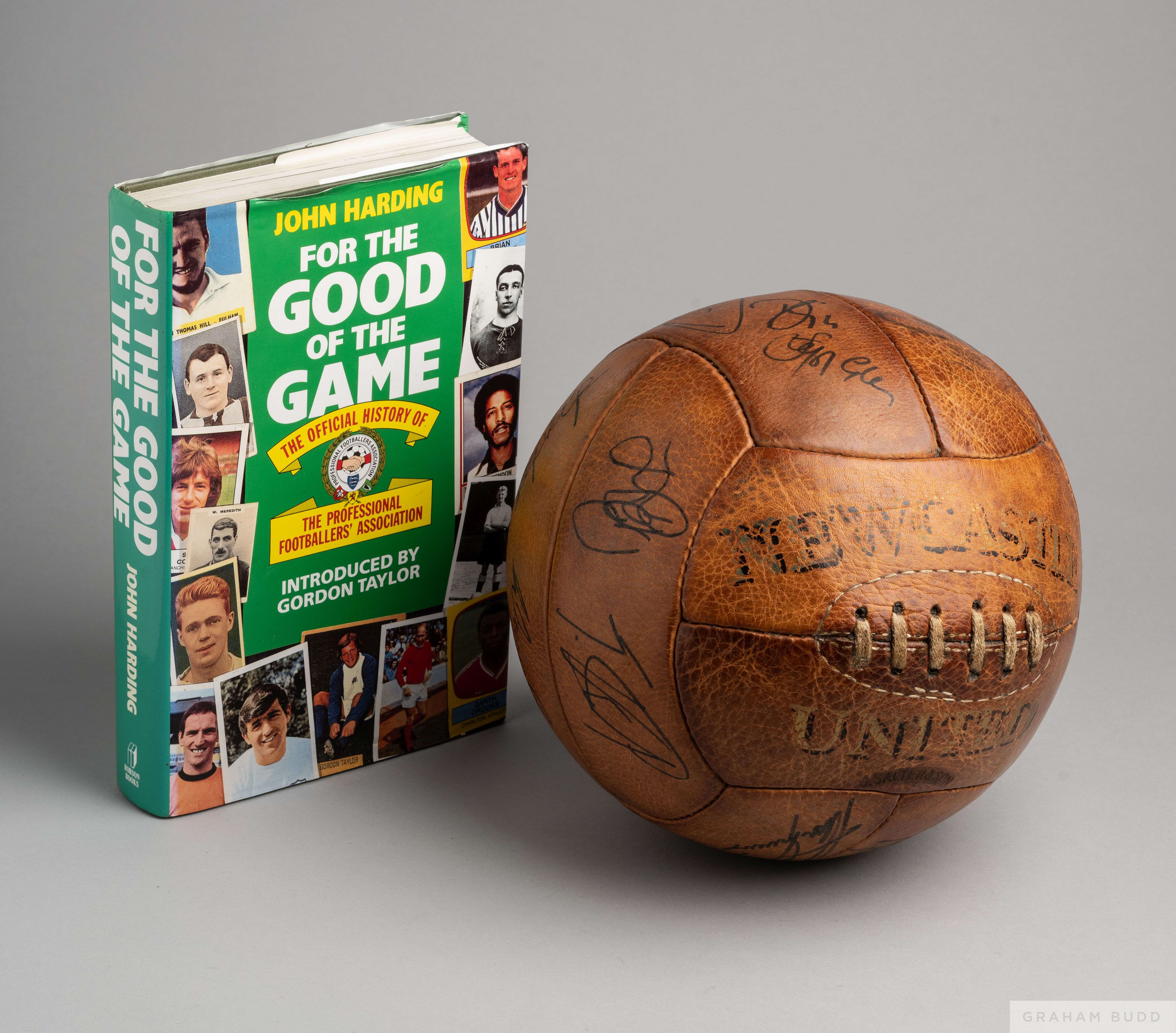 Brown leather Newcastle United autographed football bearing numerous autographs including Ivor Allchurch, Albert Scanlon, Bobby Ferguson etc and a copy of For The Good of the Game by John Harding, the inside cover autographed by Tom Finney, Stanley Matthews, Jimmy Hill, Gordon Taylor (P.F.A.) (2)