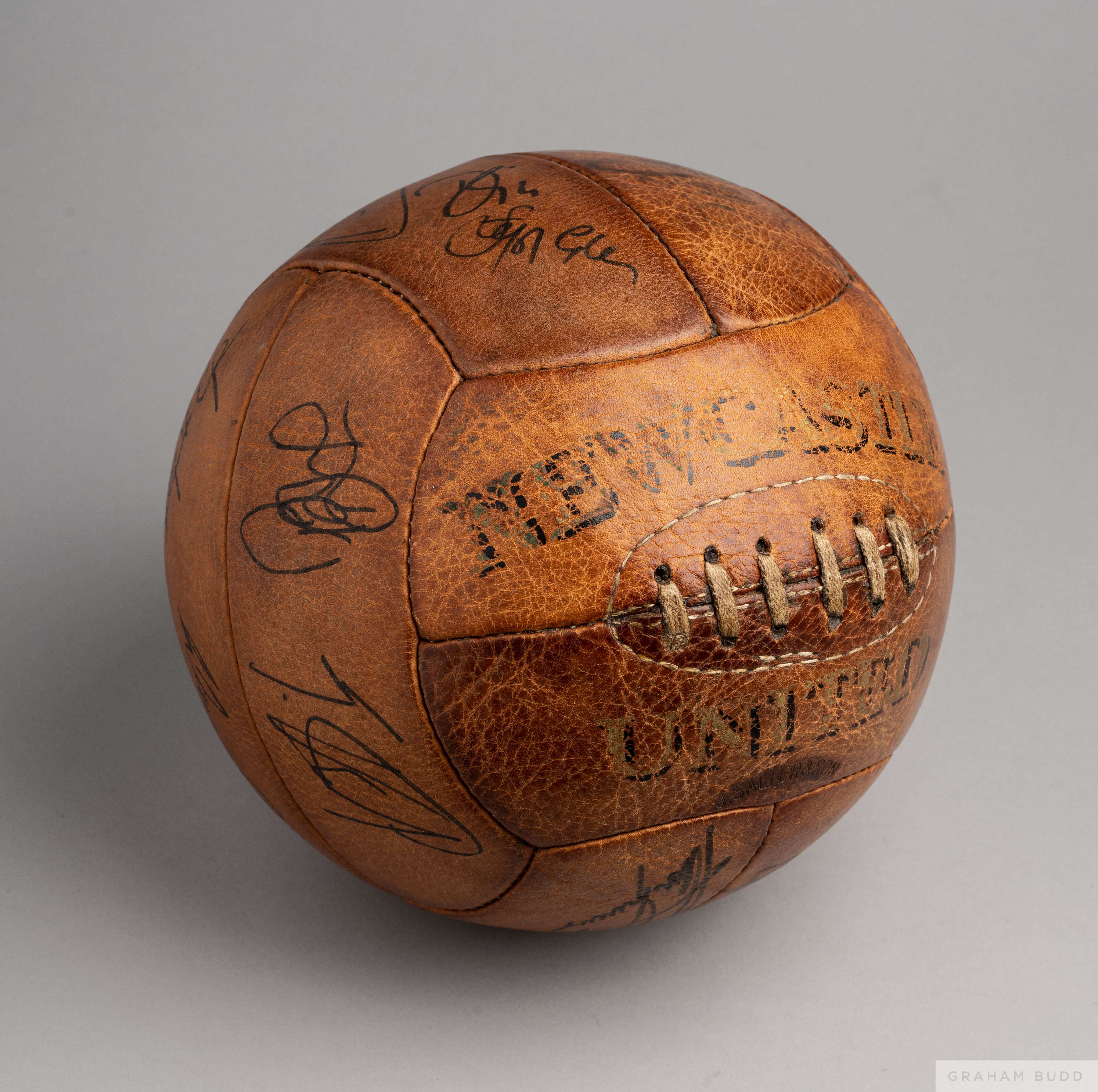 Brown leather Newcastle United autographed football bearing numerous autographs including Ivor Allchurch, Albert Scanlon, Bobby Ferguson etc and a co