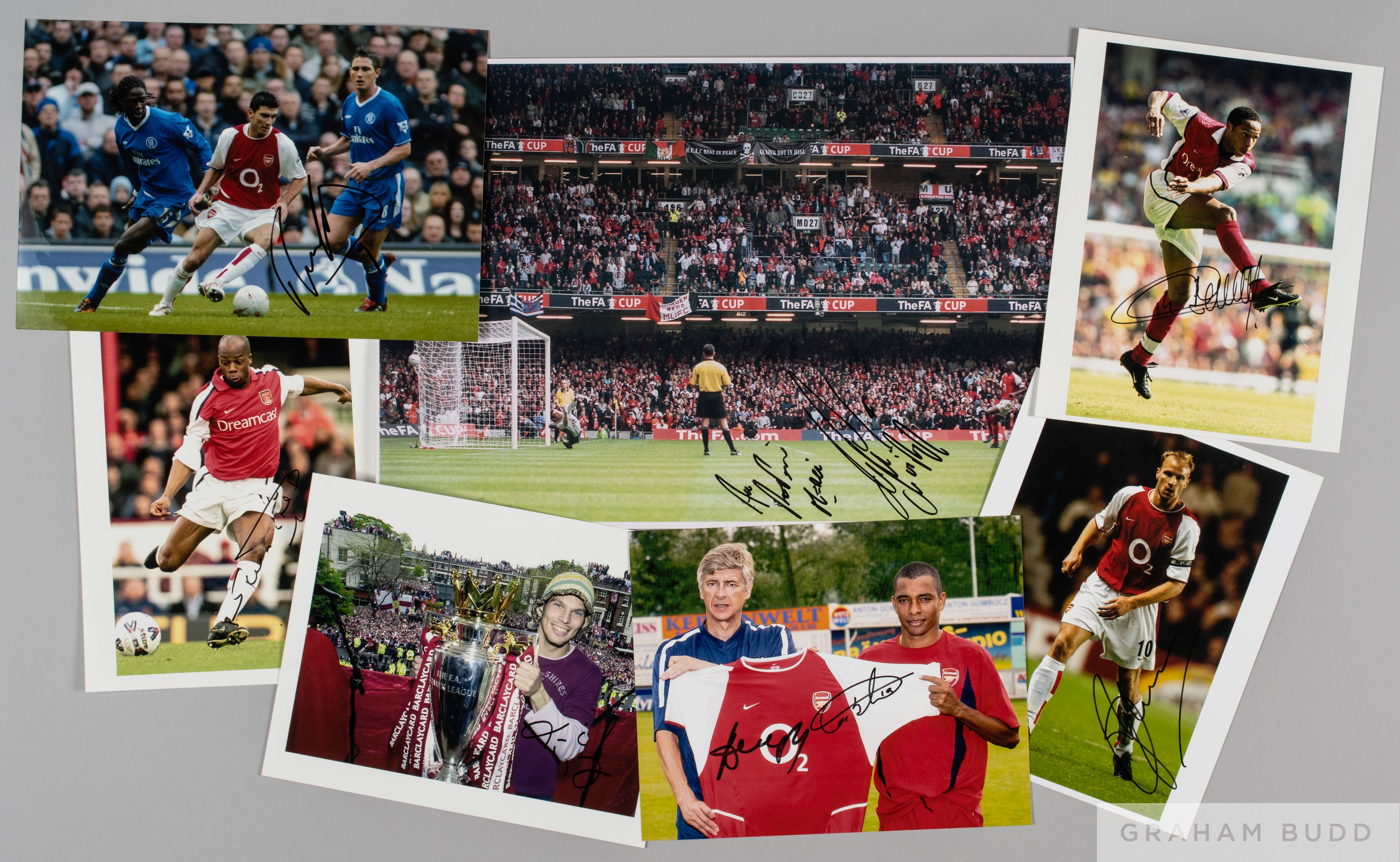 Arsenal Invincibles 2003-04 collection of twenty-five signatures on twenty-four photographs including Thierry Henry, Dennis Bergkamp. Sylvian Wiltord, Cesc Fabregas, Patrick Viera, Ashley Cole, etc. and large colour autographed photograph of Patrick Viera's last-ever kick for Arsenal to win F.A.Cup at the Millennium Stadium, autographed and inscribed "Au Revior Merci" 30 by 46cm., (24)