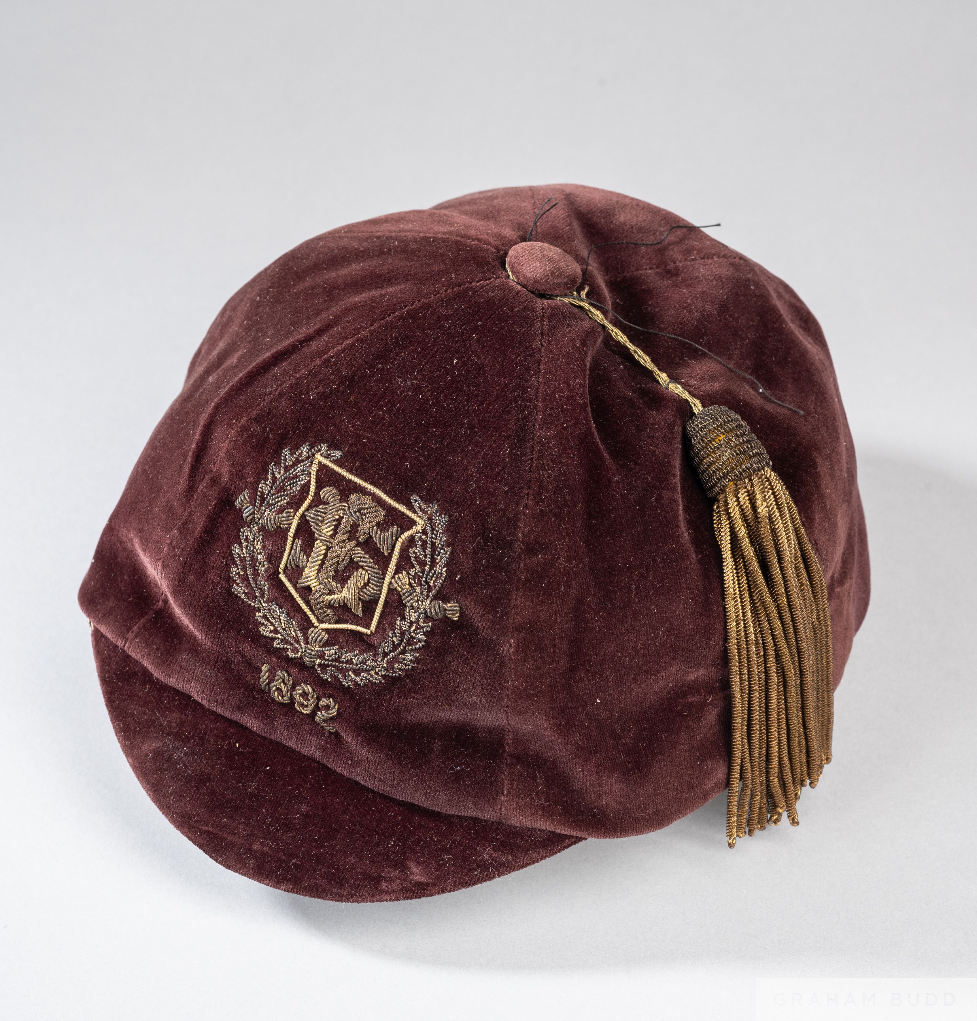 William Proudfoot's maroon Scottish League v. Scottish Alliance cap, 1892 with gilt embroidered tassel, SFL initials and 1892 The cap represents the first-ever home Inter-League match in 1892 In the match played at Cathkin Park on 2nd June Scottish League defeated Scottish Alliance 4-3