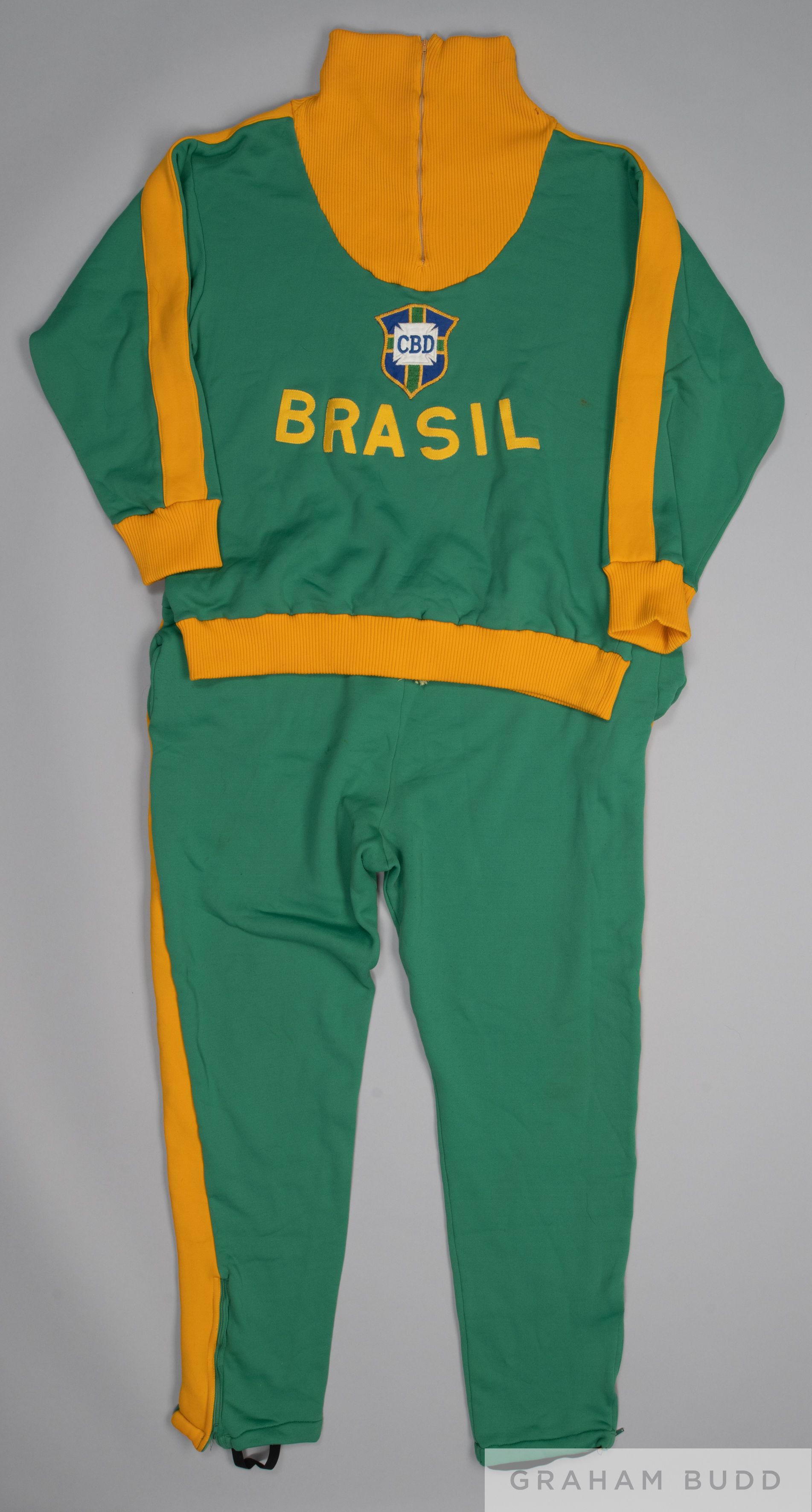 Pele yellow and green Brazil worn tracksuit, top and bottoms, mid-1960s, Umbro, G, with zip-up collar and embroidered cloth badge inscribed CBD and lettered BRASIL The above was worn by Pele between 1966-1969