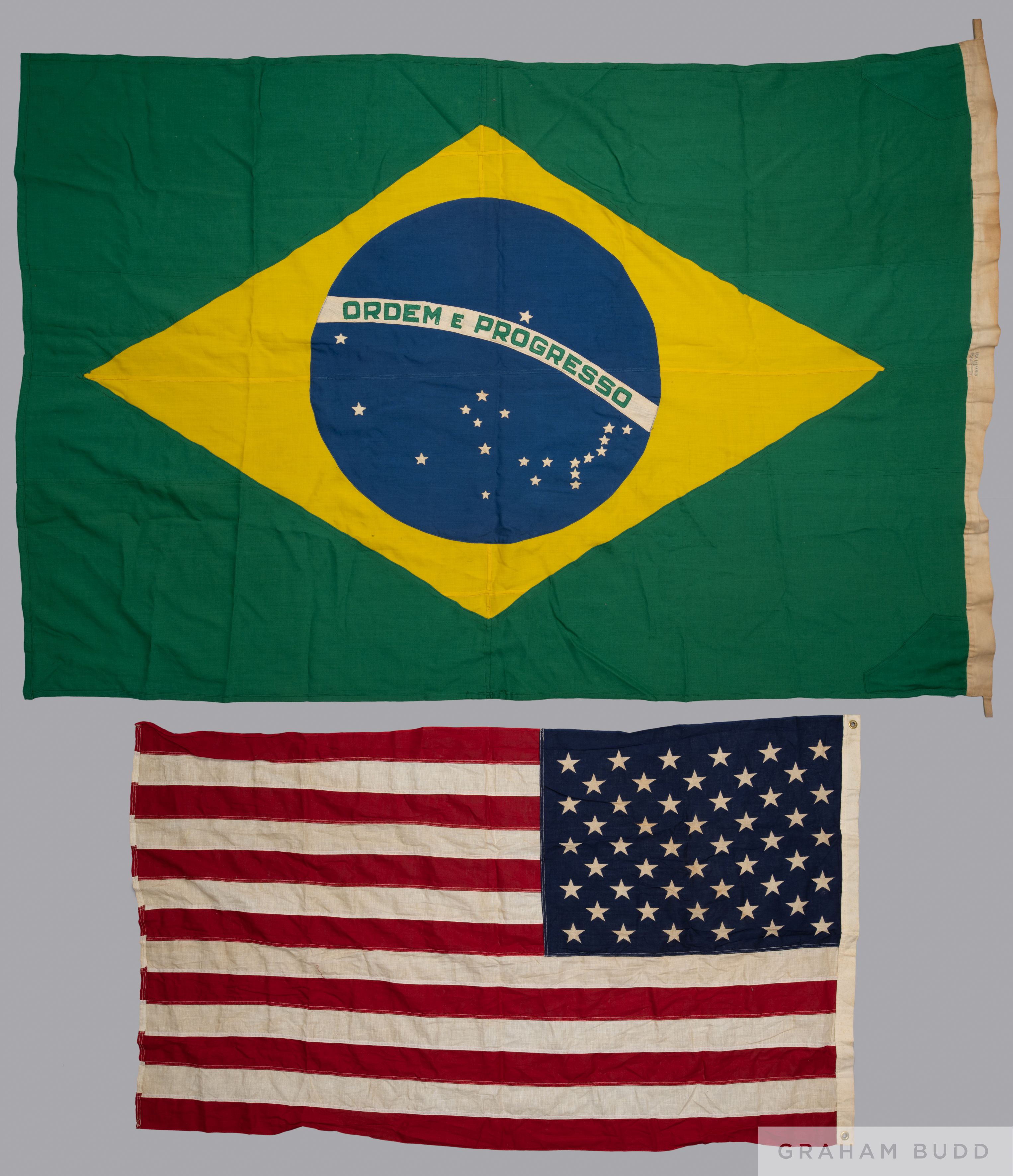 The Brazilian and American flags displayed on the occasion of Pele's first match for the New York Cosmos v Dallas Tornados at Downing Stadium, Randalls' Island, 15th June 1975, sold with a photocopy of a magazine picture showing Pele holding the US flag and the Tornados captain Kyle Rote Jr. holding the Brazilian flag in the centre circle before kick-off (3) Pele scored on his debut with a top-corner header as Cosmos drew the match 2-2. As part of his presentation the the American public these flags were displayed on the pitch before the game. Provenance: The Charles Martinelli Collection. Former Equipment Manager of the New York Cosmos.