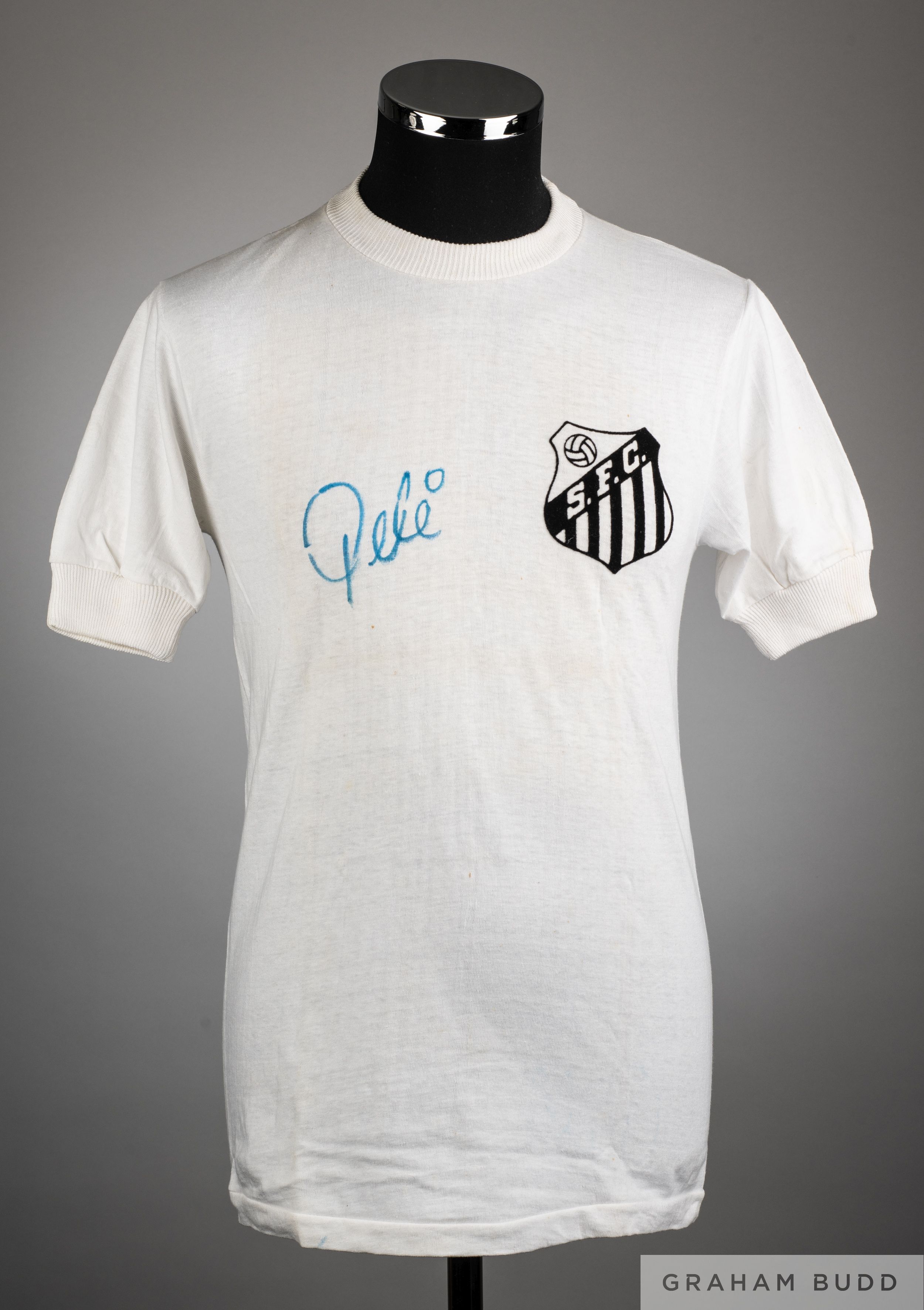 Pele white No.10 Santos short-sleeved shirt, Athleta, with crew-neck collar and felt badge inscribed S.F.C., the front of the shirt also autographed