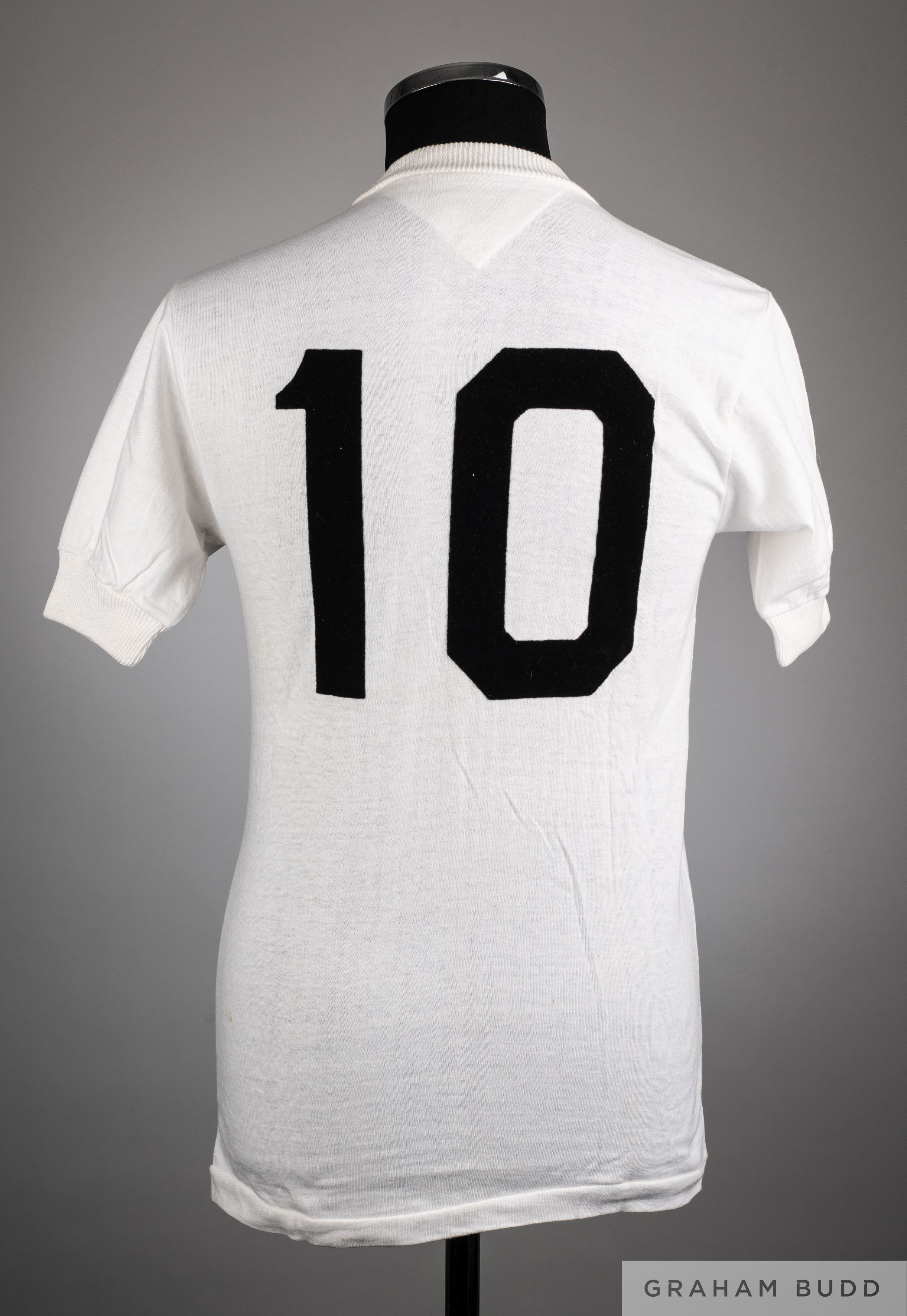 Pele white No.10 Santos short-sleeved shirt, Athleta, with crew-neck collar and felt badge inscribed S.F.C., the front of the shirt also autographed by Pele, some discolouration to front and back The shirt was given to the vendor father by Pele a number of years ago