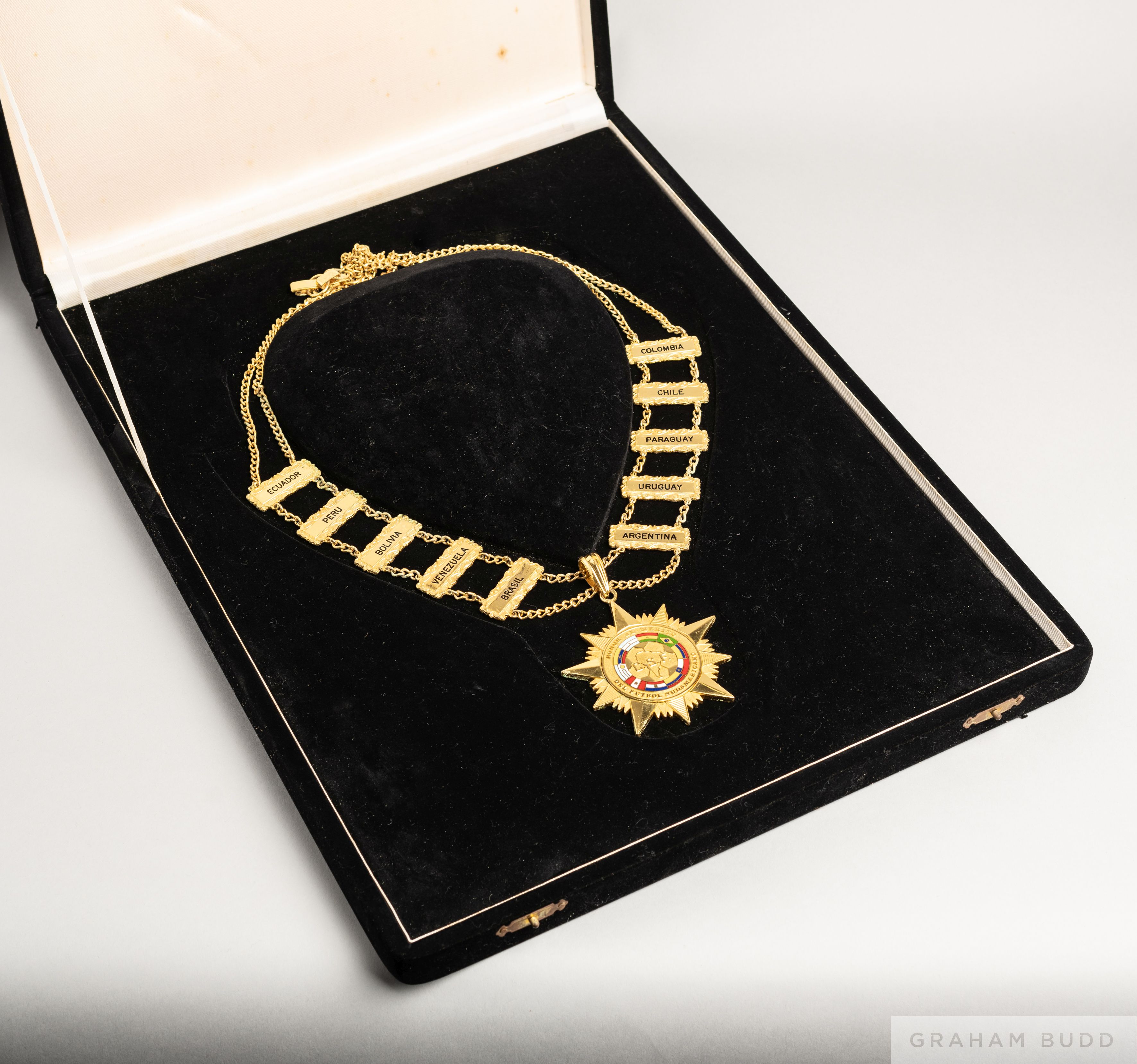 Ex-Pelé Collection: Conmebol Order of Merit of South American football bestowed to Pelé, the order and chain in gilt and enamel, stamped Milled, Chile, with ten-point star and national flags of the ten member nations of Conmebol (South American Confederation of Football or CSF), inscribed “Honor Al Merito del Futbol Sudamericano”, the elaborate gilt collar chain fitted with bars enamelled with the names of the ten CSF members, Ecuador, Peru, Bolivia, Venezuela, Brazil, Colombia, Chile, Paraguay, Uruguay and Argentina, the order measuring 80 by 80mm., overall length including chain 53.5cm., issued in a black velvet case measuring 45 by 35 by 4.5cm., areas of verdigris to gold toning, some surface scratching, overall good Provenance: The Pelé Collection. Julien’s Auctions, London, 7th to 9th June 2016, as lot 1373.