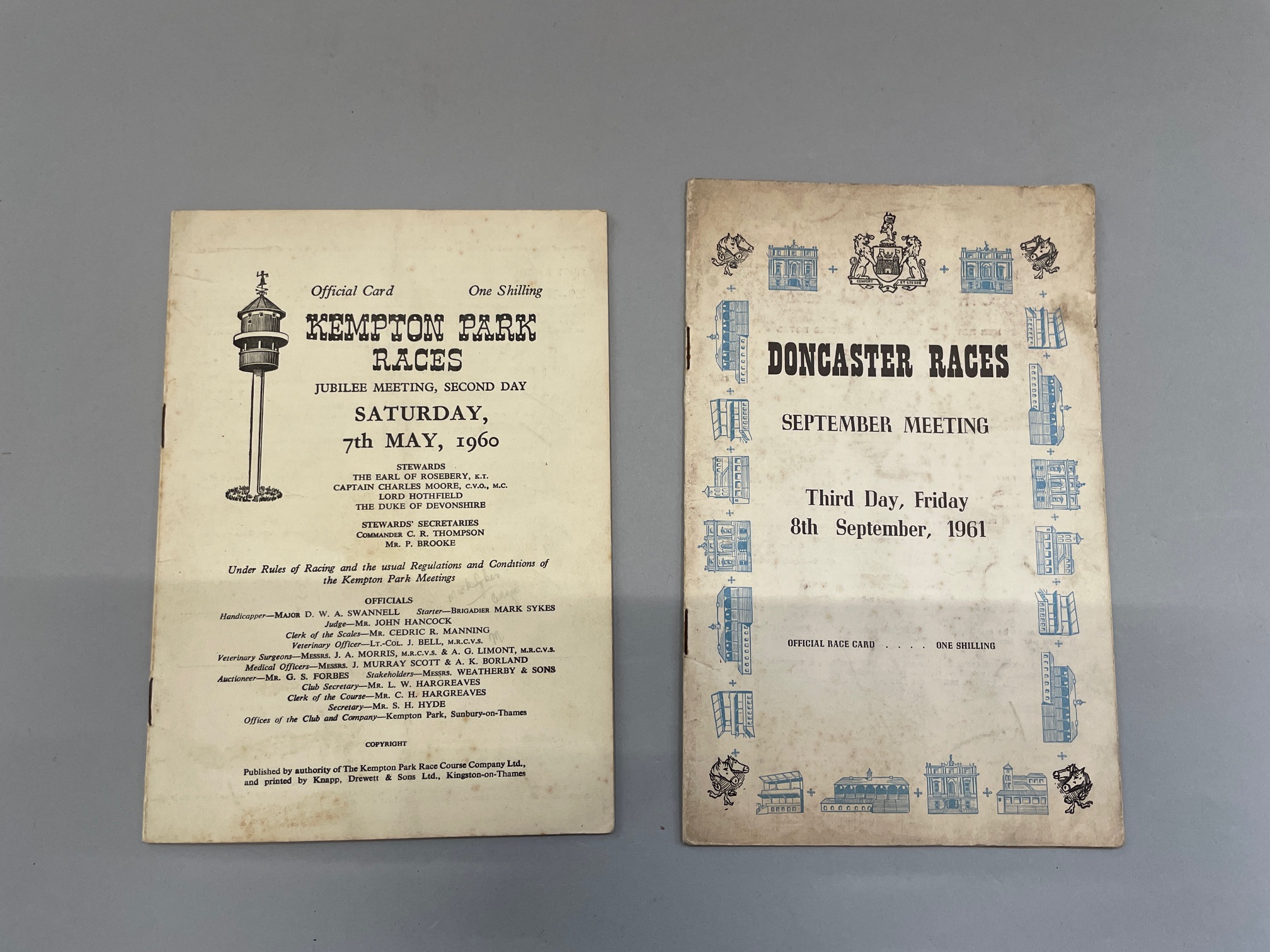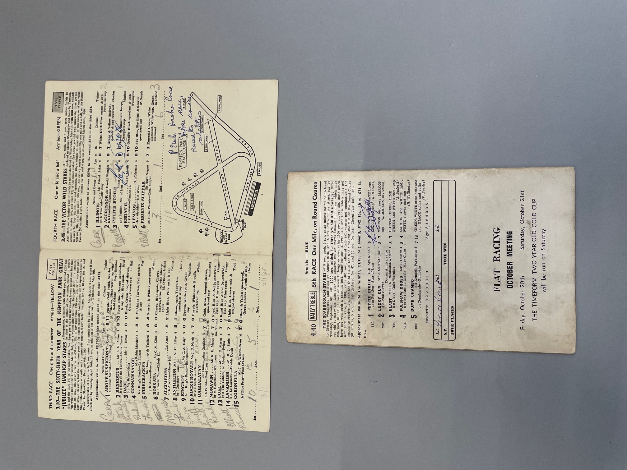 Two racecards signed by Lester Piggott and featuring Prince Aly Khan's outstanding filly Petite Etoile, both signed by Lester in blue ink over the race entry, the first for her victory at Kempton Park 7th May 1960 in the Victor Wild Stakes (tragically the filly's owner Prince Aly Khan died five days later in a Paris automobile accident); the second for her victory in the Scarborough Stakes at Doncaster 8th September 1961, the filly now in the ownership of HH Aga Khan, and being the penultimate start of her race career