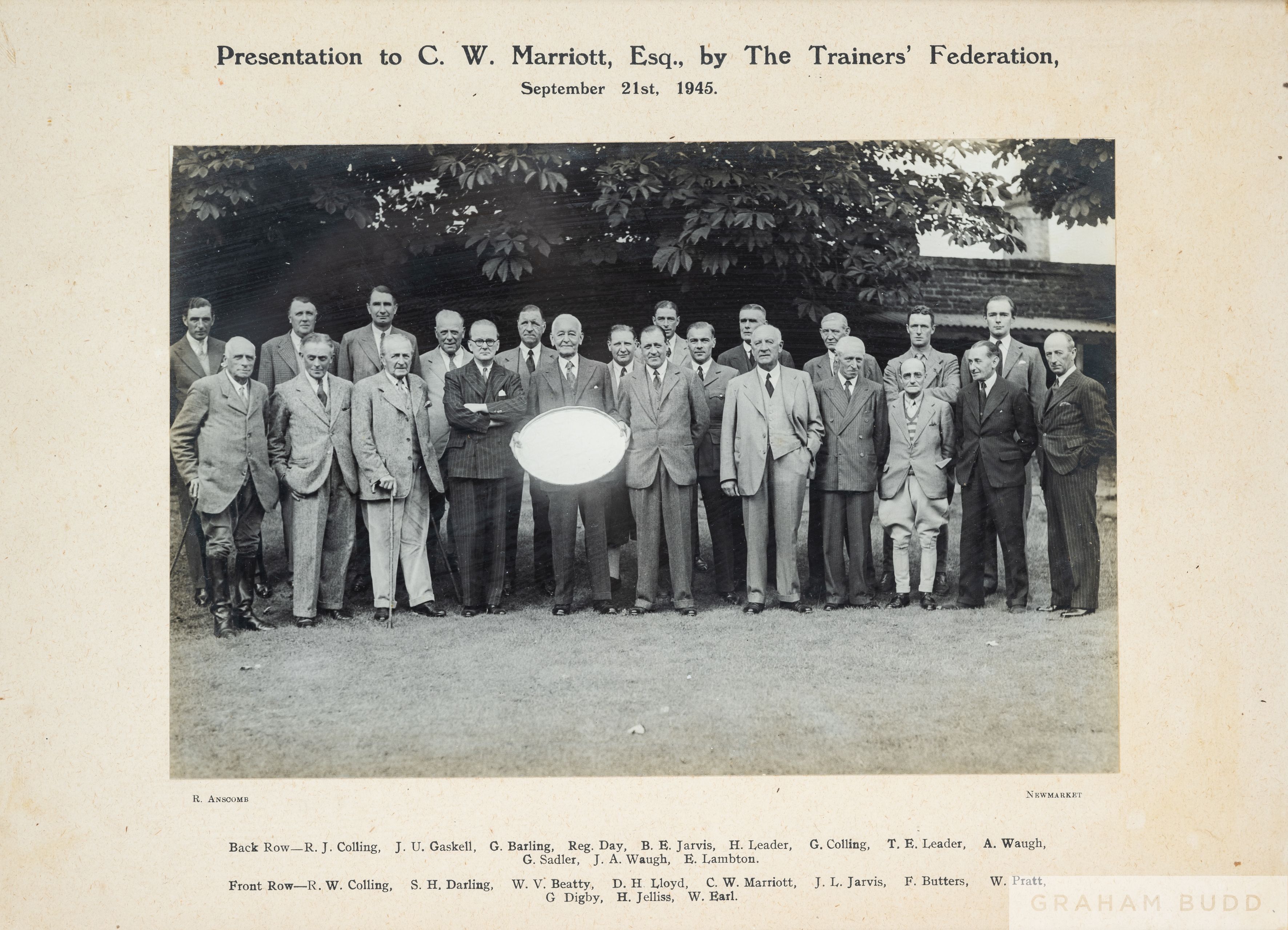 Racehorse Trainers' Federation photograph presented to C.W. Marriott 21st September 1945, by R Anscomb of Newmarket, 6 1/2 by 91/2 b&w, formal group, Mr Marriott seem holding a large silver tray presentation, printed legend identifying the gathering, Back Row - R.J. Colling, J.U. Gaskell, G. Barling, Reg. Day, B.E. Jarvis, H. Leader, G. Colling, T.E. Leader, A. Waugh, G. Sadler, J.A. Waugh, E. Lambton; Front Row - R.W. Colling, S.H. Darling, W.V. Beatty, D.H. Lloyd, C.W. Marriott, J.L. Jarvis, F. Butters, W. Pratt, G. Digby, H. Jelliss, W. Earl, framed & glazed, 27 by 37cm. Lots 272 to 294 From the Collection of the Newmarket trainer George Scott Colling (1904-1959); and the Collection of Mrs Marion Glenister, owner of Nimbus, the 1949 Derby & 2,000 Guineas winner, being material subsequently acquired at Graham Budd Auctions. George Colling was the son of R W Colling and brother to Jack, a famous racing dynasty in the history of the turf.