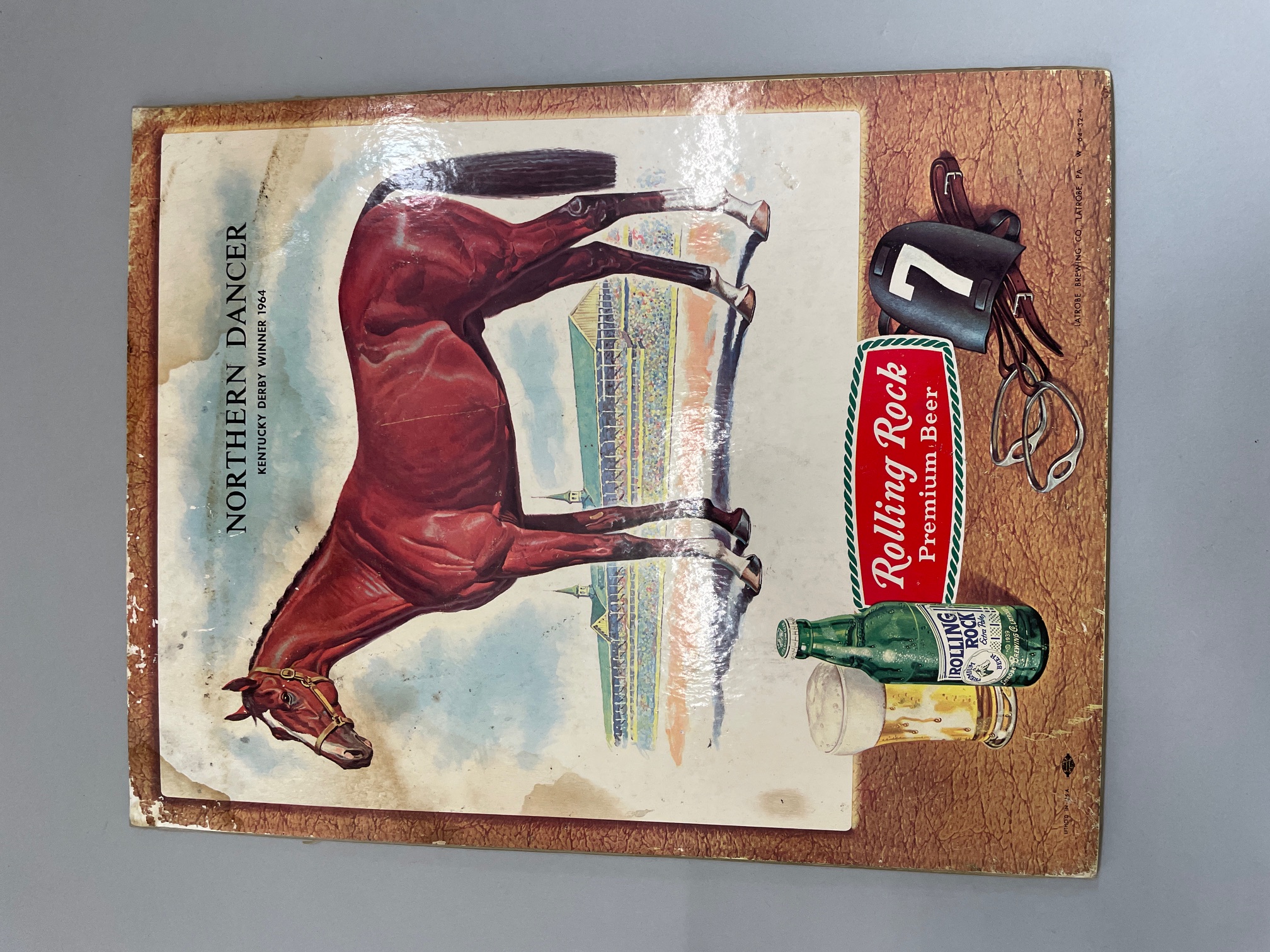 Rolling Rock Premium Beer counter-top advertisement featuring Northern Dancer the 1964 Kentucky Derby winner, colour lithograph laid down on board, e