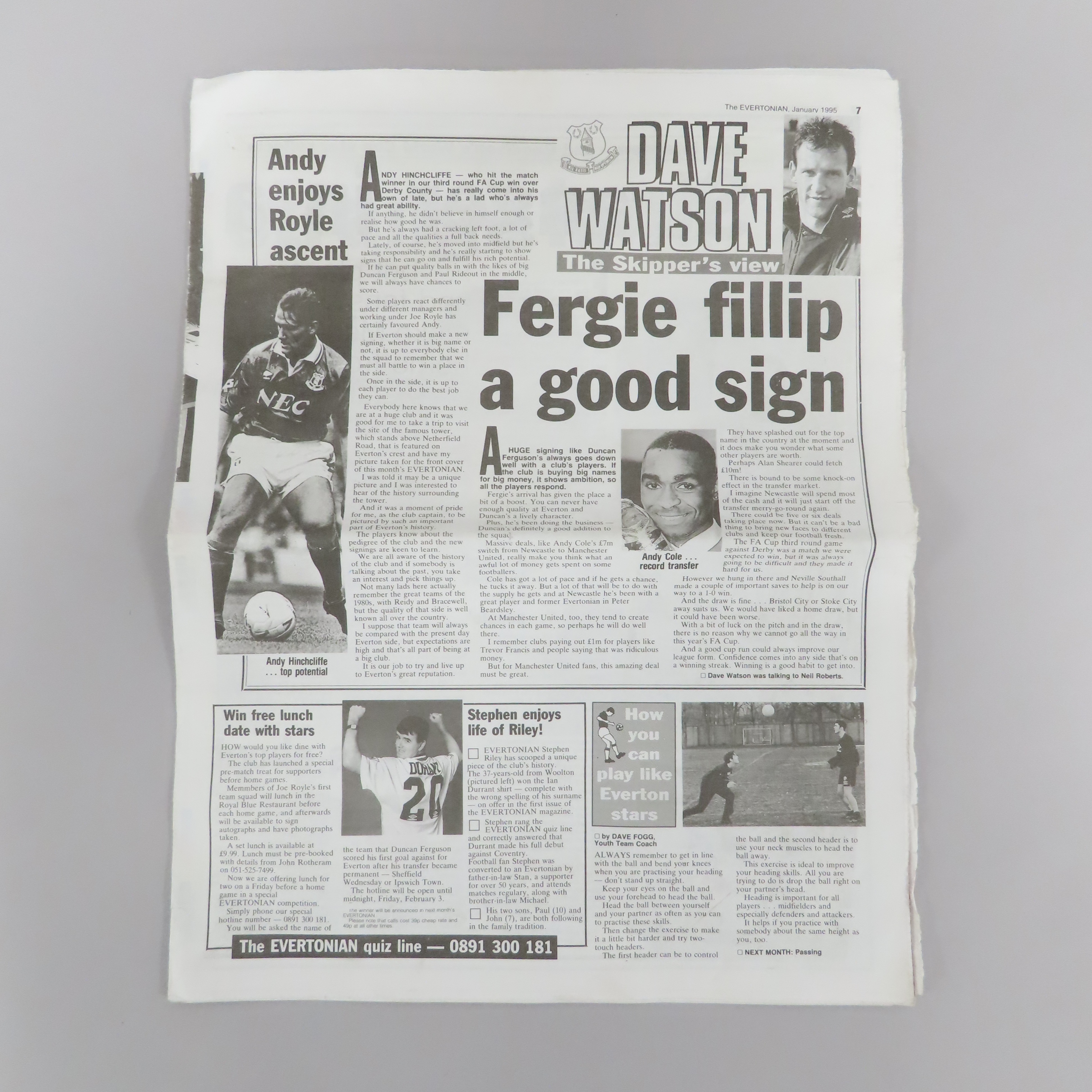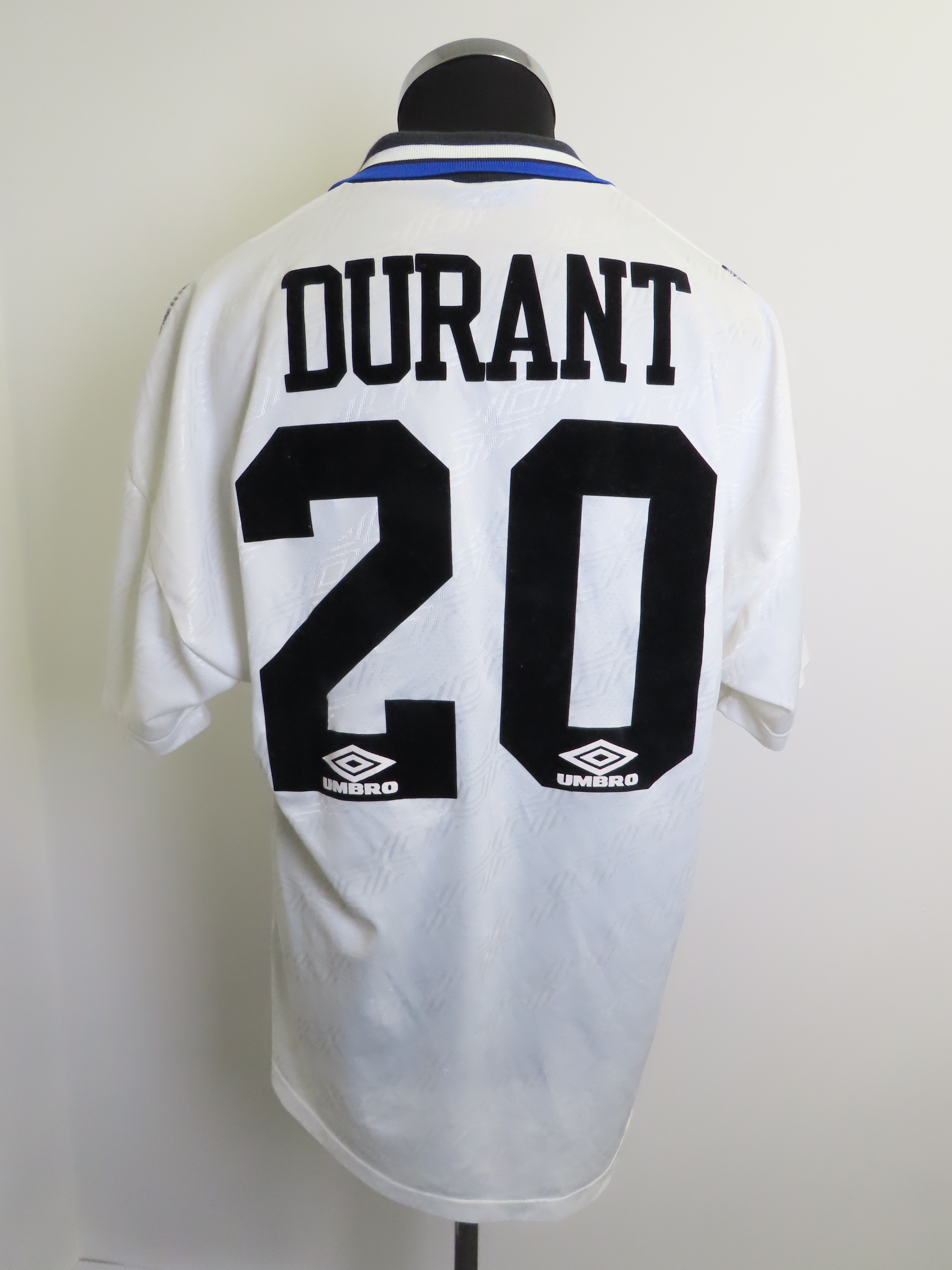 Ian Durrant white and blue No.20 Everton match worn short-sleeved shirt, 1994-95, Umbro, XL with button-up collar and embroidered cloth badge, the reverse lettered DURANT, the sleeves with The F.A.Premier League flashes The above shirt was worn by Ian Durrant and was won by the vendor in an Evertonian magazine competition win Ian's shirt complete with wrong spelling of his surname