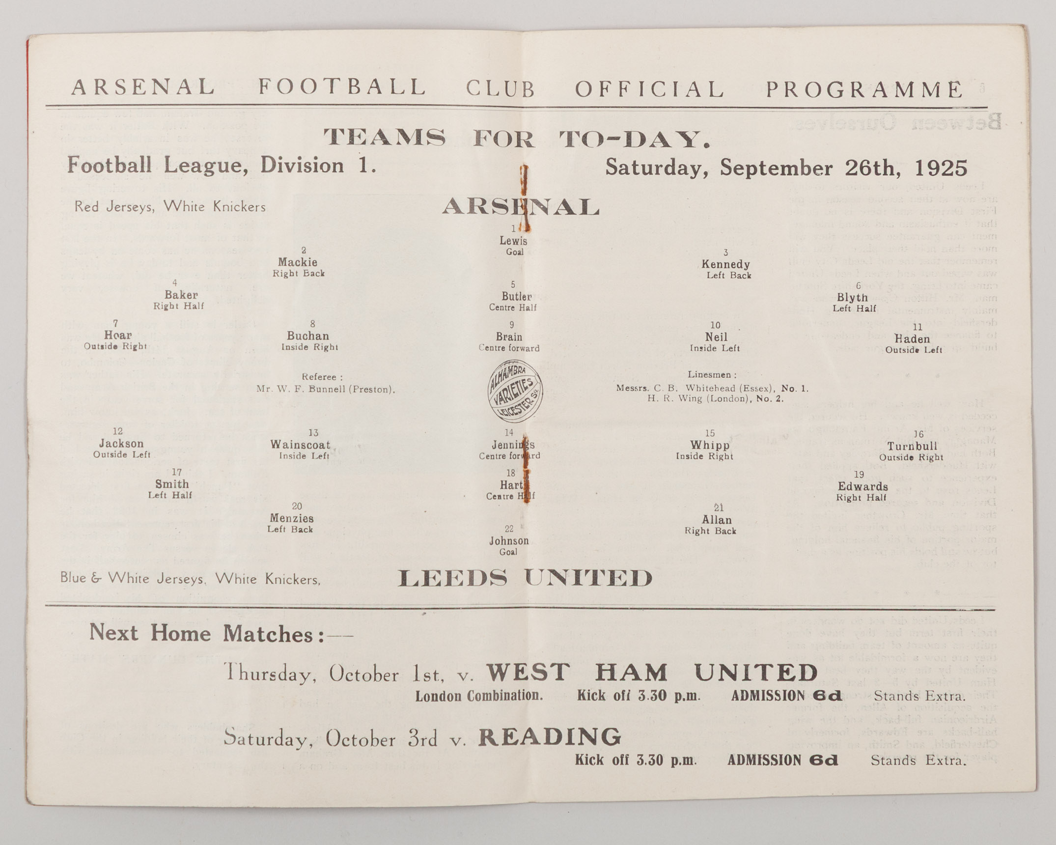 Arsenal v. Leeds United match programme, 26th September 1925, folds, rust staples