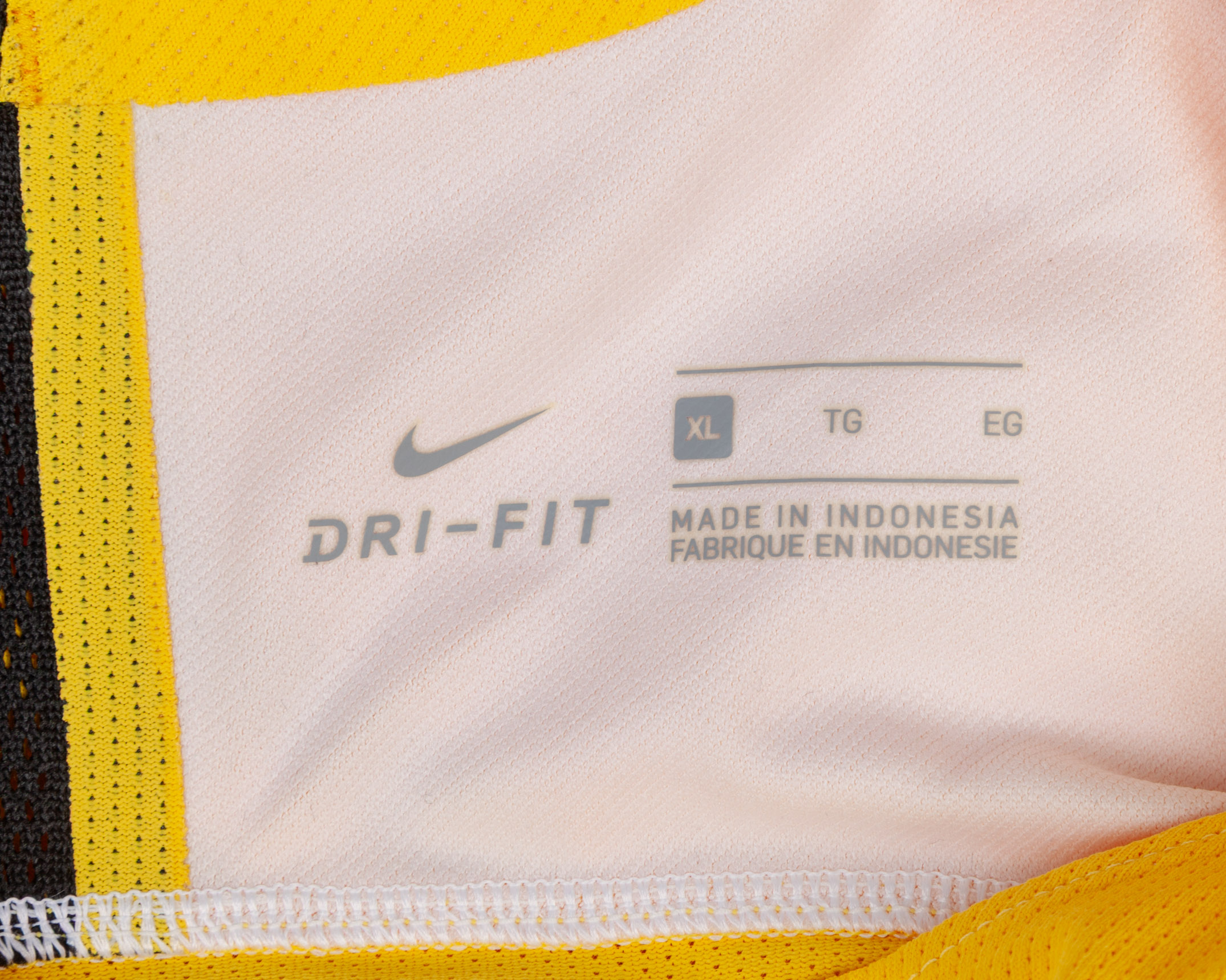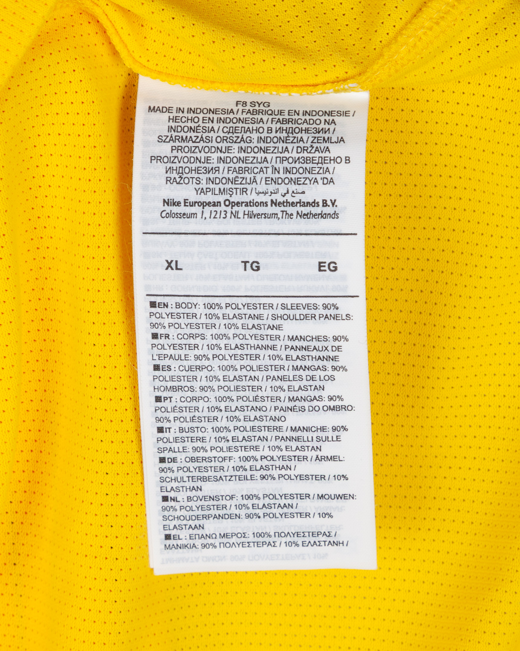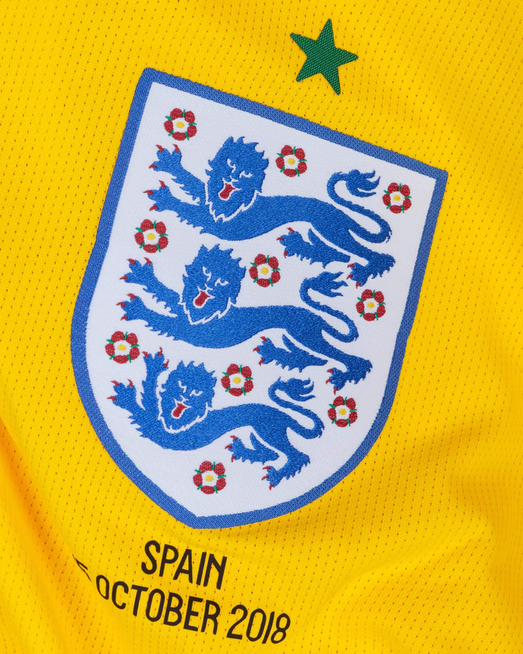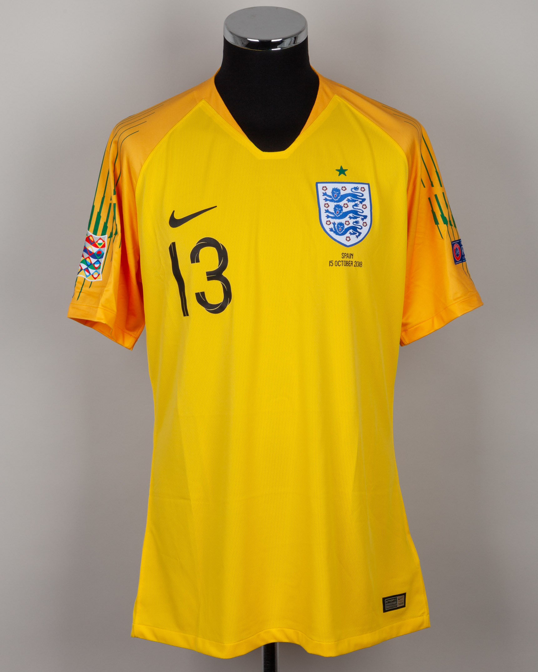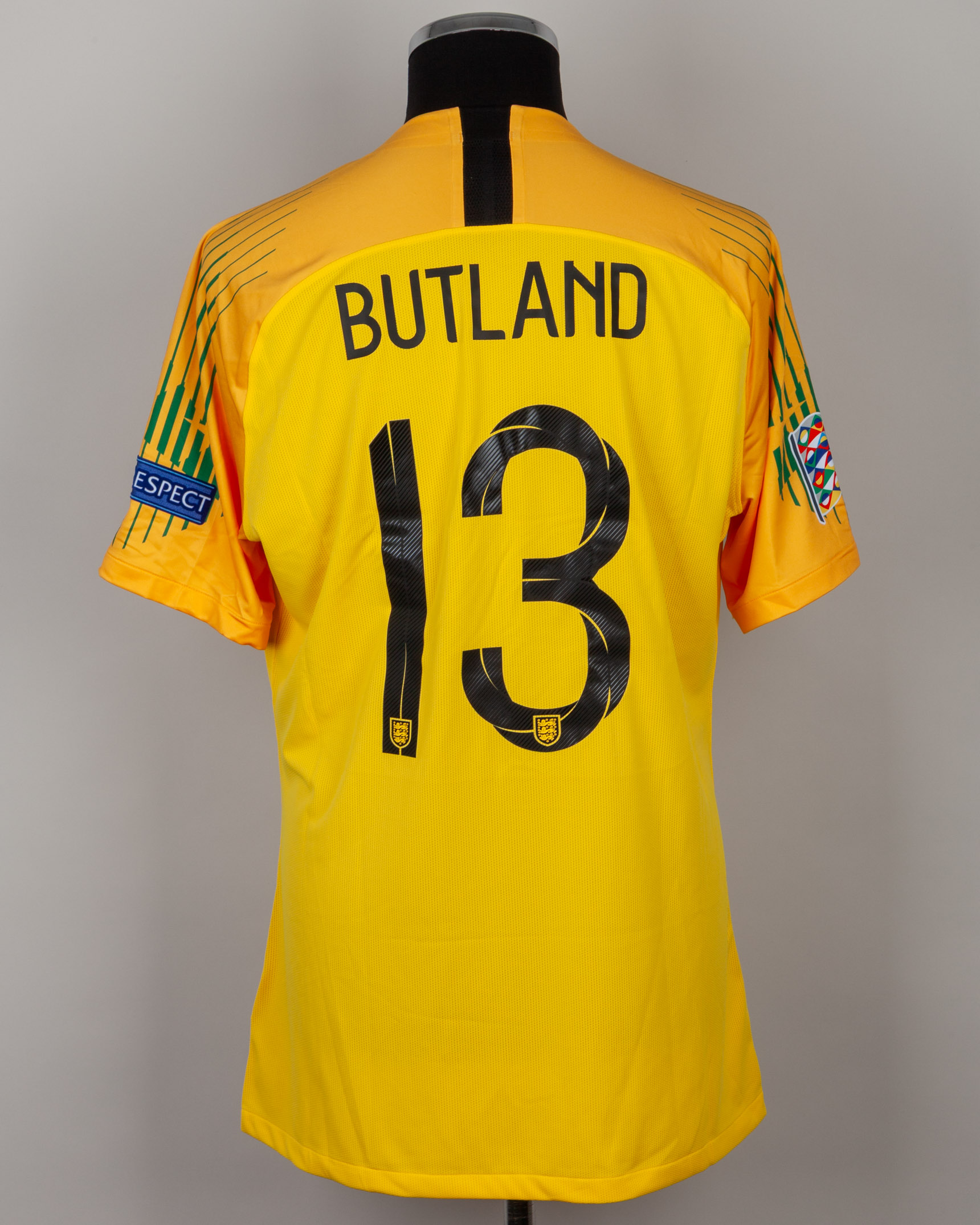 Jack Butland yellow and green No.13 England v. Spain short-sleeved shirt, 2018, Nike, XL, with v-neck collar and printed badge, with SPAIN 15 OCTOBER 2018 decal, the reverse lettered BUTLAND, the right sleeve with Nations League flash and the left sleeve with respect flash