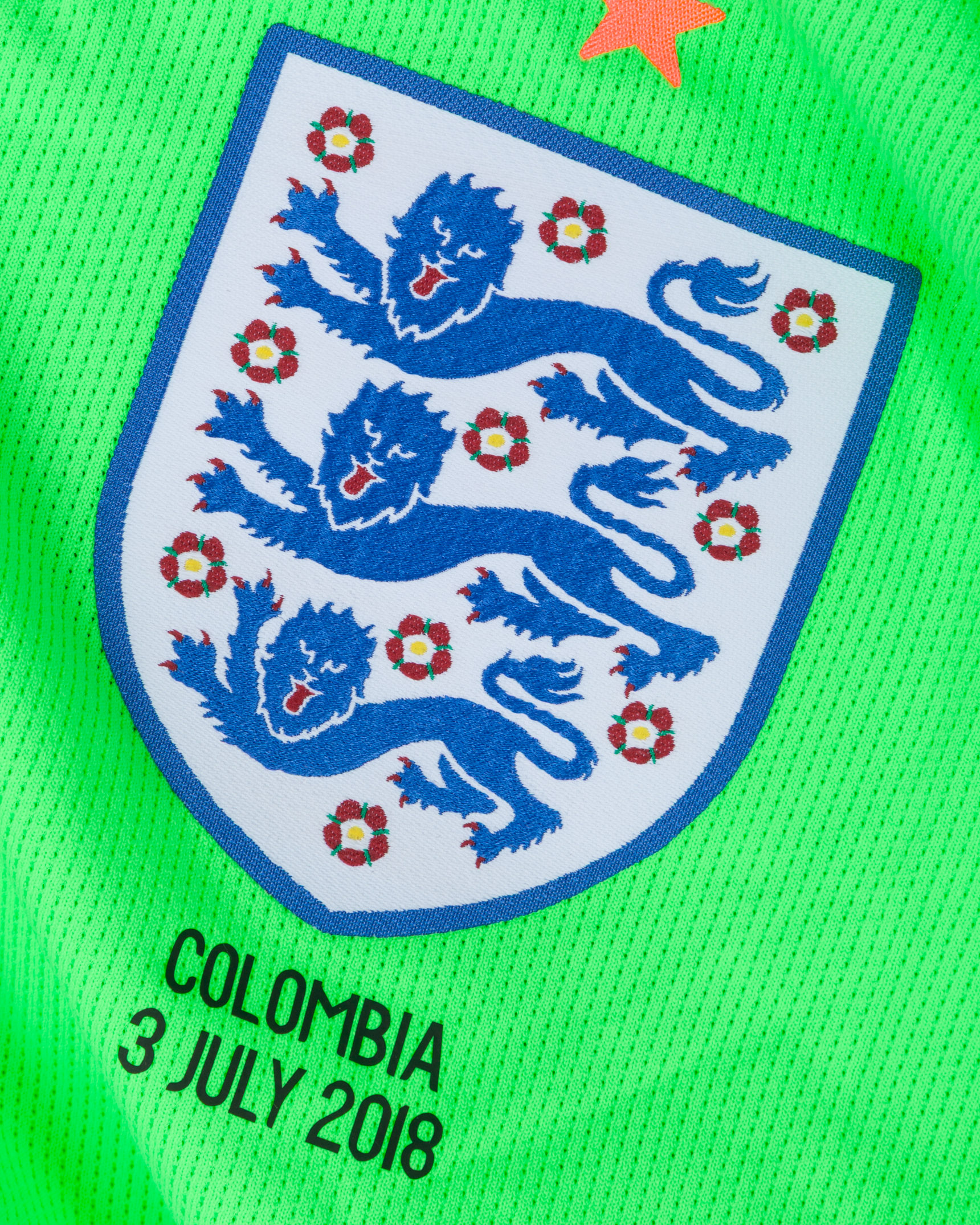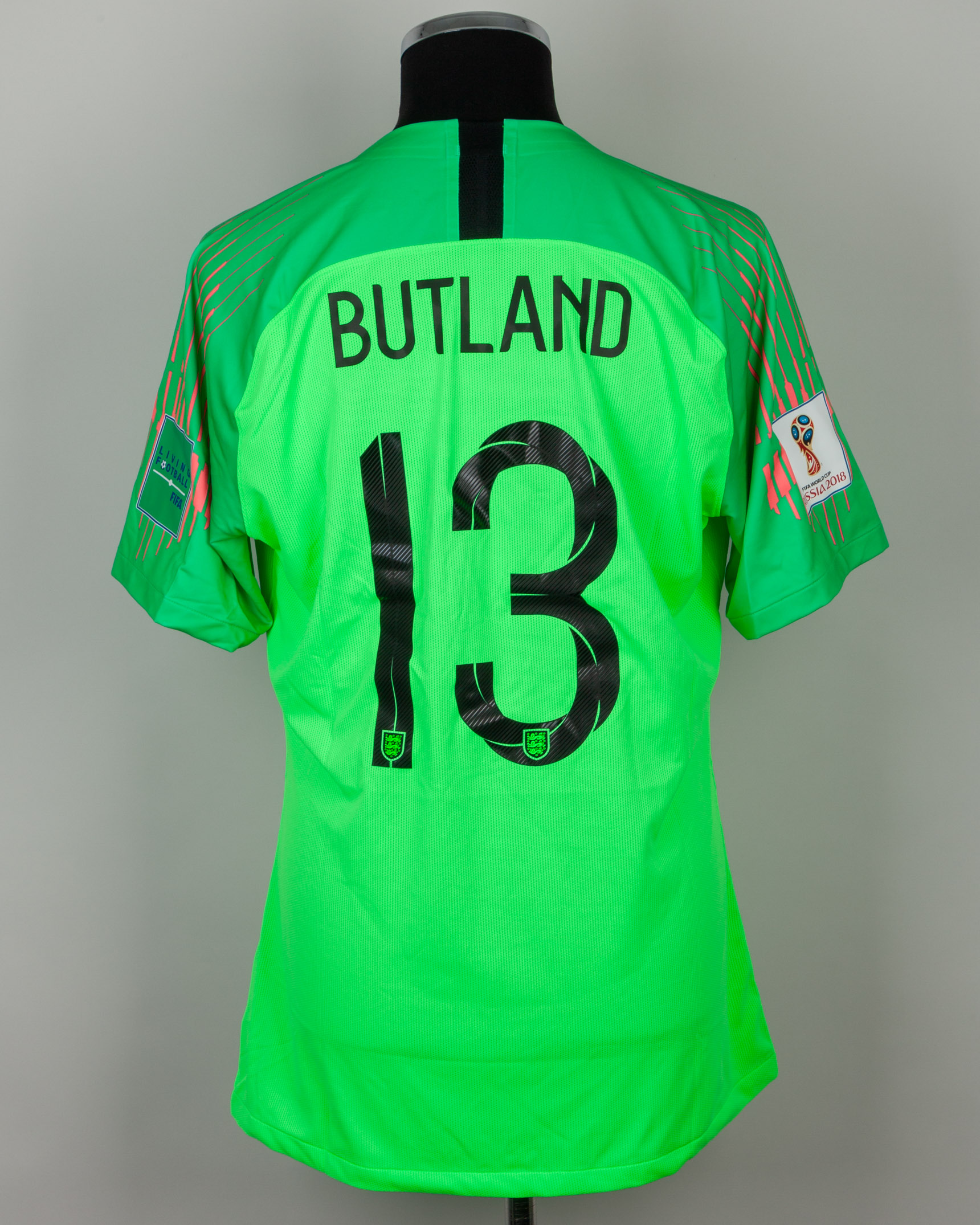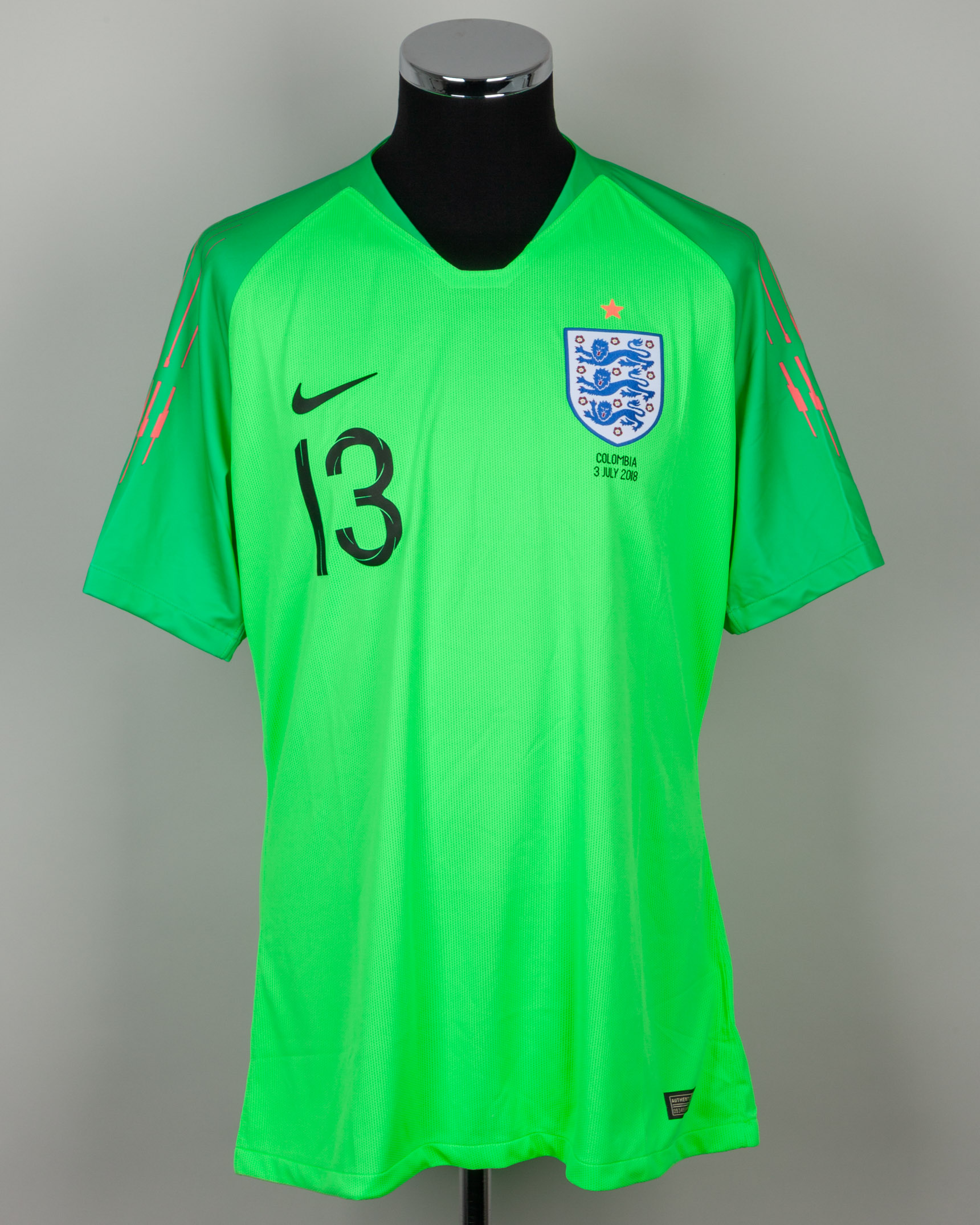 Jack Butland green and pink No.13 England v. Colombia short-sleeved shirt, 2018, Nike, XL, with v-neck collar and printed badge, with COLOMBIA 3 JULY 2018 decal, the reverse lettered BUTLAND, the right sleeve with FIFA World Cup Russia 2018 flash and the left sleeve with living football flash