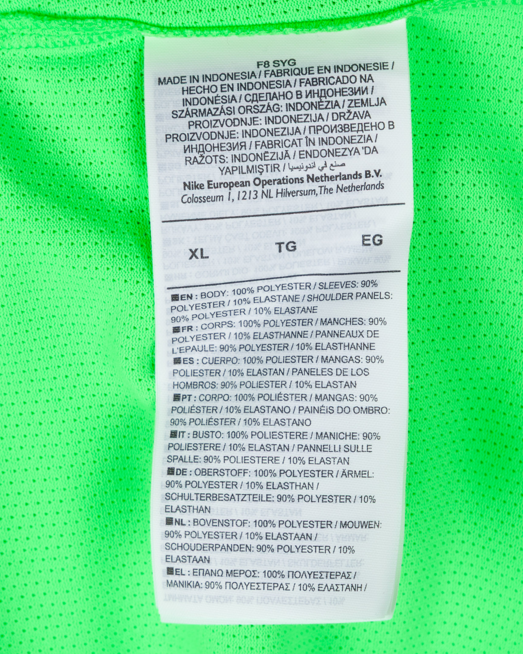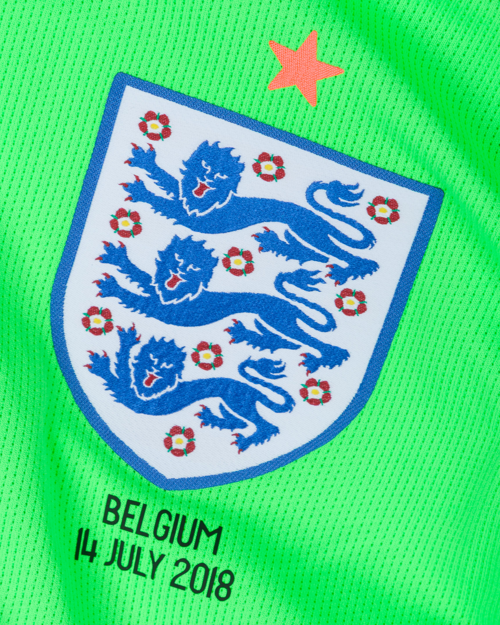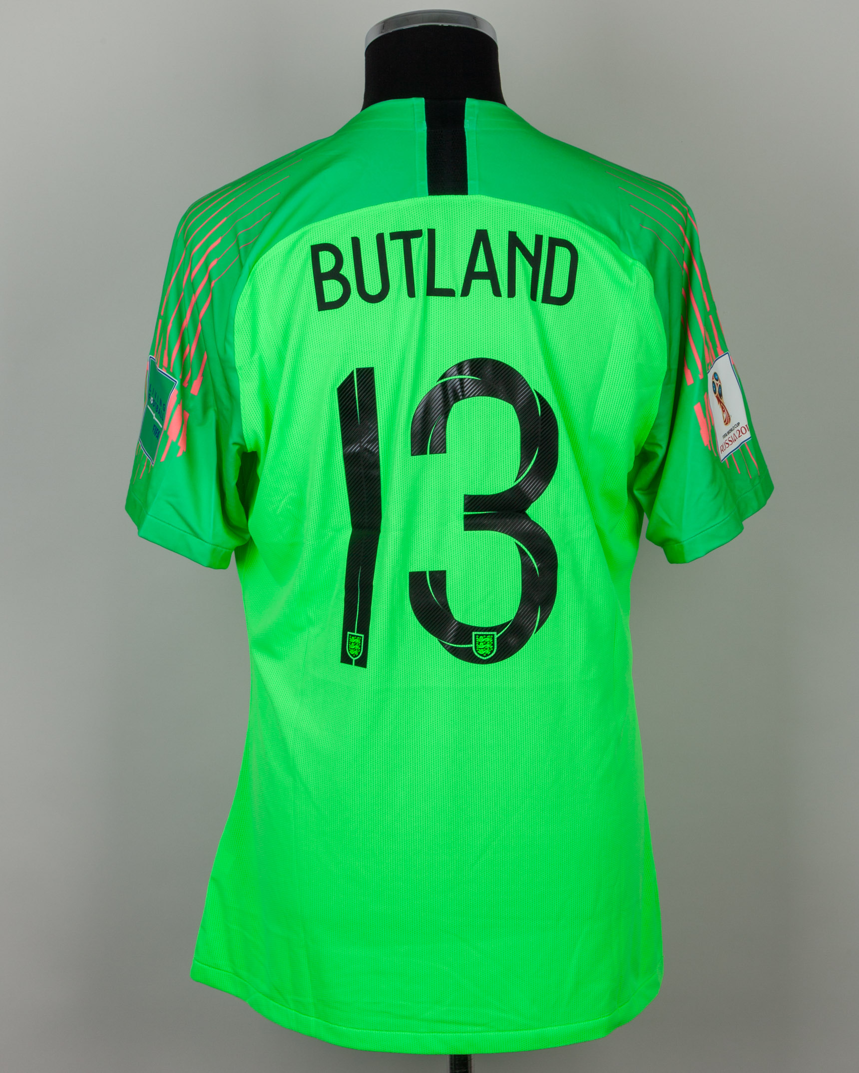 Jack Butland green and pink No.13 England v. Belgium short-sleeved shirt, 2018, Nike, XL, with v-neck collar and printed badge, with BELGIUM 14 JULY 2018 decal, the reverse lettered BUTLAND, the right sleeve with FIFA World Cup Russia 2018 flash and the left sleeve with living football flash
