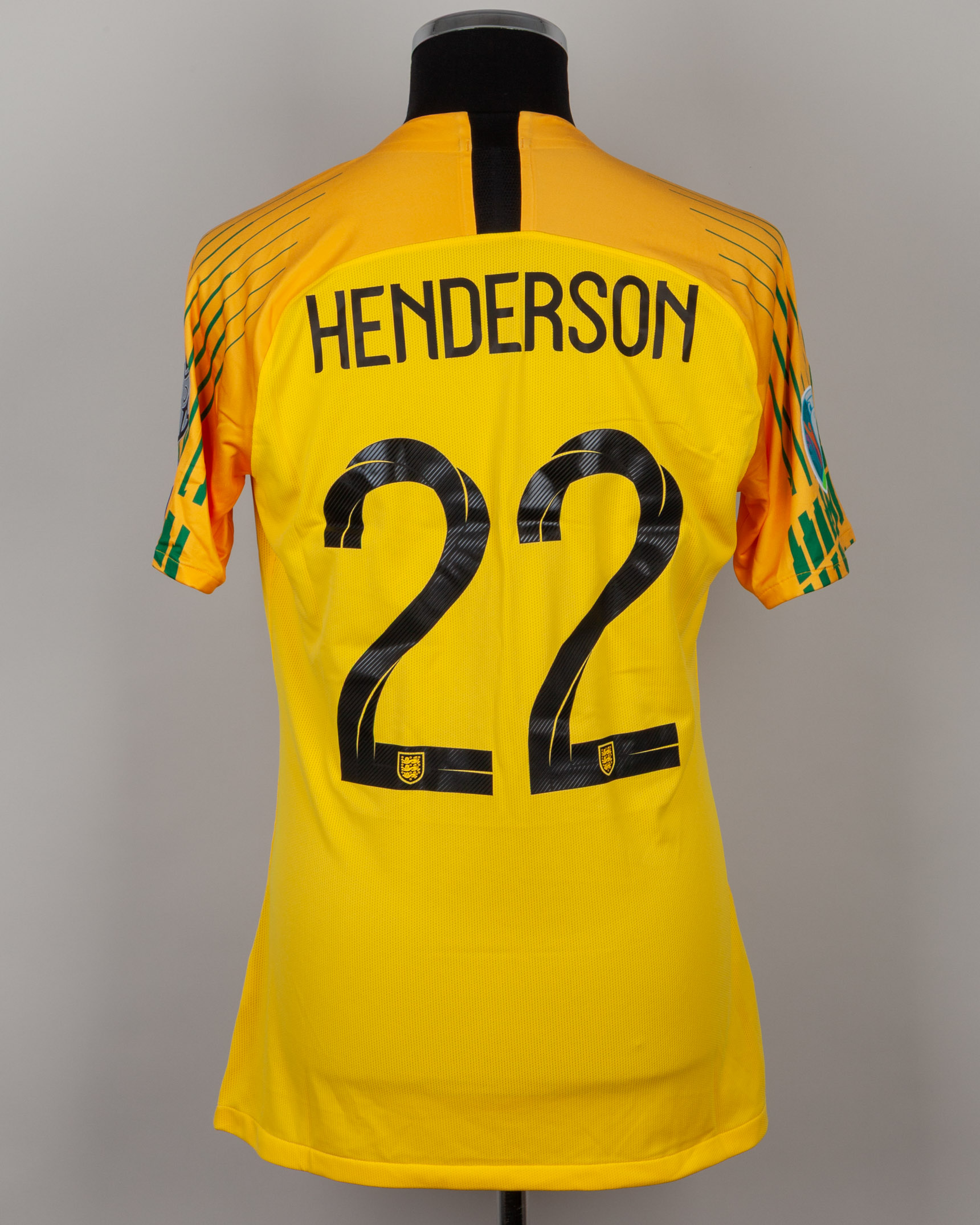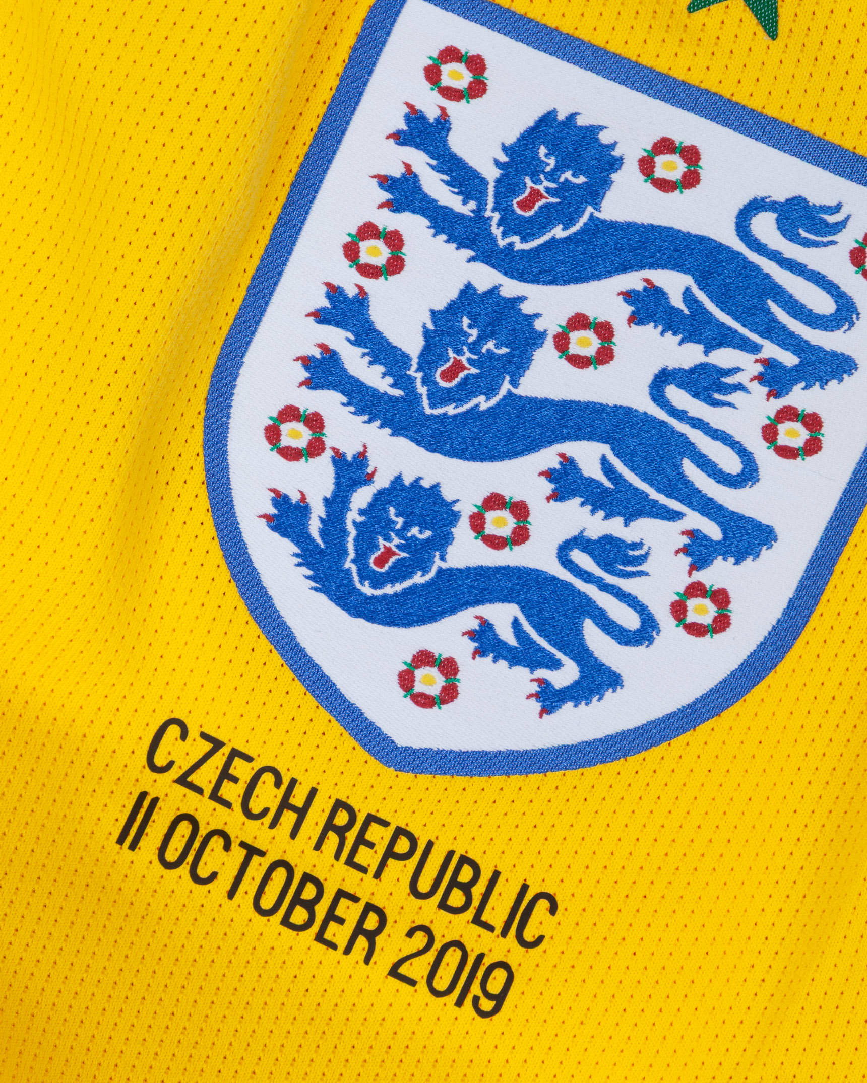 Dean Henderson yellow and green No.22 England v. Czech Republic short-sleeved shirt, 2019, Nike, L, with v-neck collar and printed badge, with CZECH REPUBLIC 11 OCTOBER 2019 decal, the reverse lettered HENDERSON, the right sleeve with Euro 2020 flash and the left sleeve with respect flash