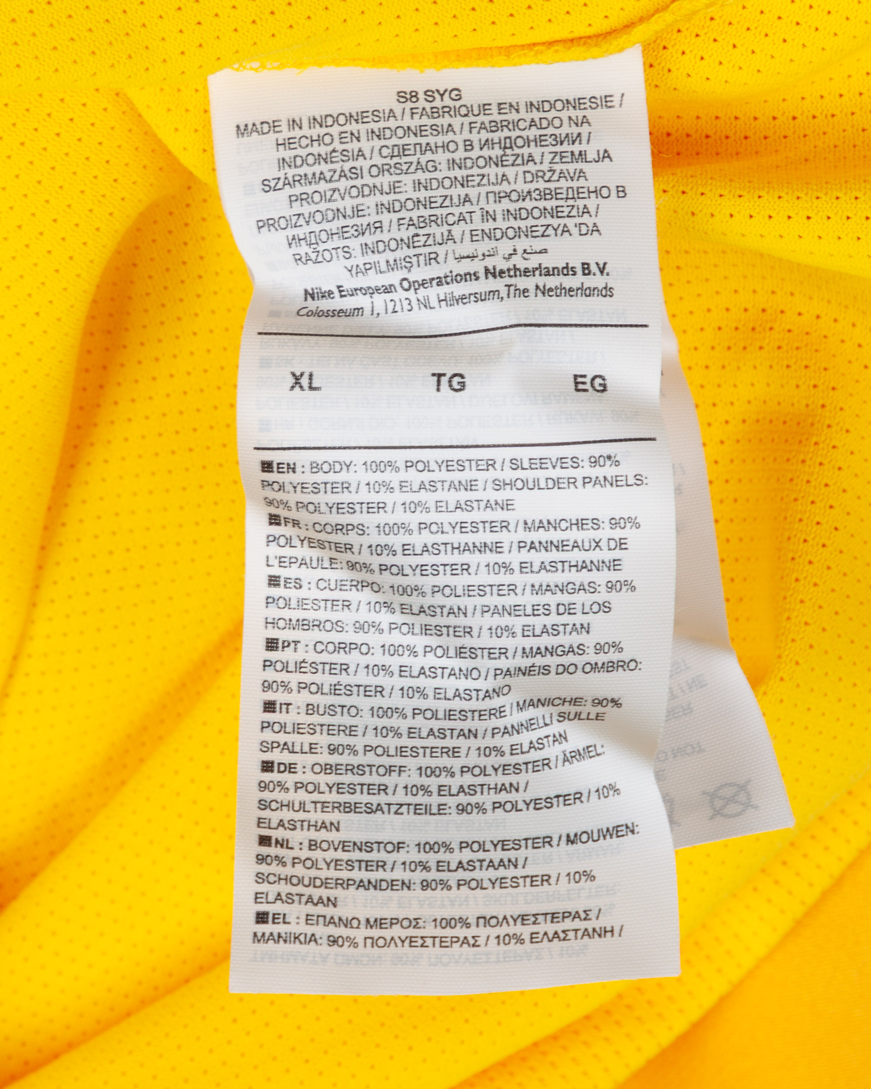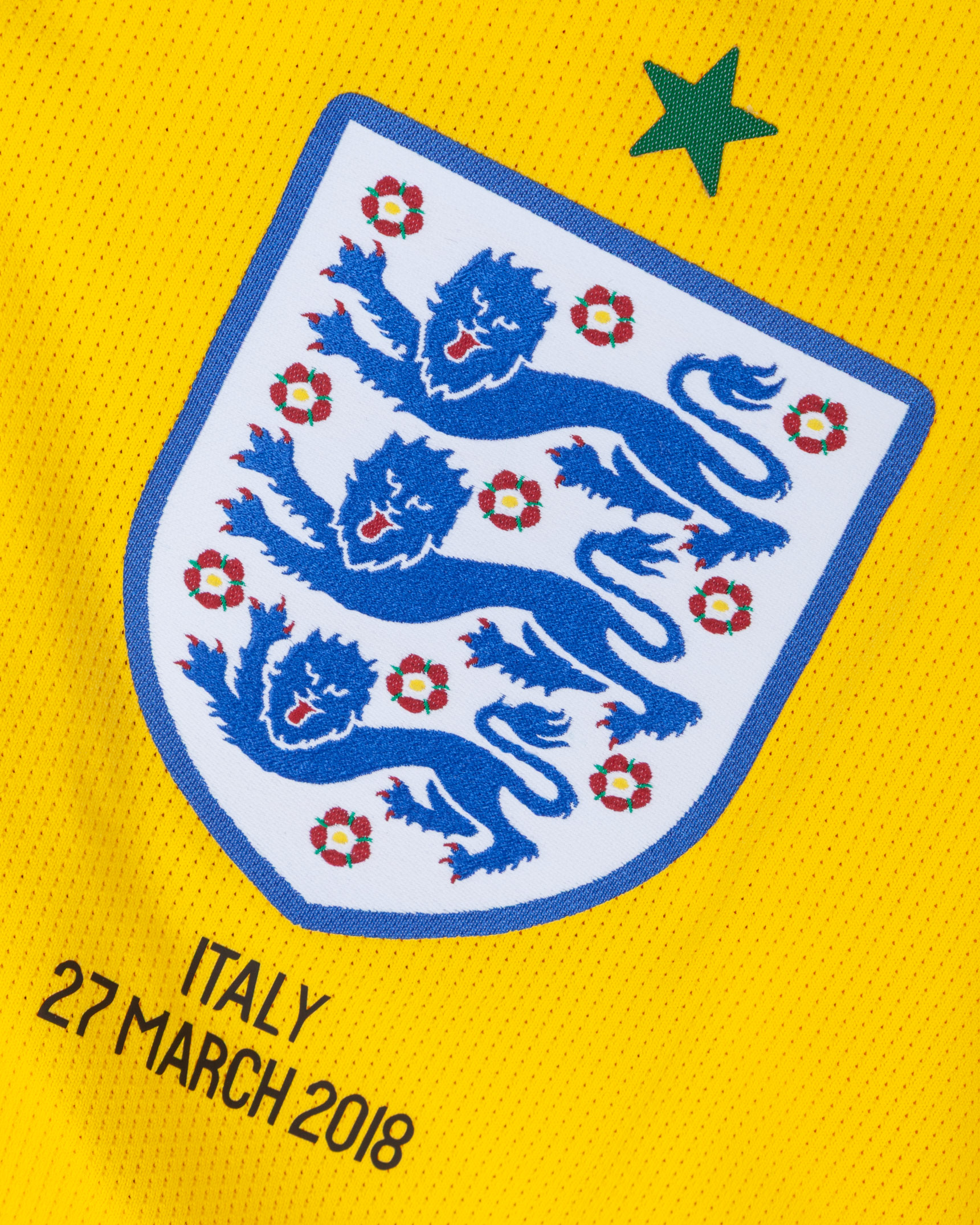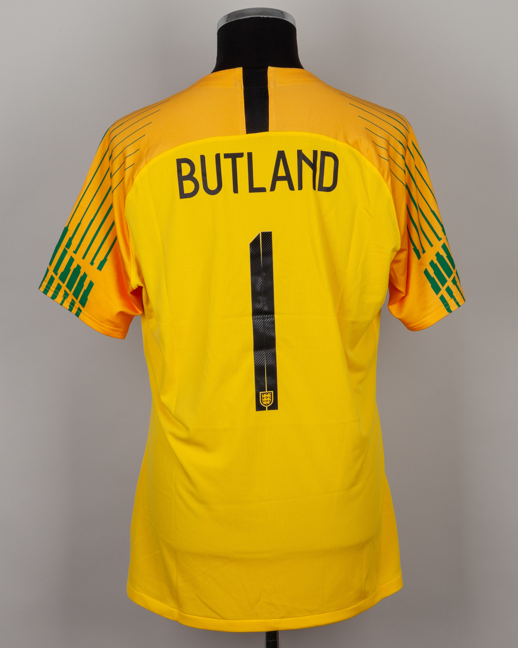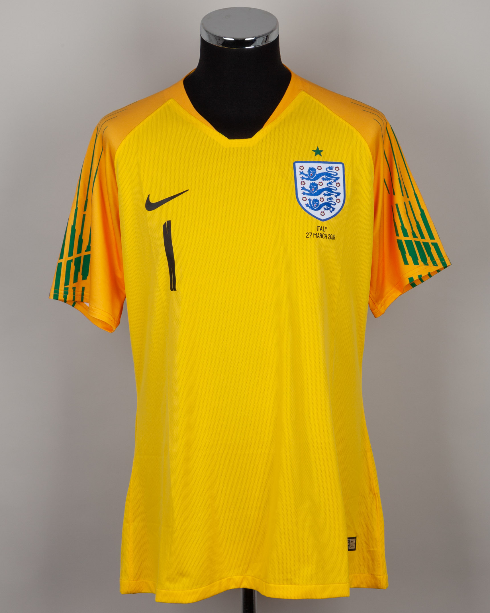 Jack Butland yellow and green No.1 England v. Italy short-sleeved shirt, 2018, Nike, XL, with v-neck collar and printed badge, with ITALY 27 MARCH 2018 decal, the reverse lettered BUTLAND