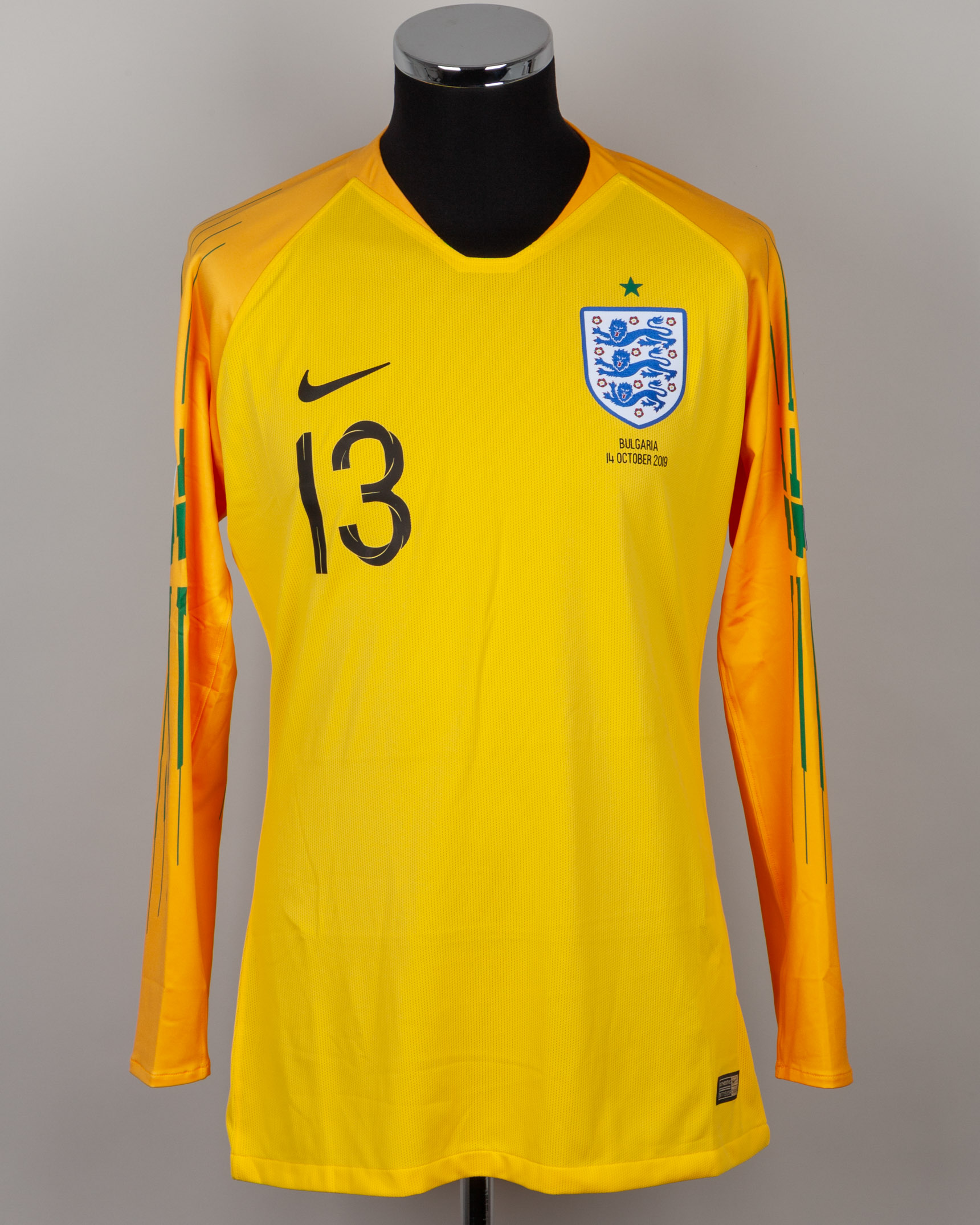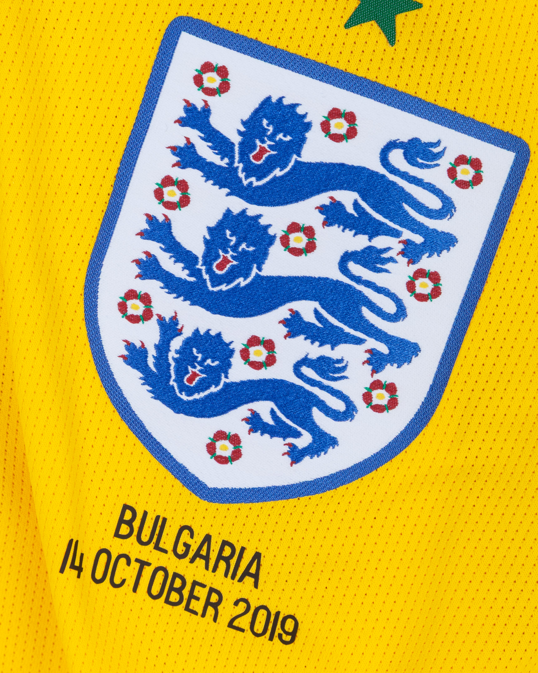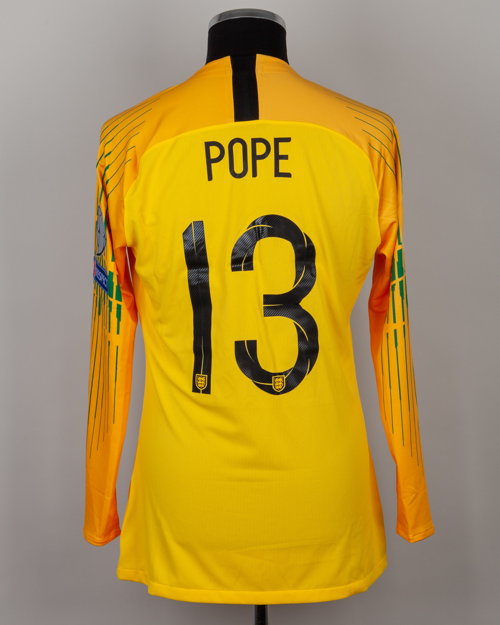 Nick Pope yellow and green No.13 England v. Bulgaria keeper shirt, 2019, Nike, L, with v-neck collar and printed badge, with BULGARIA 14 OCTOBER 2019 decal, the reverse lettered POPE, the right sleeve with Euro 2020 flash and the left sleeve with respect flash