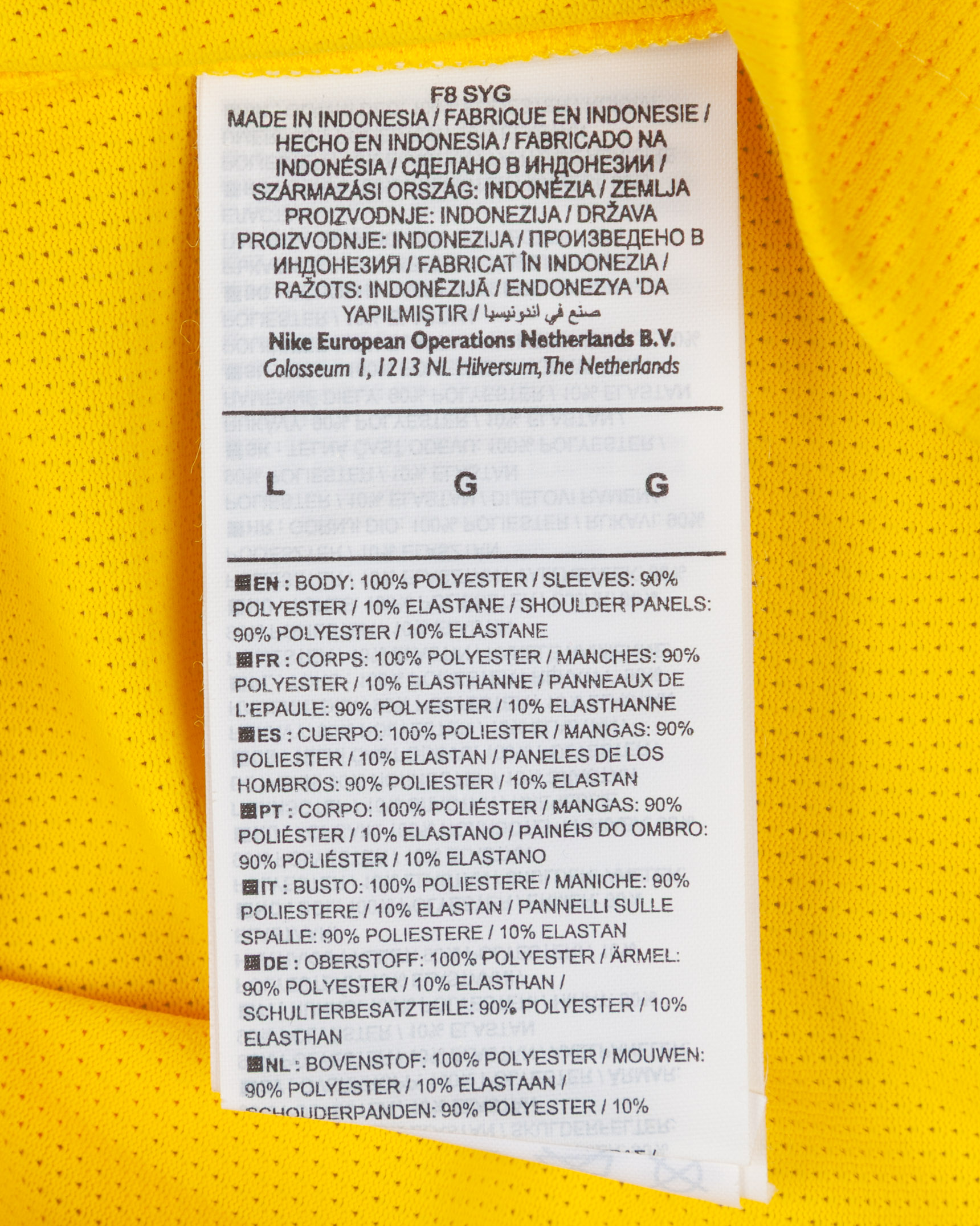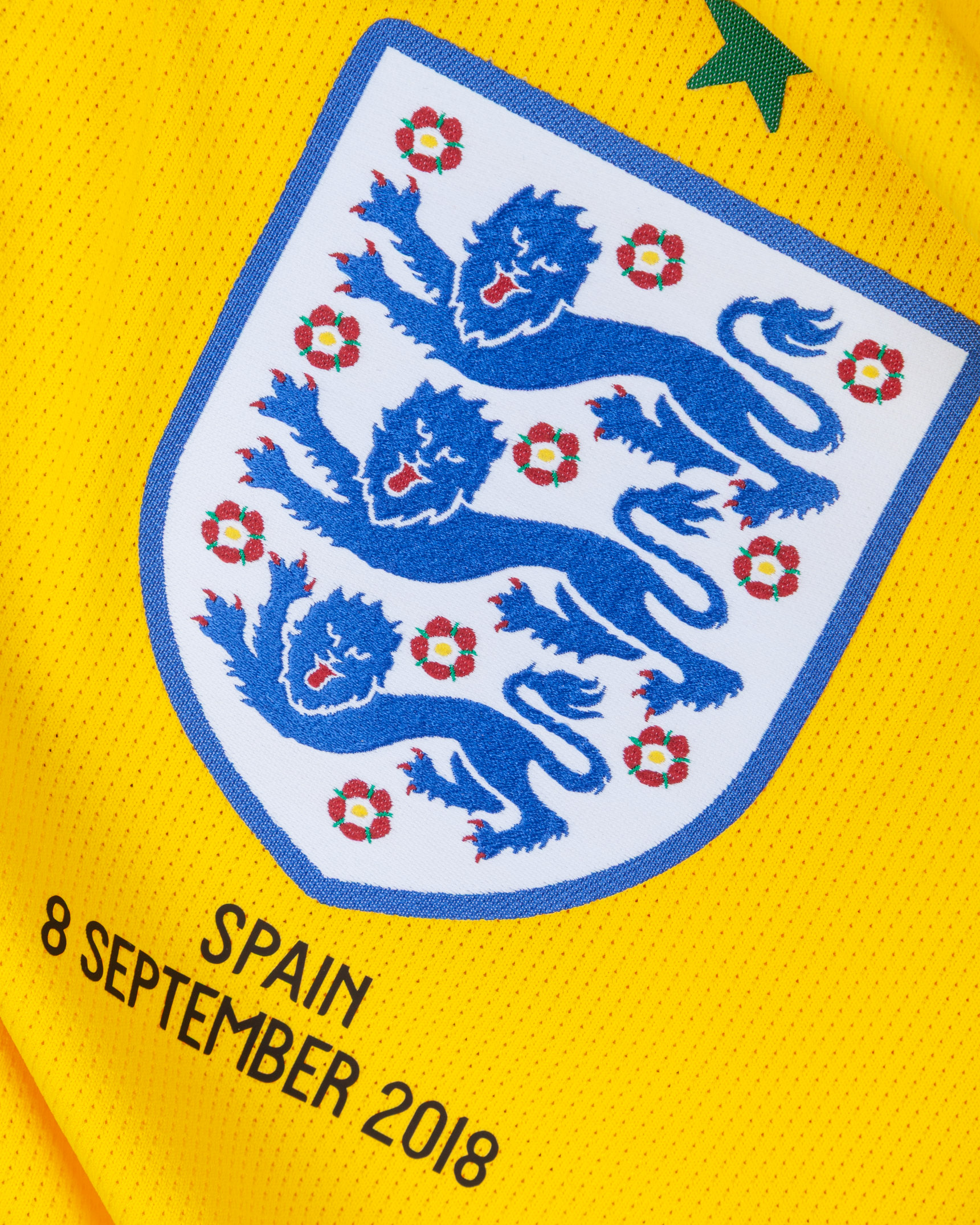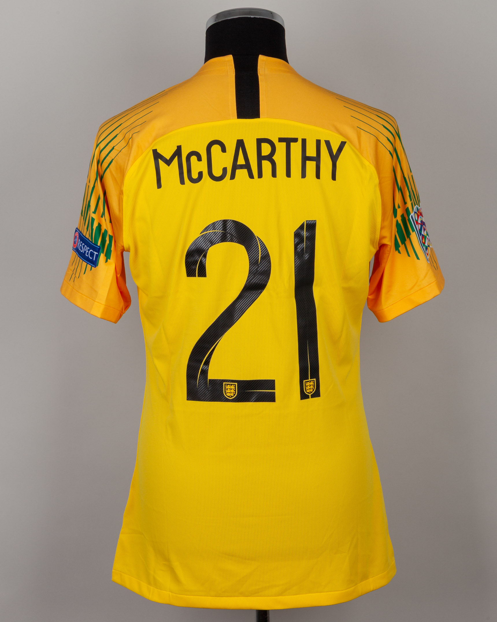 Alex McCarthy yellow and green No.21 England v. Spain short-sleeved shirt, 2018, Nike, L, with v-neck collar and printed badge, with SPAIN 8 SEPTEMBER 2018 decal, the reverse lettered McCARTHY, the right sleeve with Nations League flash and the left sleeve with respect flash