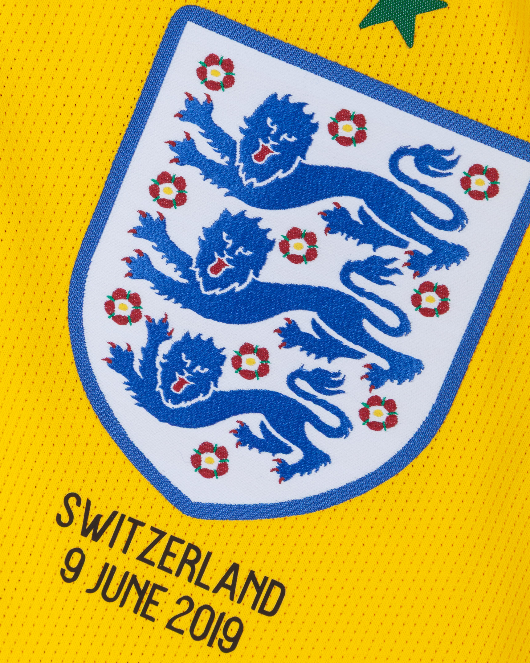 Tom Heaton yellow and green No.23 England v. Switzerland long-sleeved shirt, 2019, Nike, L, with v-neck collar and printed badge, with SWITZERLAND 9 JUNE 2019 decal, the reverse lettered HEATON, the right sleeve with Nations League flash and the left sleeve with respect flash