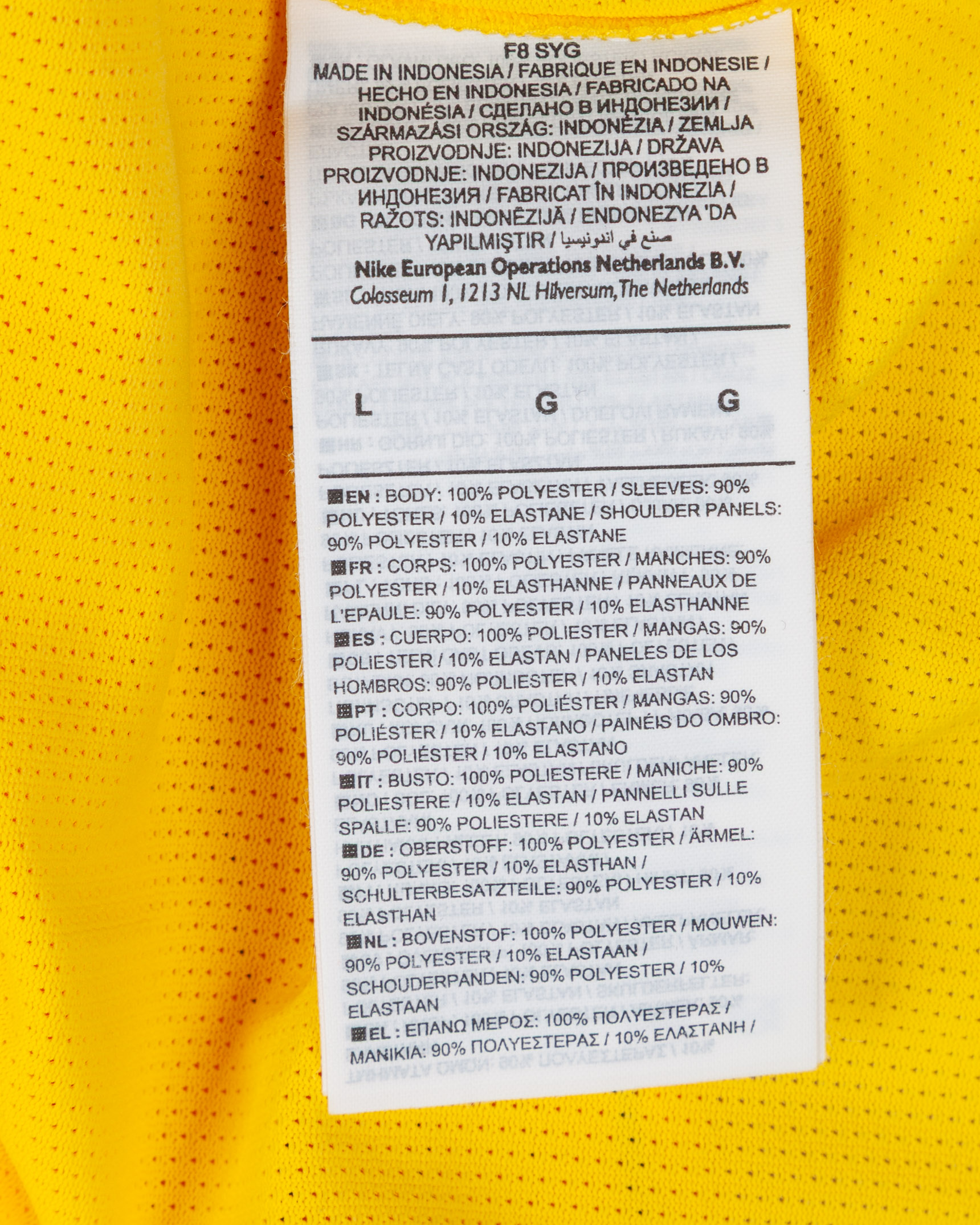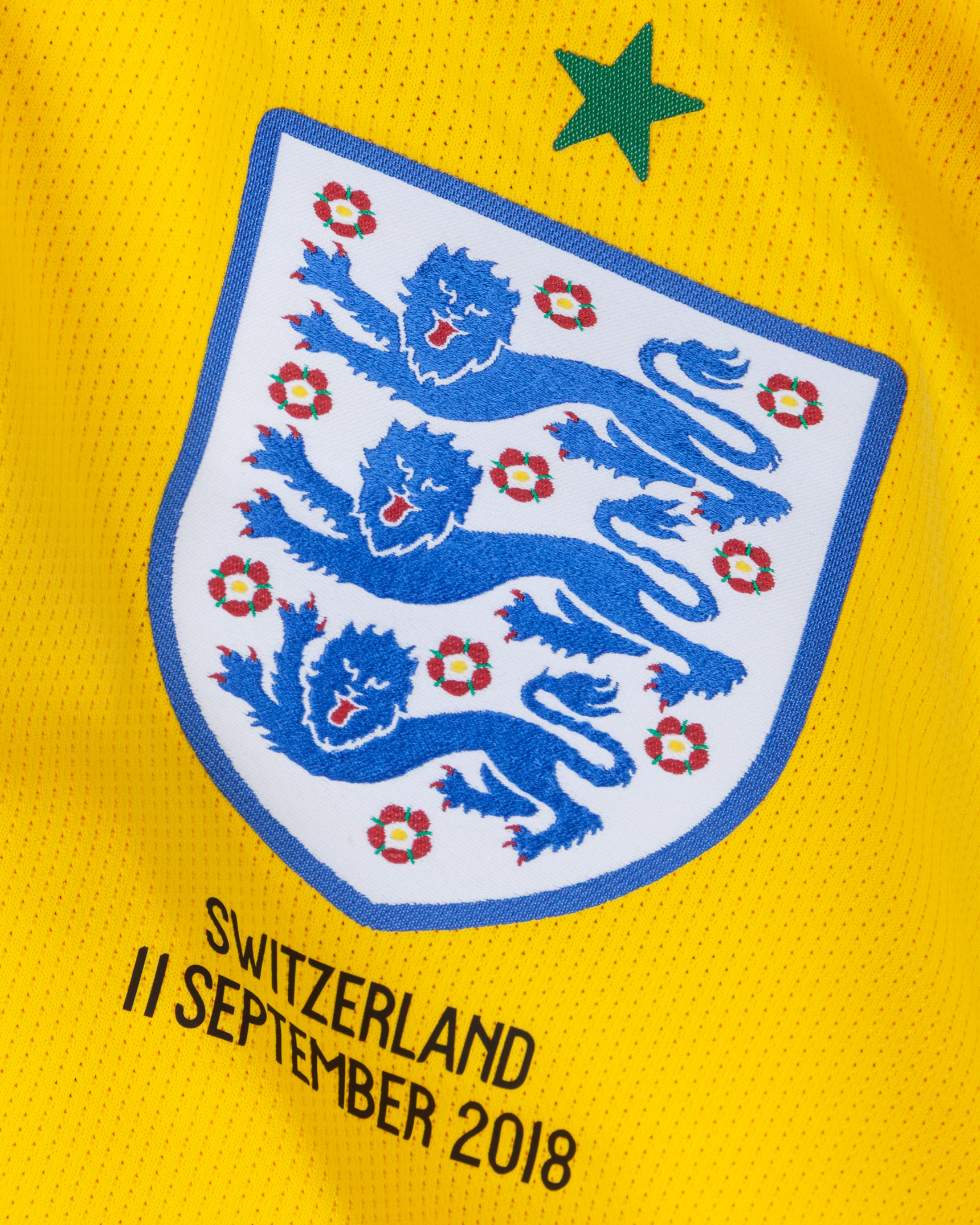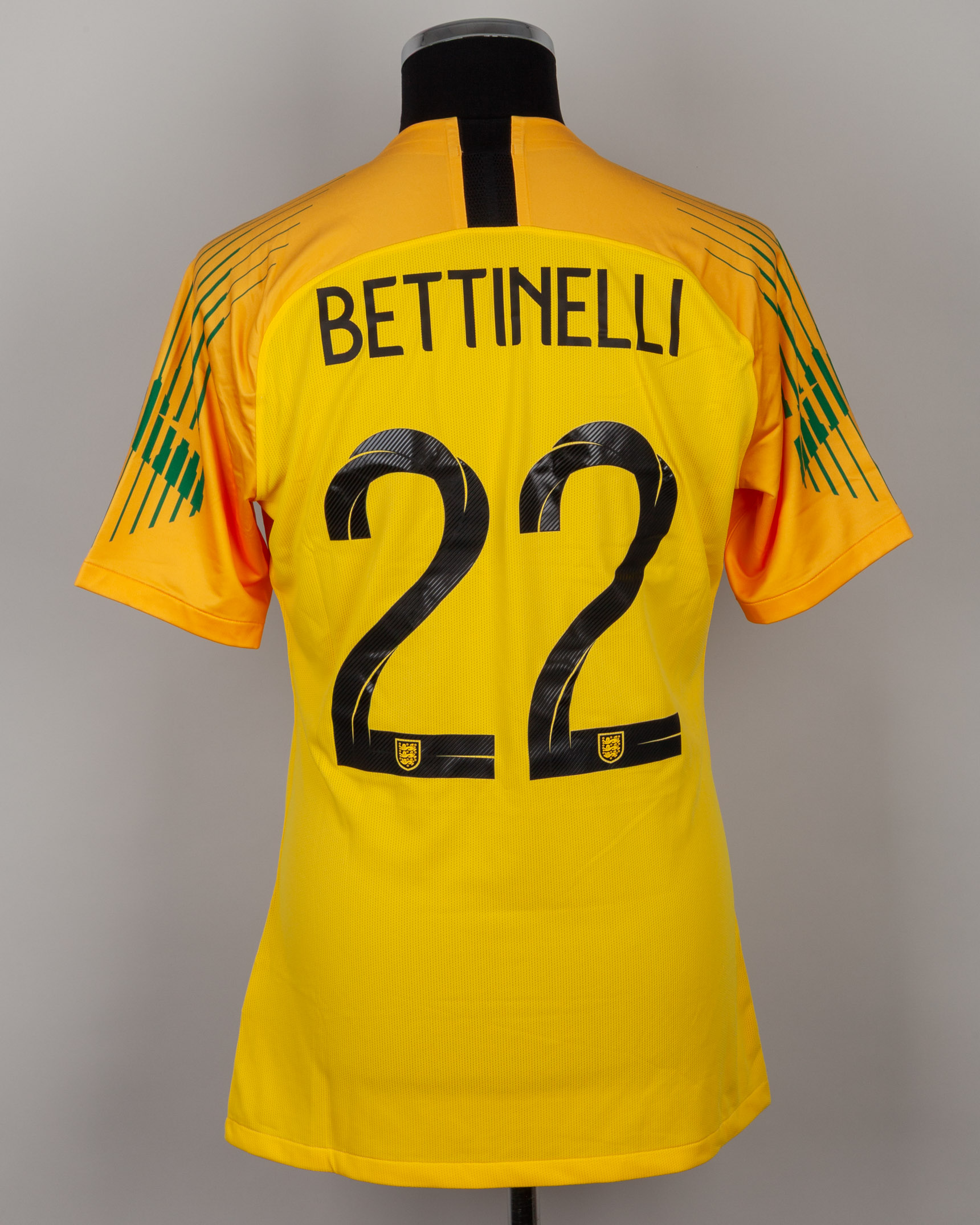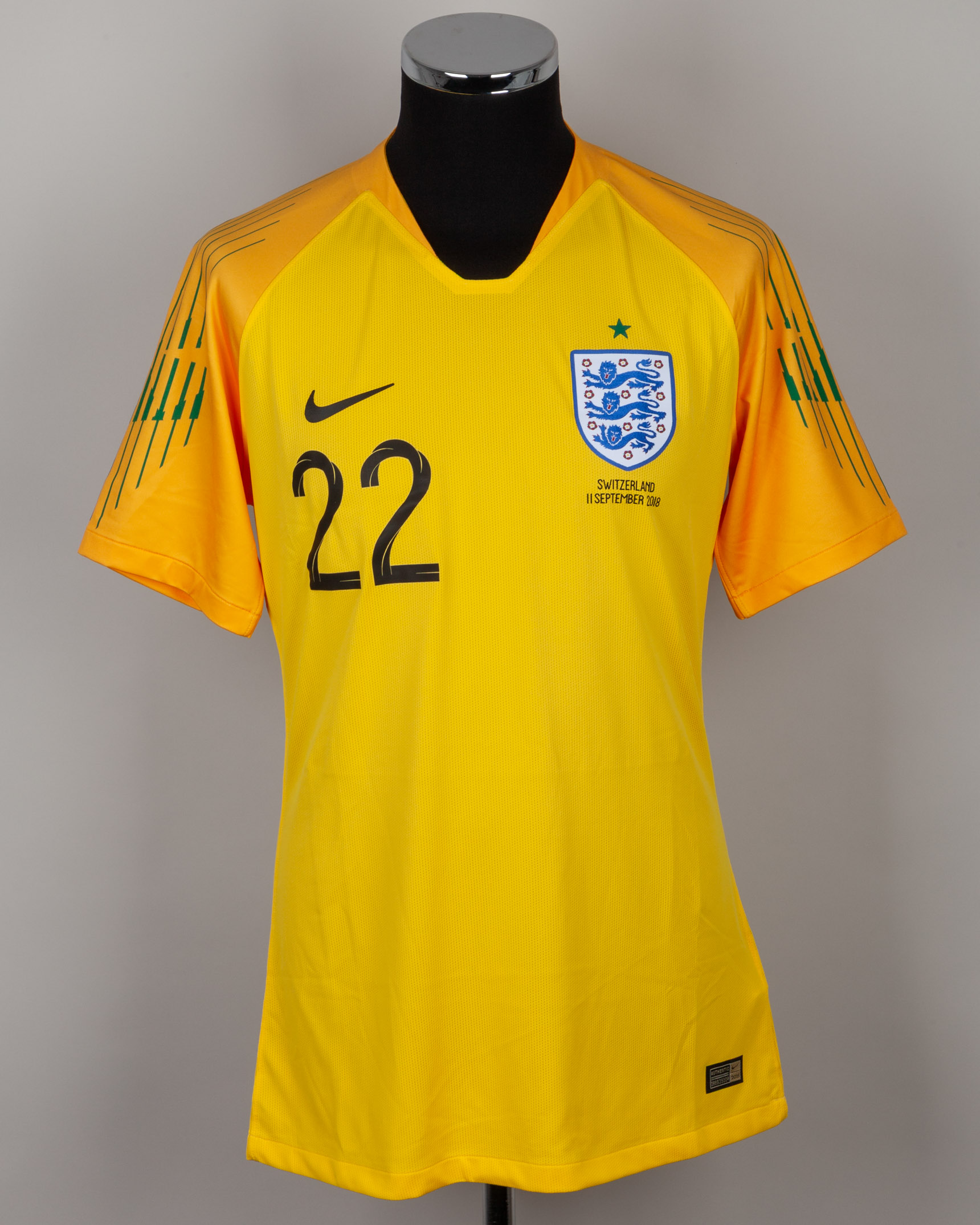 Marcus Bettinelli yellow and green No.22 England v. Switzerland short-sleeved shirt, 2018, Nike, L, with v-neck collar and printed badge, with SWITZERLAND 11 SEPTEMBER 2018 decal, the reverse lettered BETTINELLI