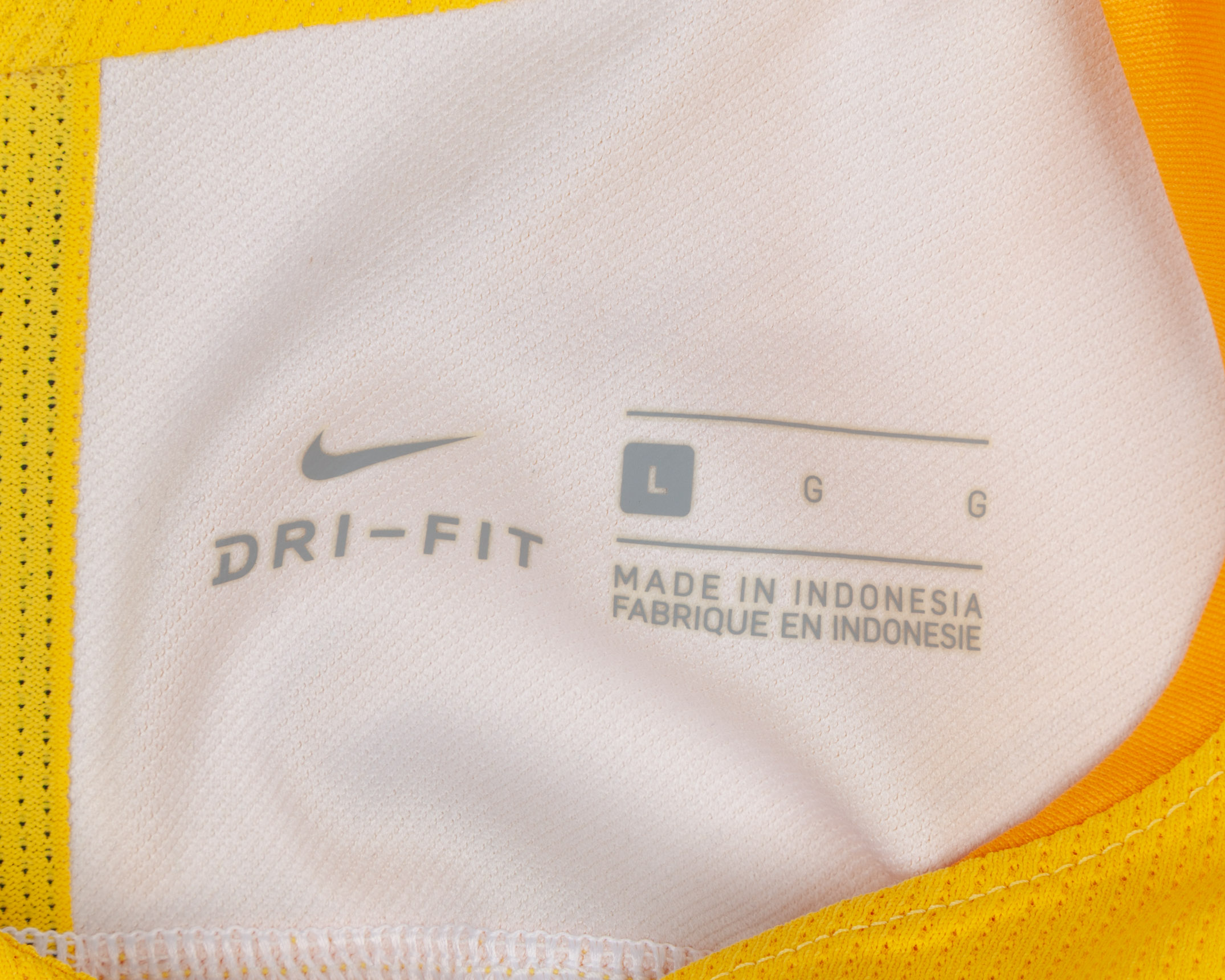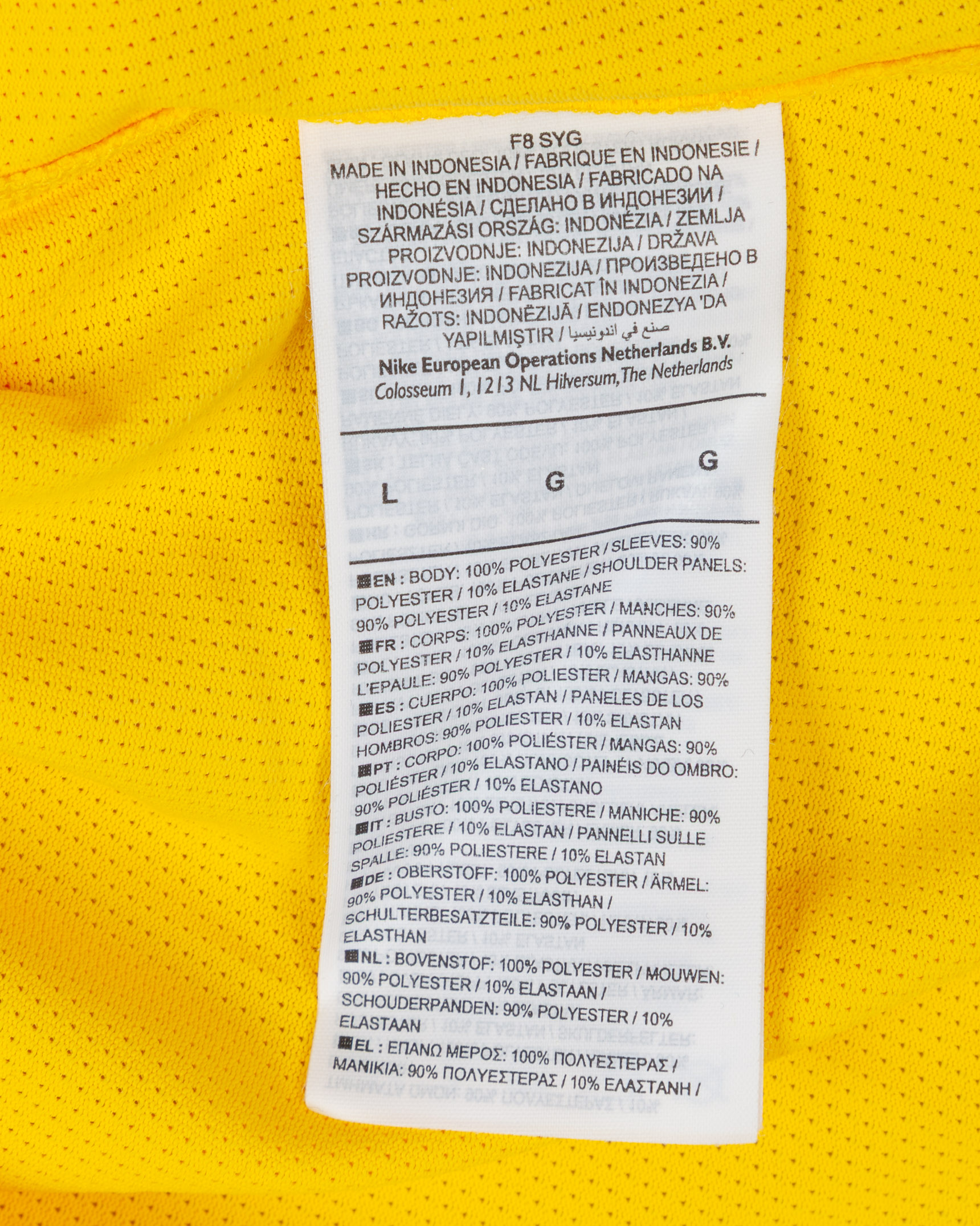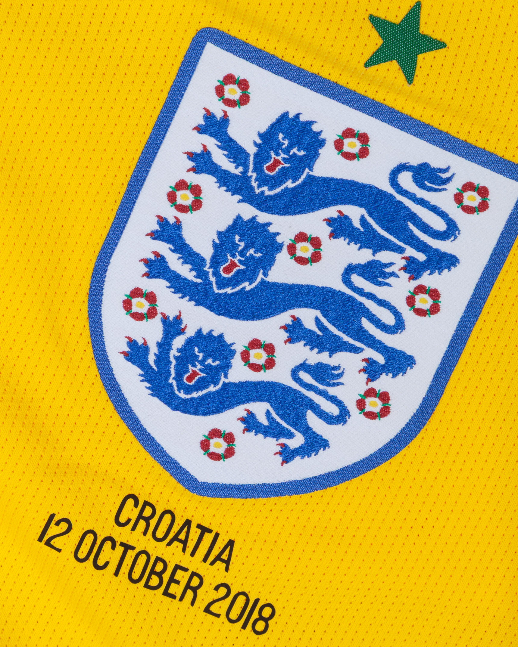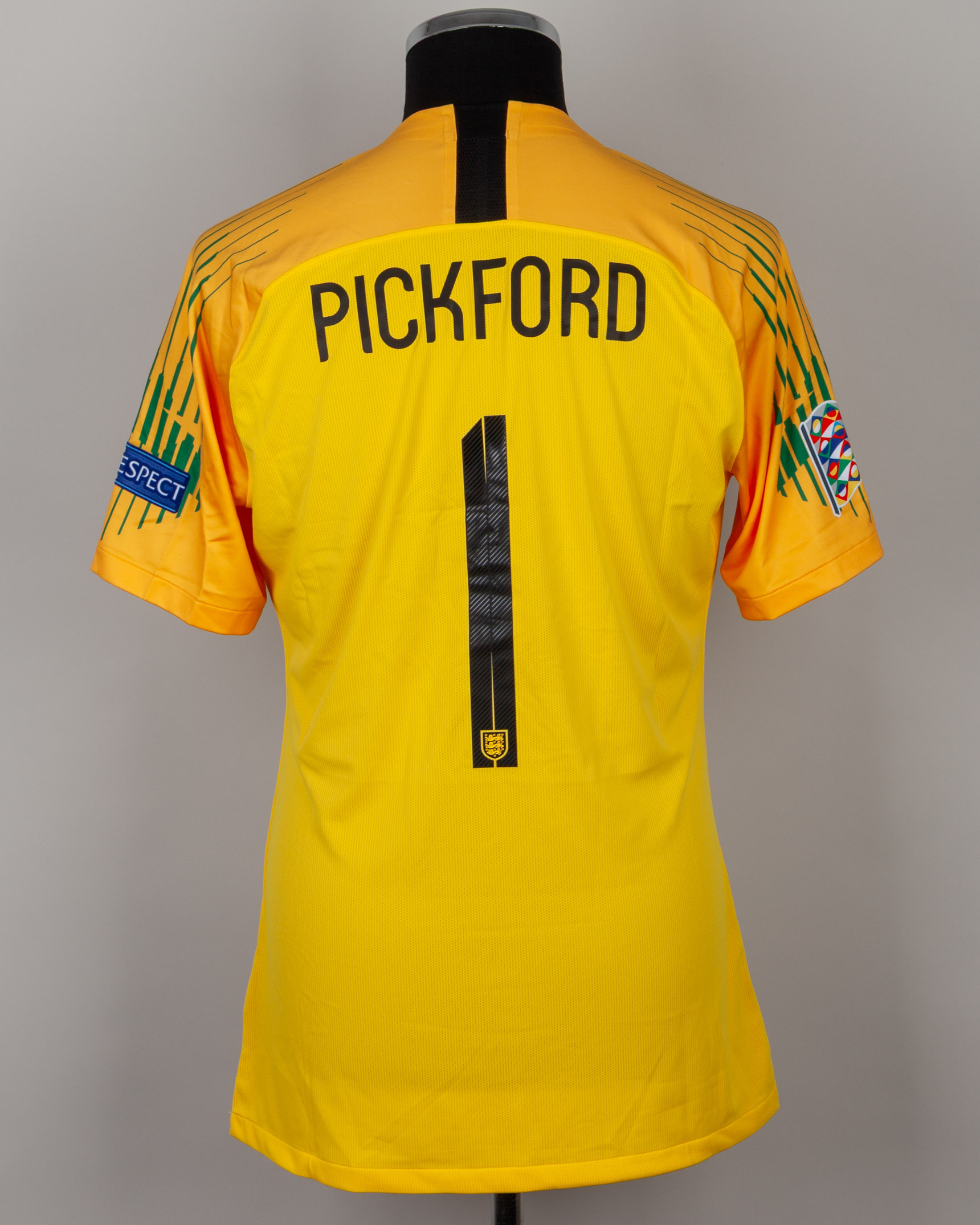 Jordan Pickford yellow and green No.1 England v. Croatia short-sleeved shirt, 2018, Nike, L, with v-neck collar and printed badge, with CROATIA 12 OCTOBER 2018 decal, the reverse lettered PICKFORD, the right sleeve with Nations League flash and the left sleeve with respect flash