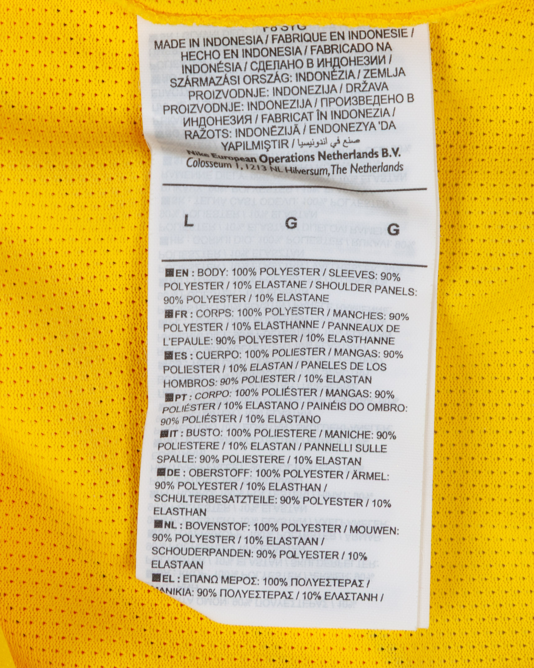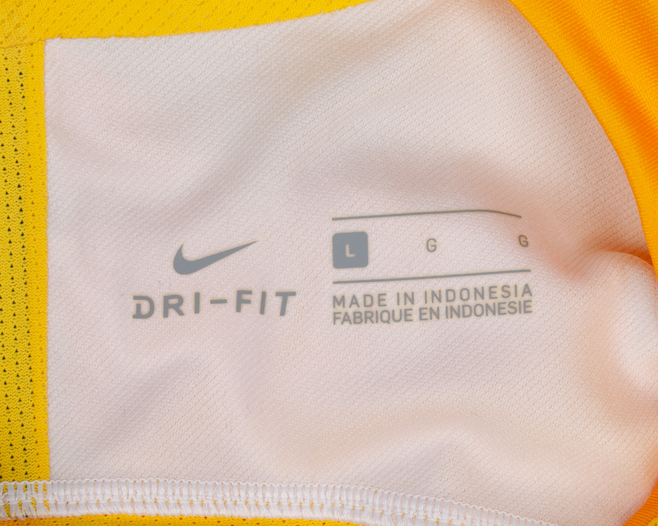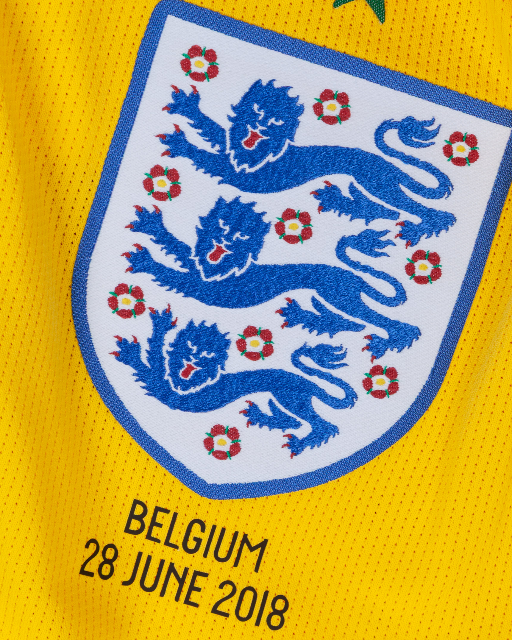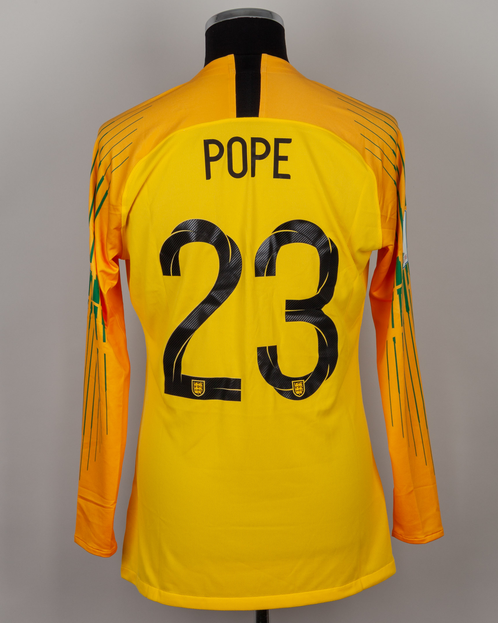 Nick Pope yellow and green No.23 England v. Belgium match issued goalkeepers shirt, 2018, Nike, L, with v-neck collar and printed badge, with BELGIUM 28 JUNE 2018 decal, the reverse lettered POPE, the right sleeve with FIFA World Cup Russia 2018 flash and the left sleeve with living football flash