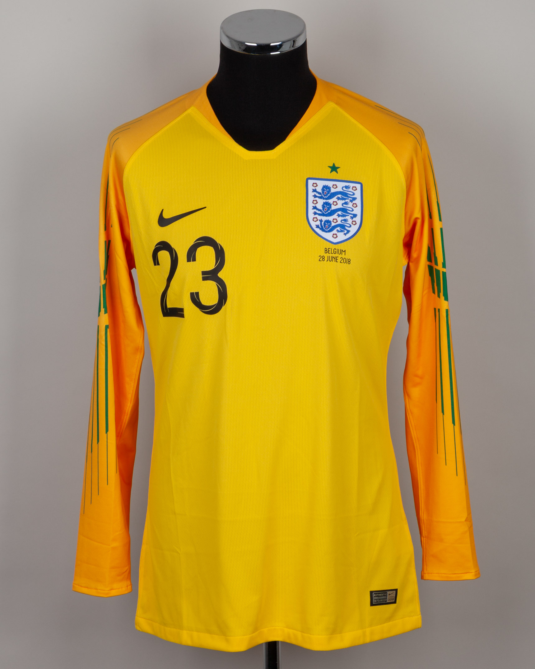 Nick Pope yellow and green No.23 England v. Belgium goalkeepers shirt, 2018