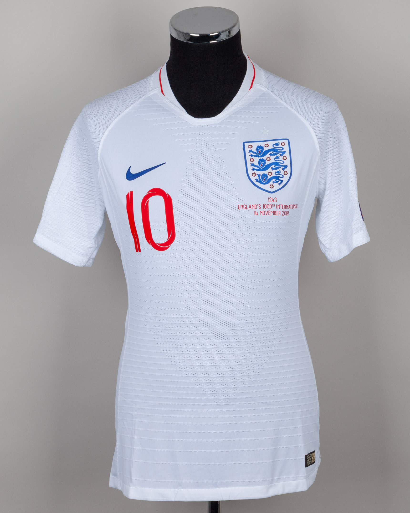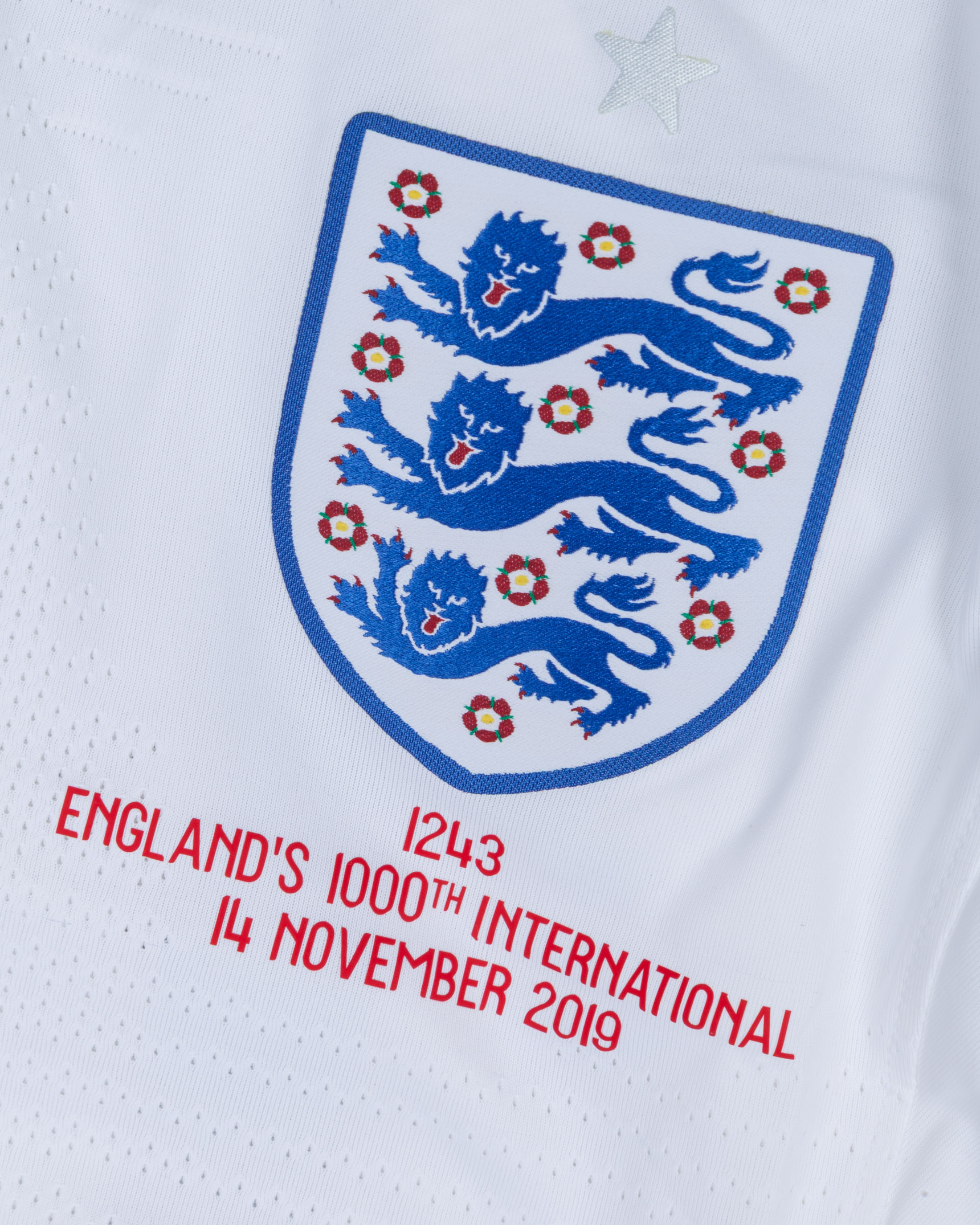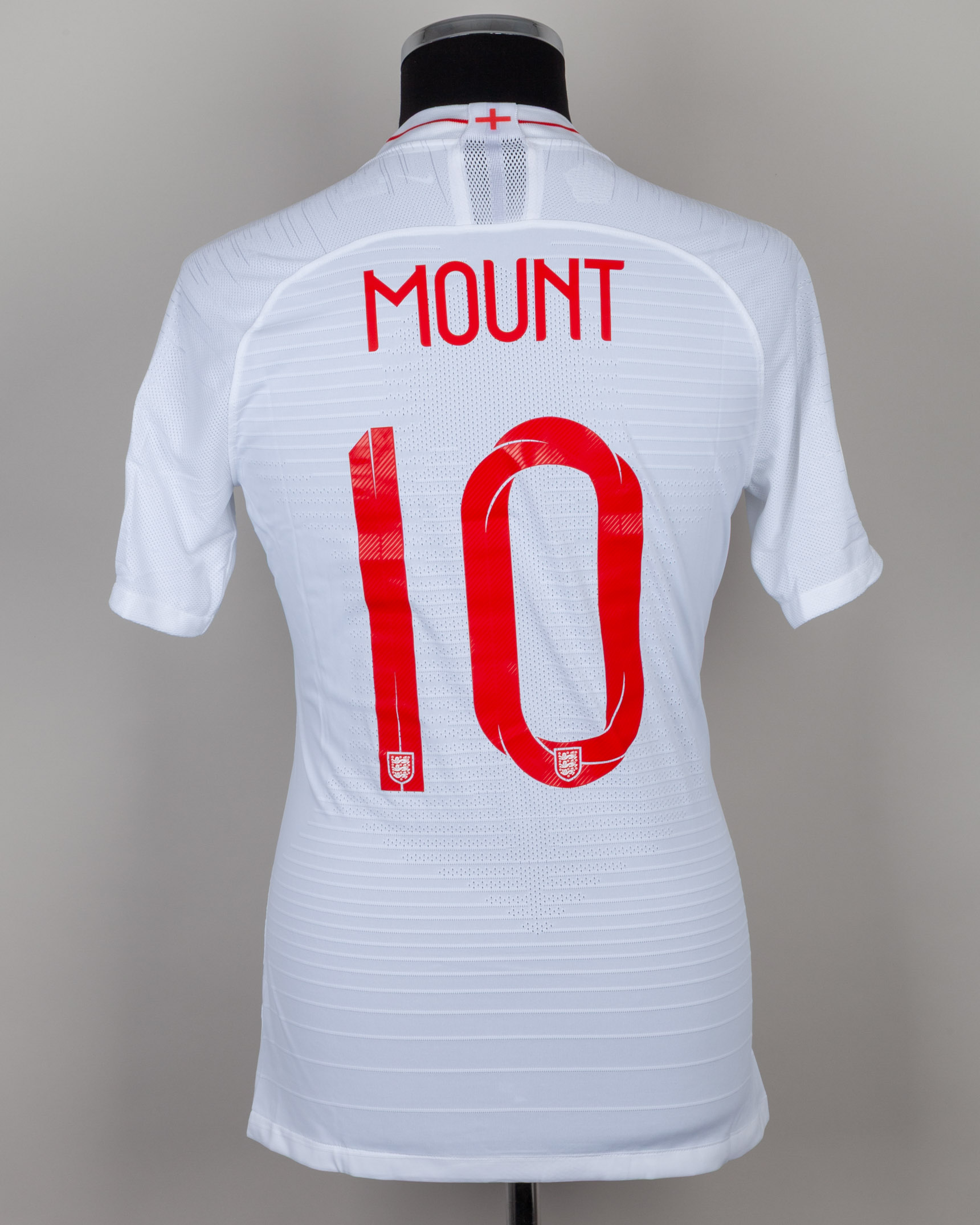 Mason Mount white No.10 England v. Montenegro short-sleeved shirt, 2019, Nike, M, with v-neck collar and printed badge, with 1243 ENGLAND'S 1000TH INTERNATIONAL 14 NOVEMBER 2019 decal, the reverse lettered MOUNT, the right sleeve with Euro 2020 flash and the left sleeve with respect flash