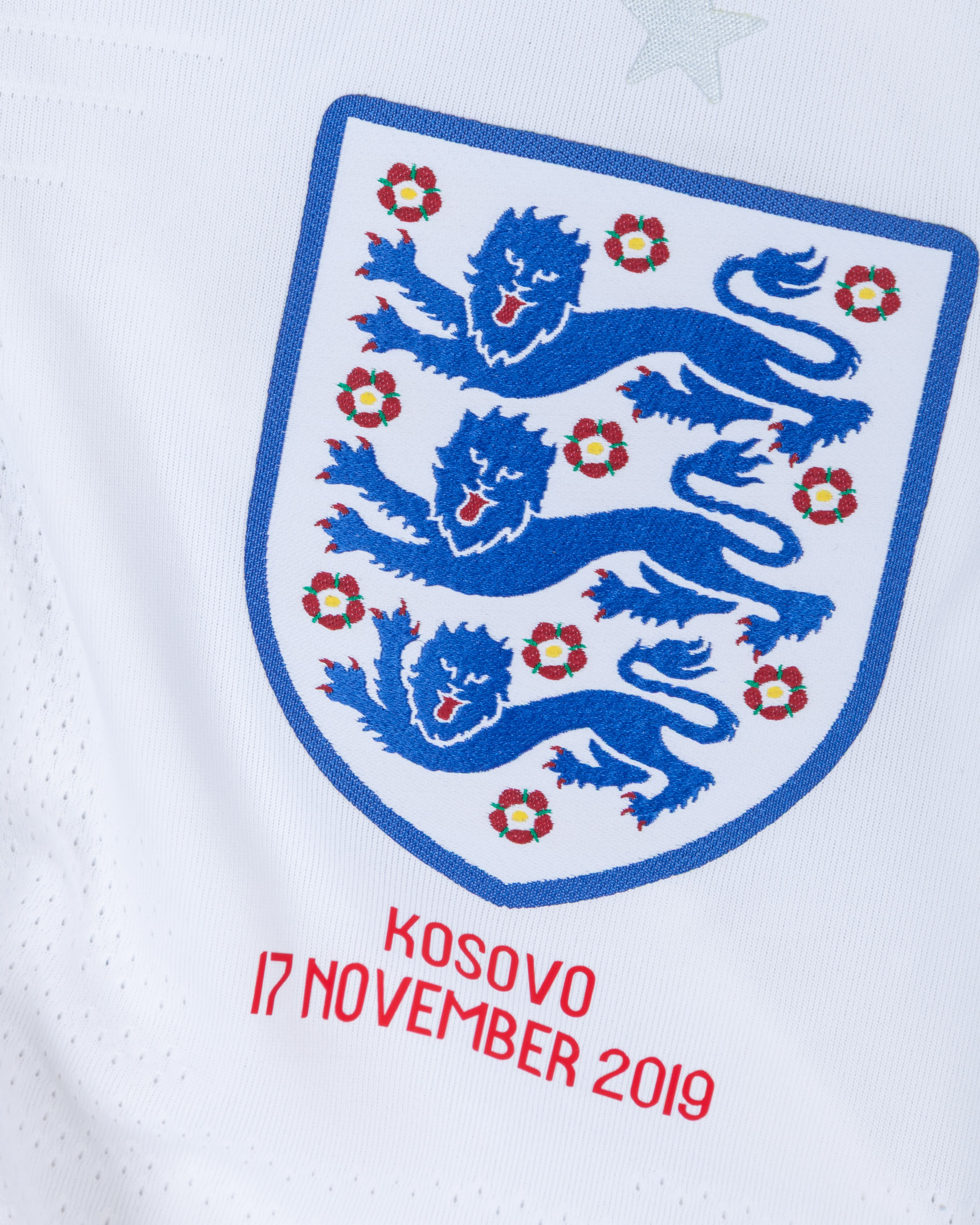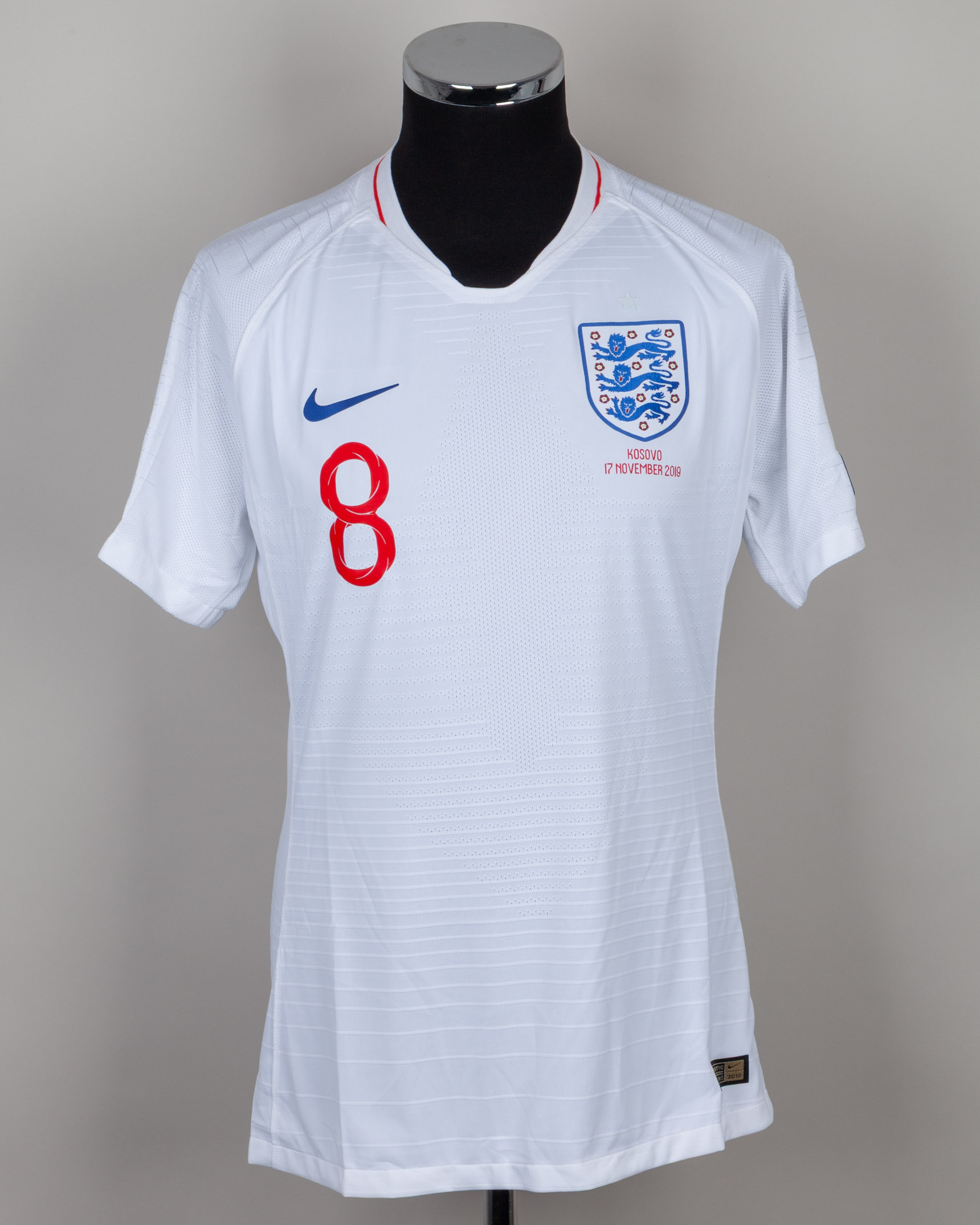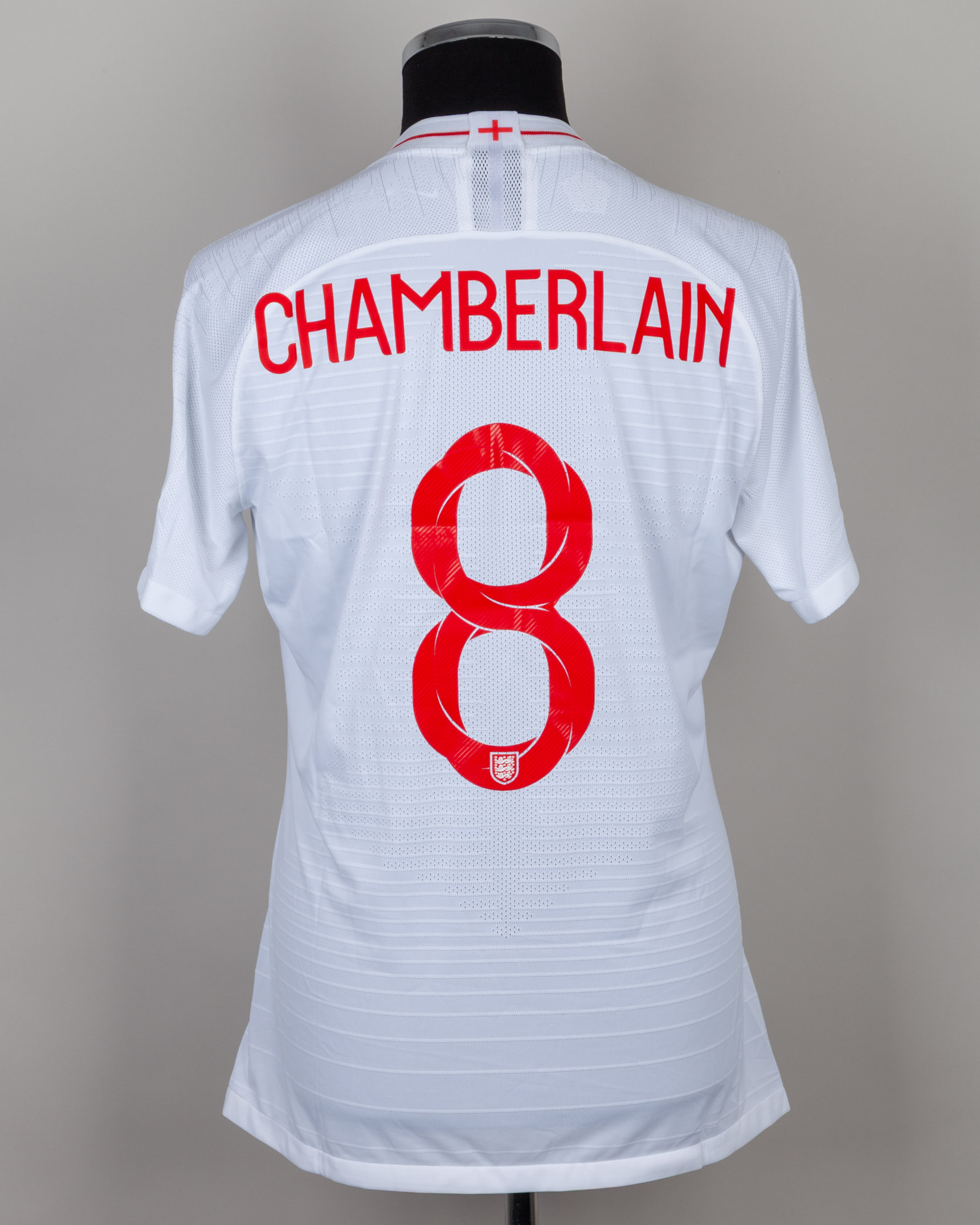 Alex Oxlade-Chamberlain white No.8 England v. Kosovo short-sleeved shirt, 2019, Nike, L, with v-neck collar and printed badge, with KOSOVO 17 NOVEMBER 2019 decal, the reverse lettered CHAMERLAIN, the right sleeve with Euro 2020 flash and the left sleeve with respect flash