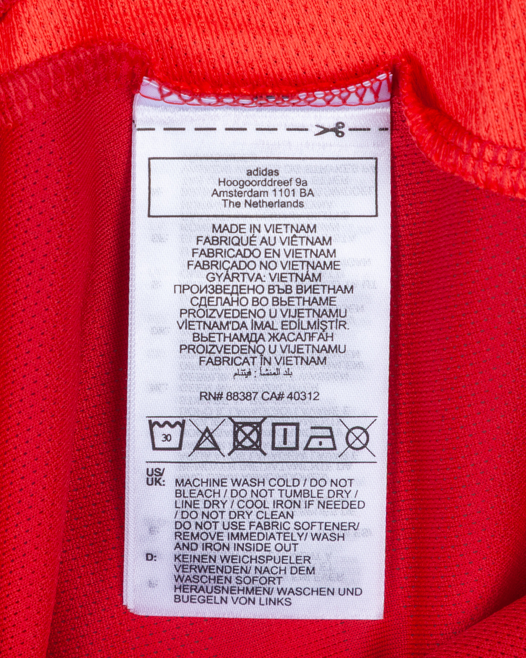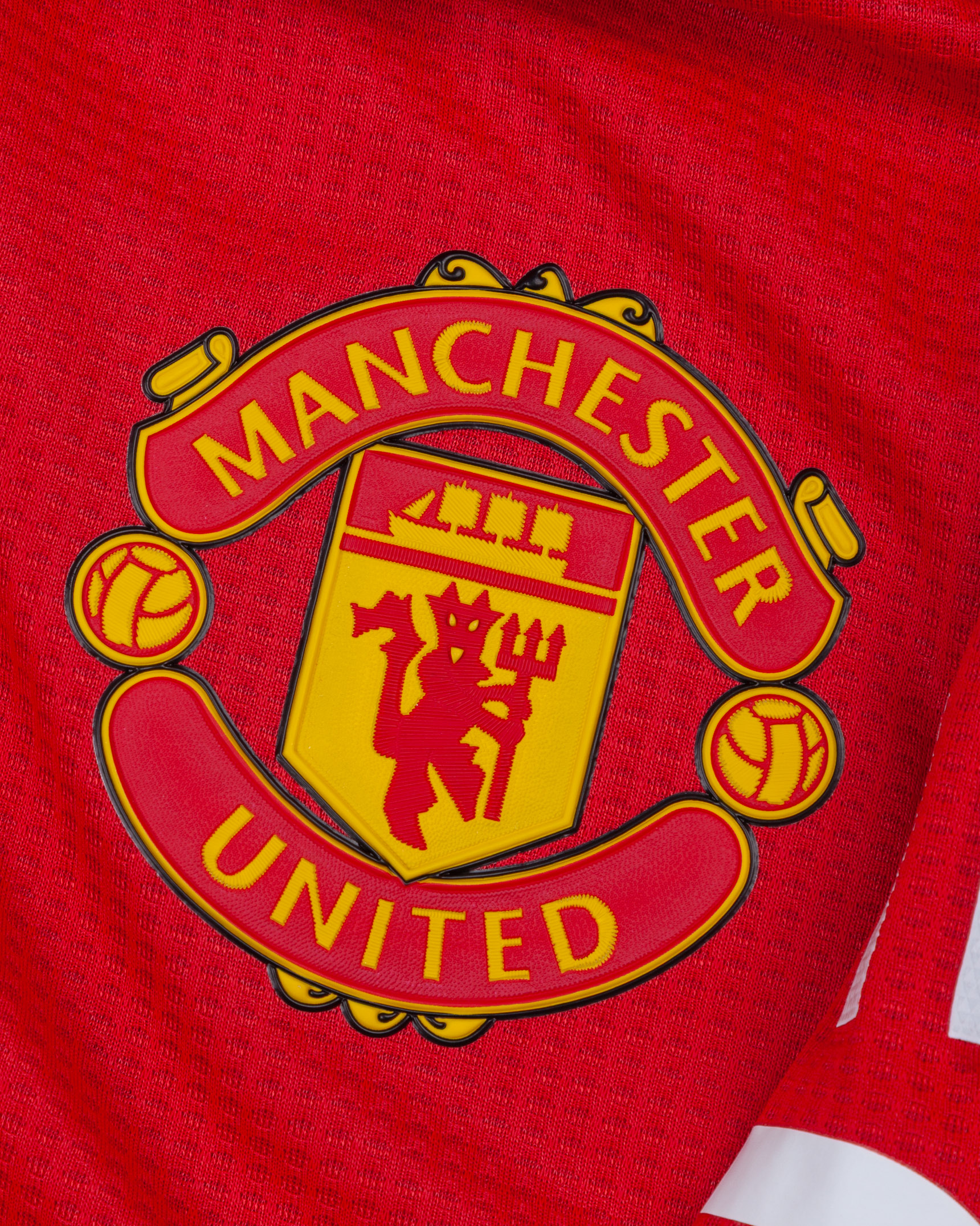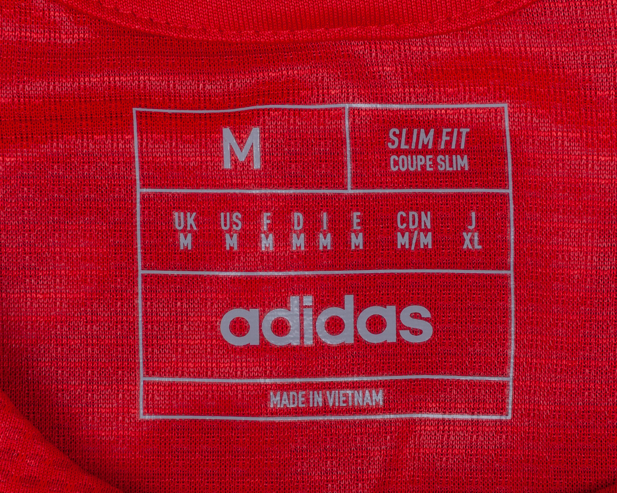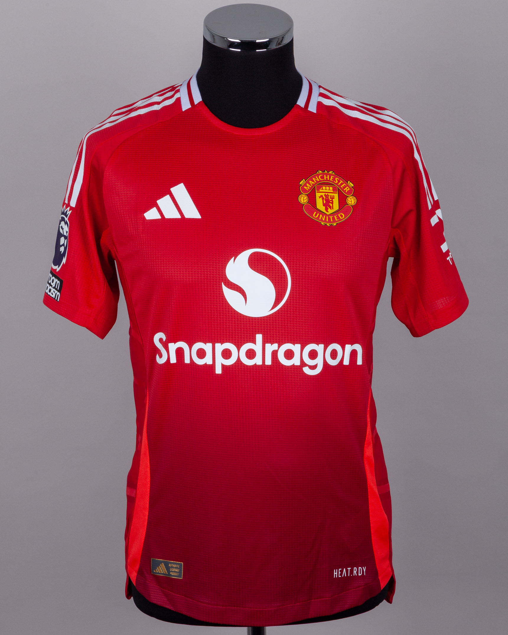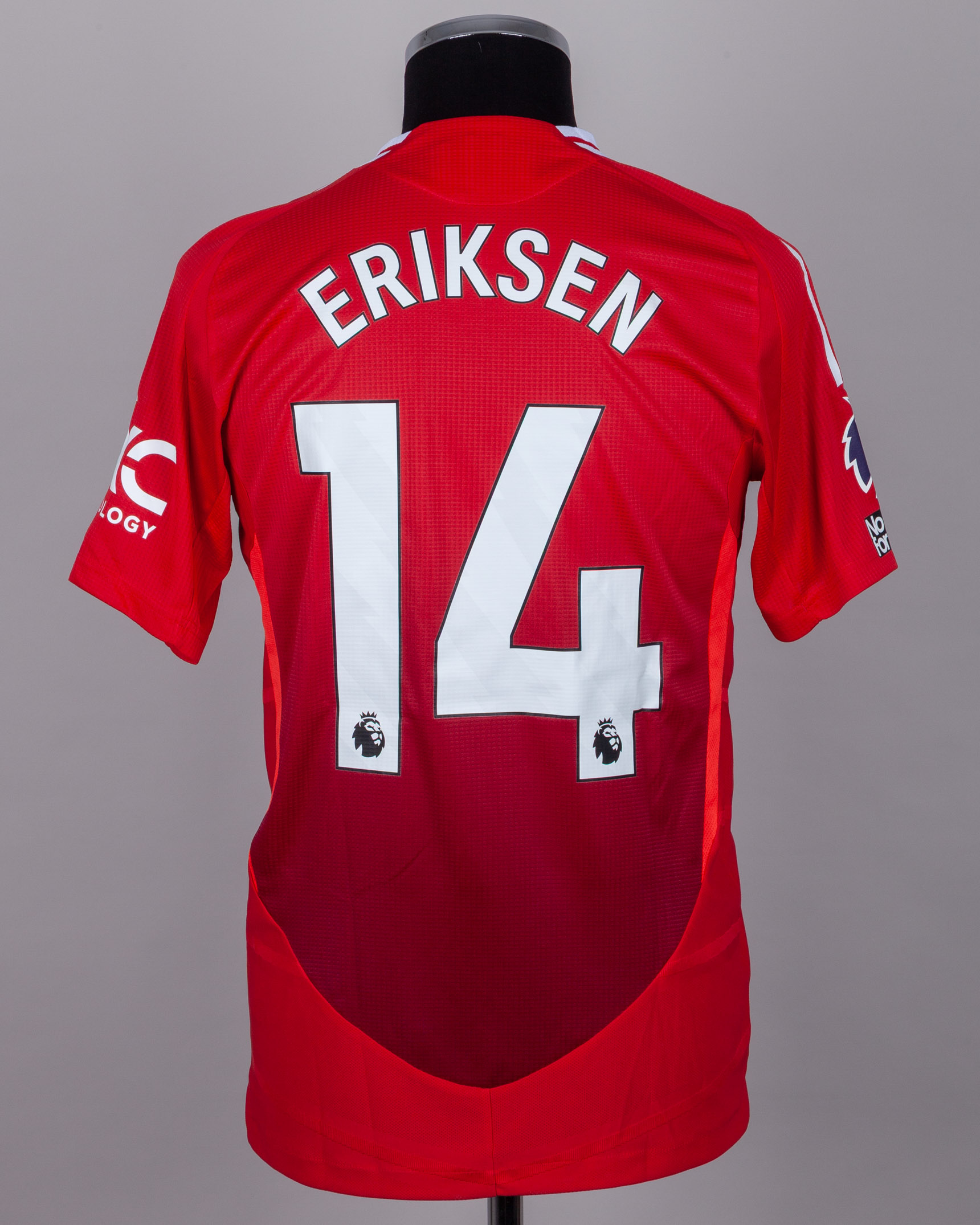 Christian Eriksen red No.14 Manchester United short-sleeved shirt, 2024-25, Adidas, M, with crew-neck collar and printed badge, the reverse lettered ERIKSEN, the right sleeve with Premier League and no room for racism flash