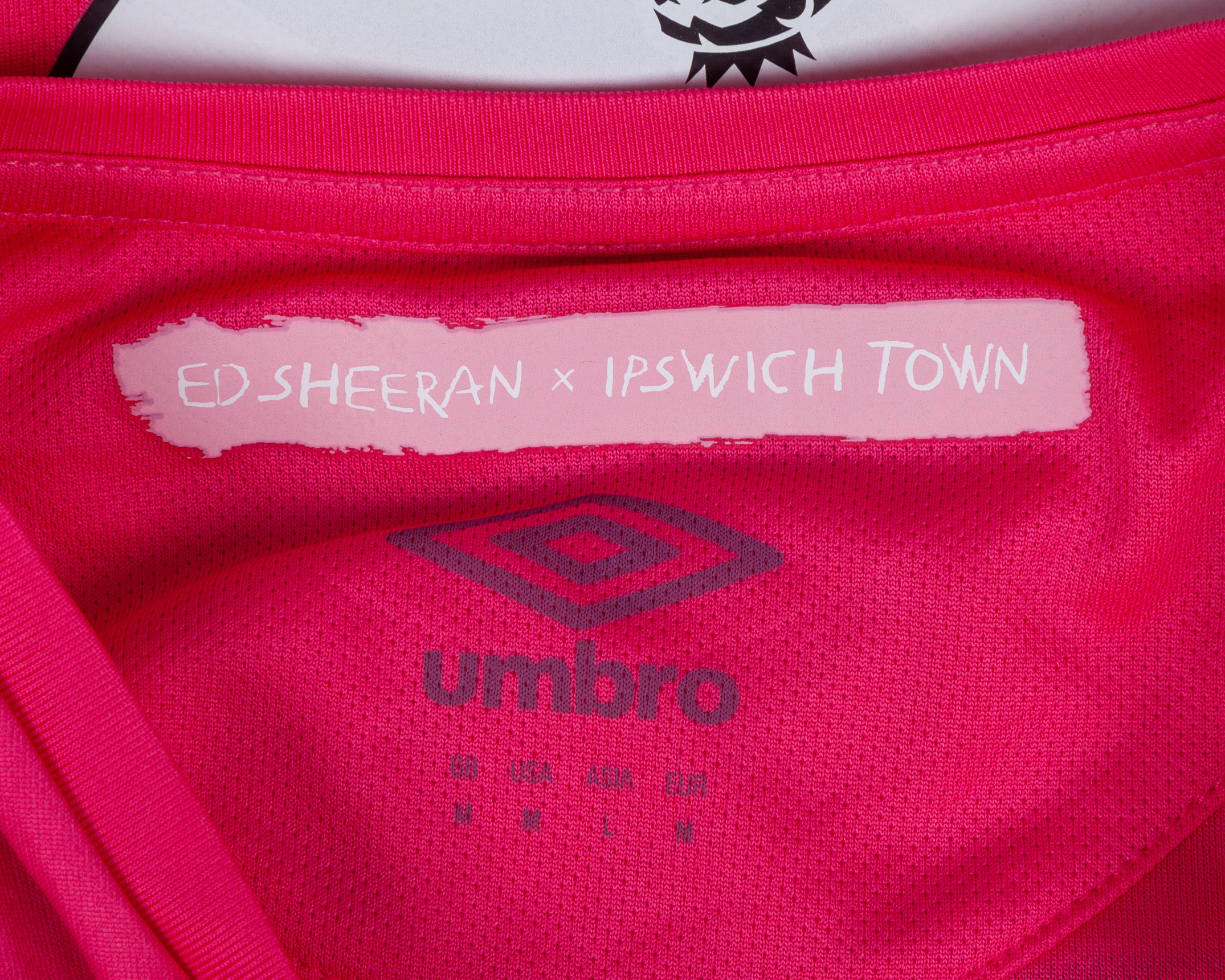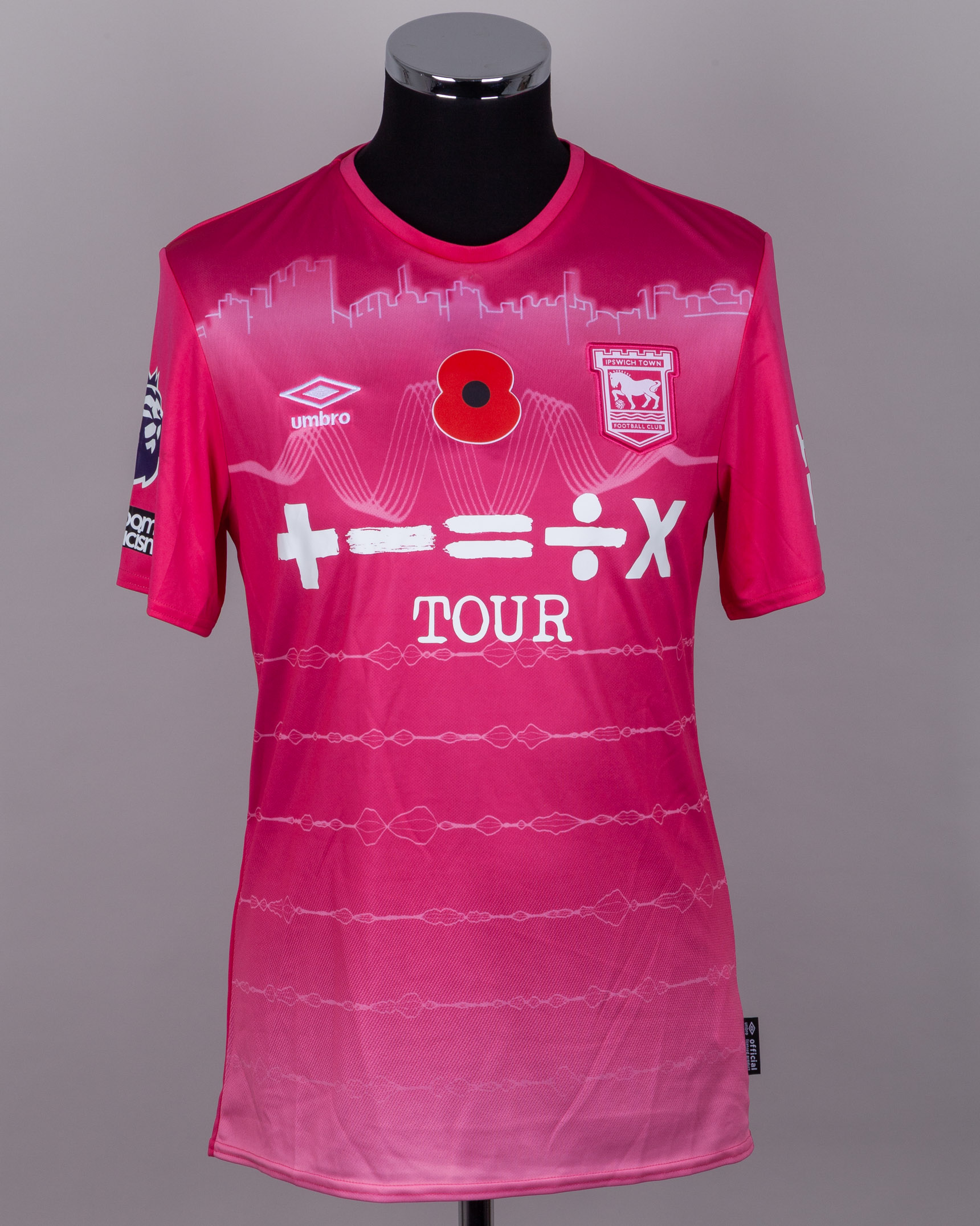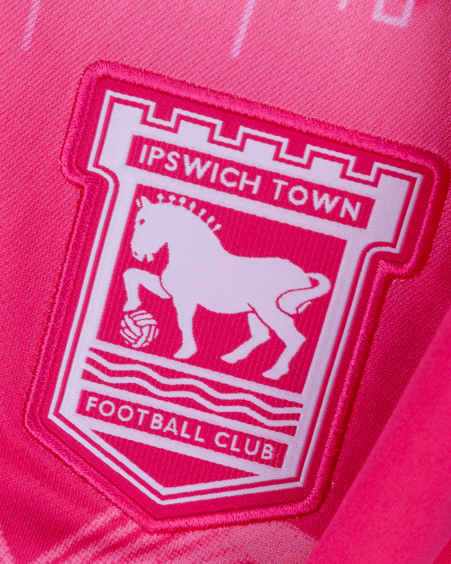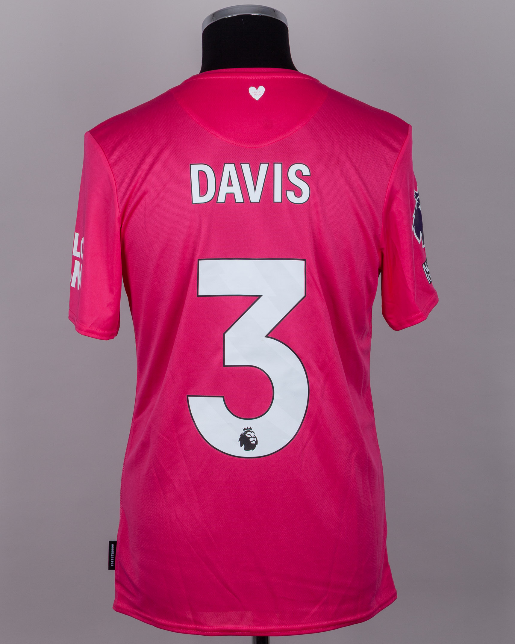 Leif Davis pink No.3 Ipswich Town v. Tottenham Hotspur short-sleeved shirt, 2024, Umbro, M, with crew-neck collar and embroidered cloth badge inscribed IPSWICH TOWN FOOTBALL CLUB, the reverse lettered DAVIS, the right sleeve with Premier League and no room for racism flash