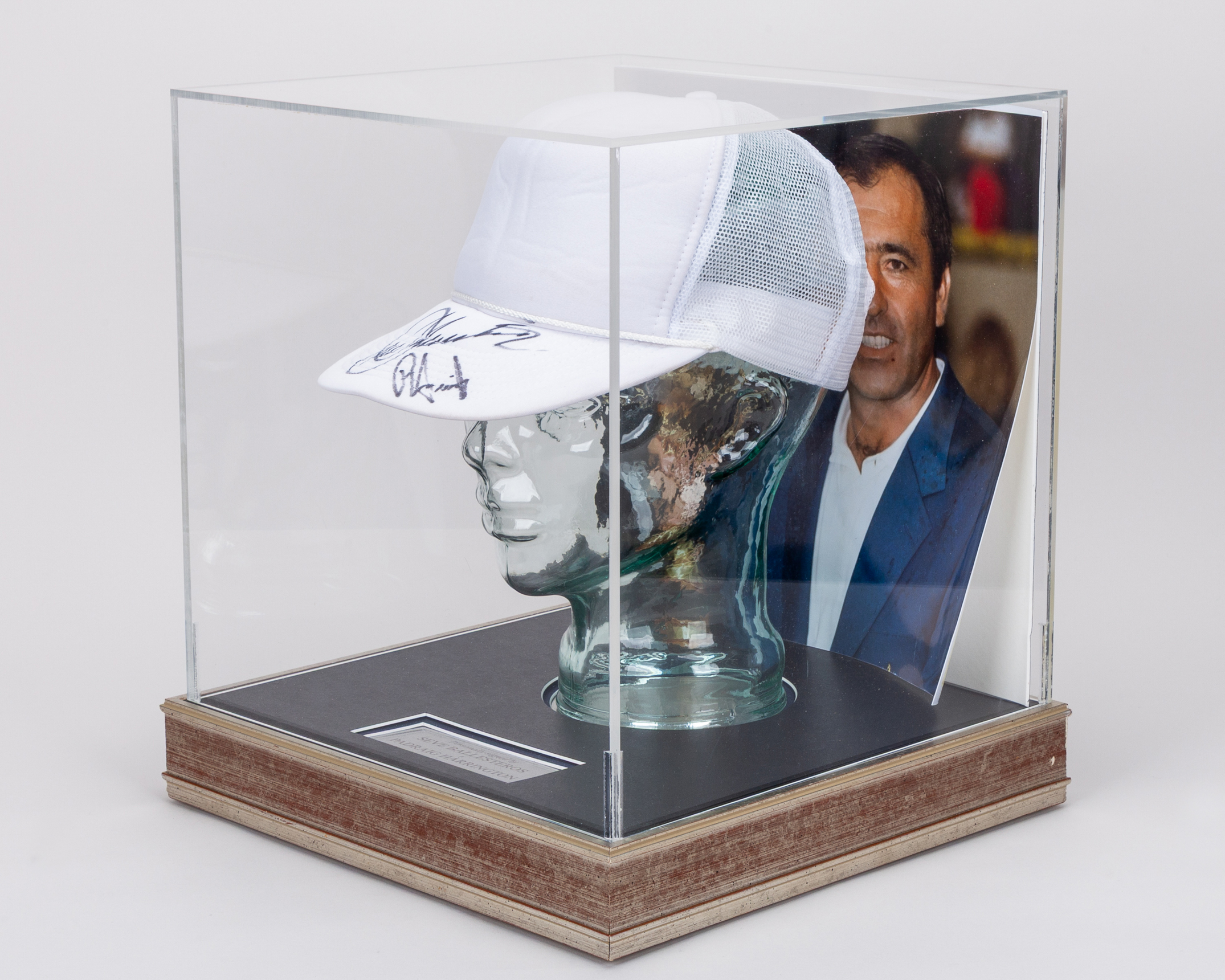Seve Ballesteros and Padraig Harrington autographed white cap display, backed with colour photograph of Seve, placed on glass head in case (glass removed for overseas delivery), 35cm high, scuffed case