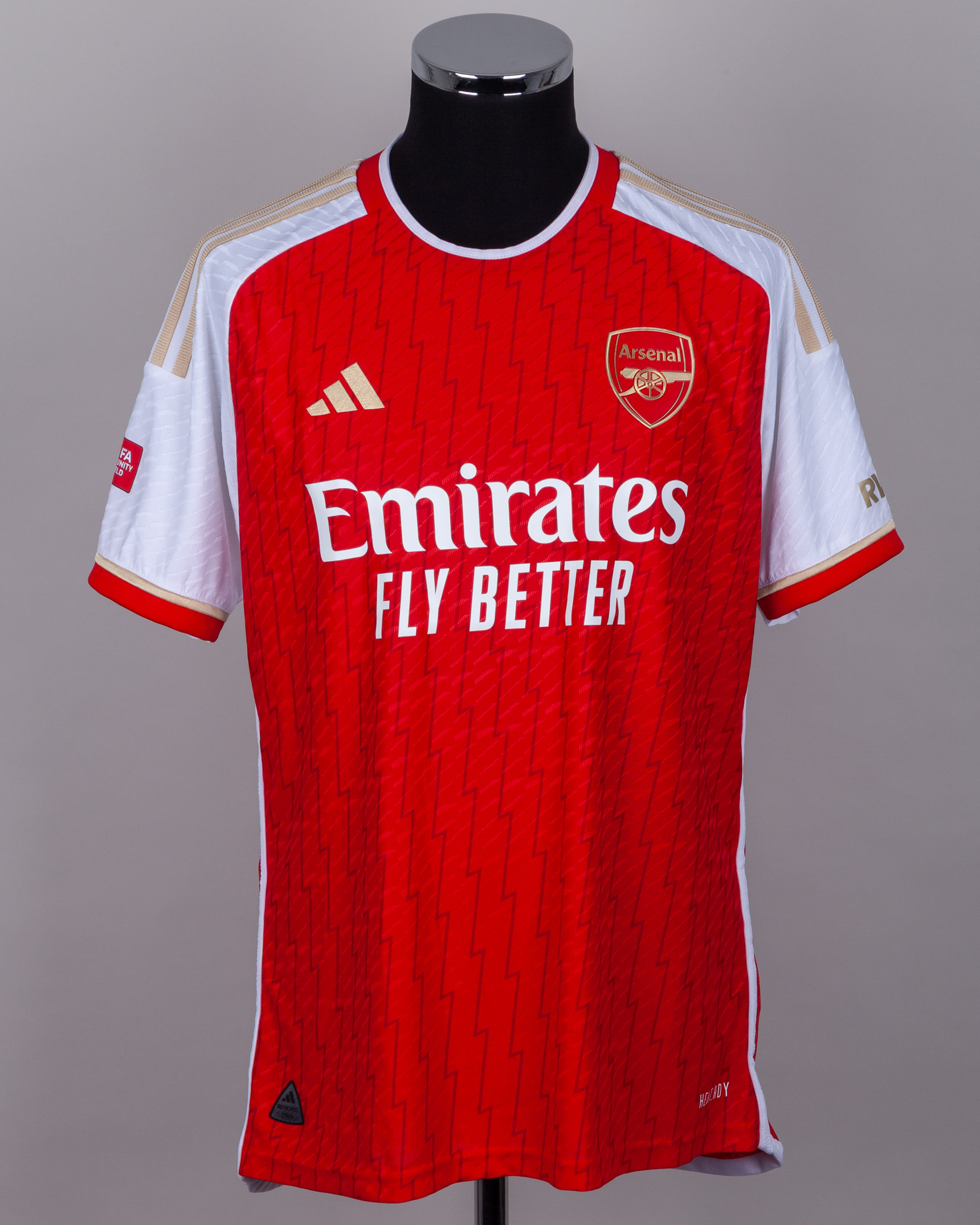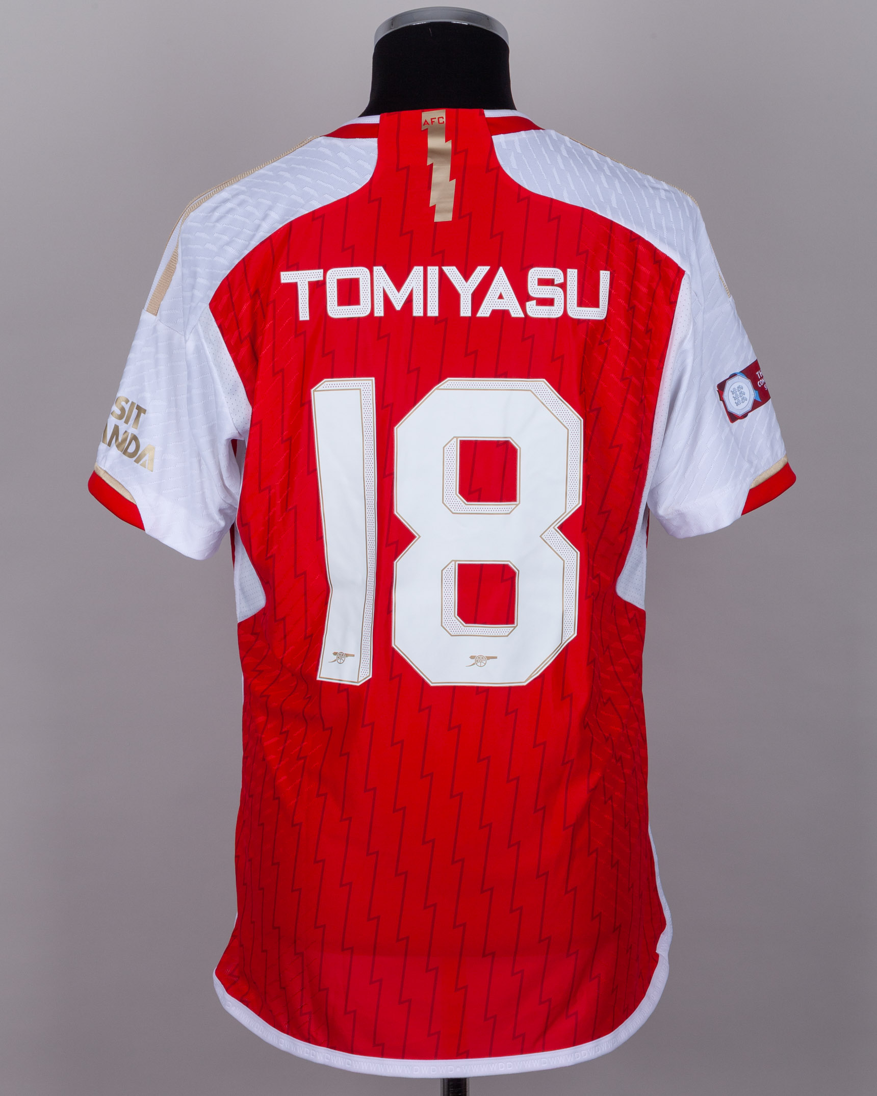 Takehiro Tomiyasu red and white No.18 Arsenal v. Manchester City Community Shield shirt, 2023