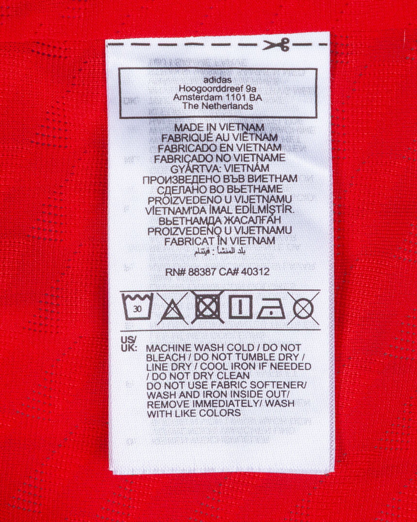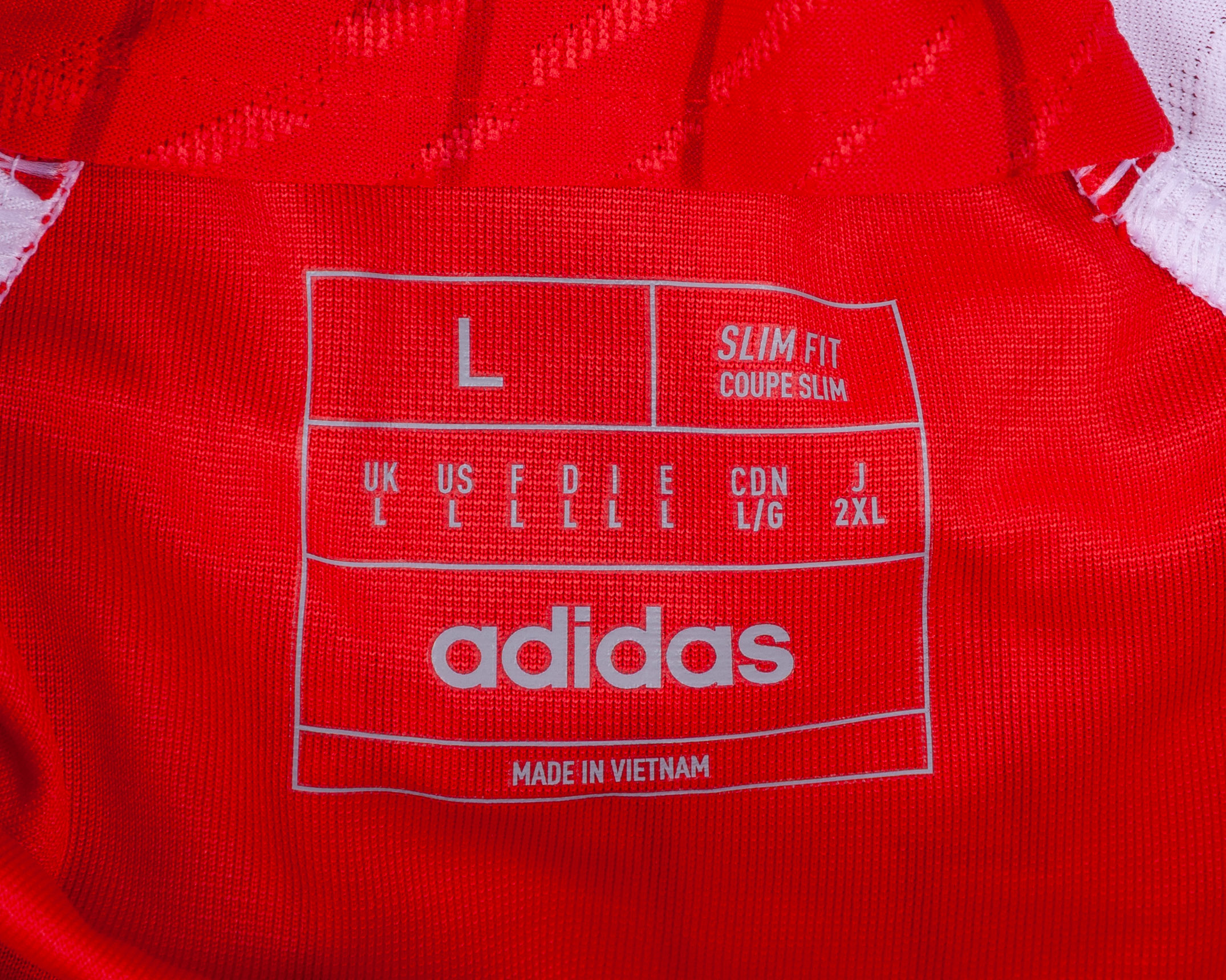 Takehiro Tomiyasu red and white No.18 Arsenal v. Manchester City Community Shield short-sleeved shirt, 2023, Adidas, L, with crew-neck collar and printed badge, the reverse lettered TOMIYASU, the right sleeve with The FA Community Shield flash