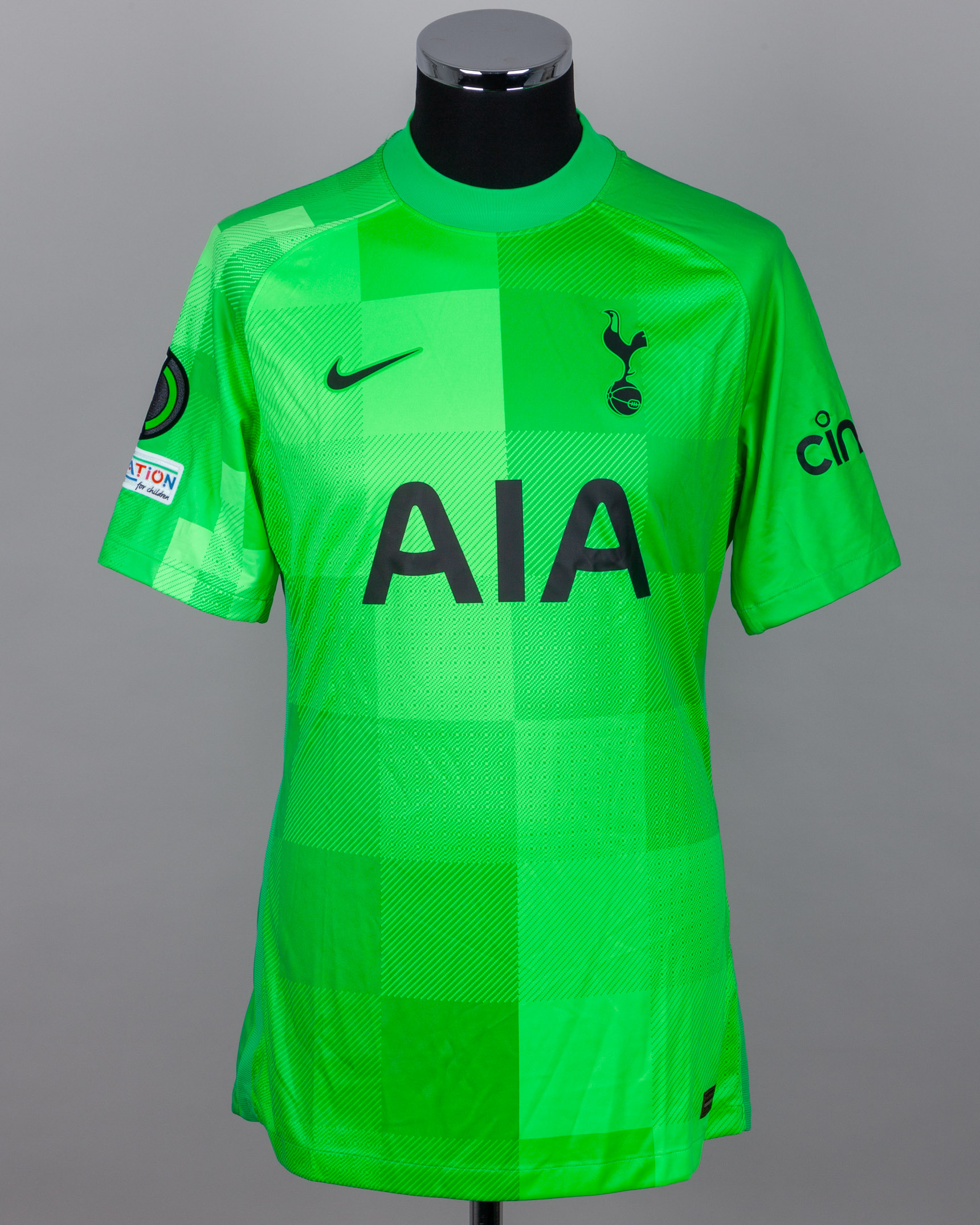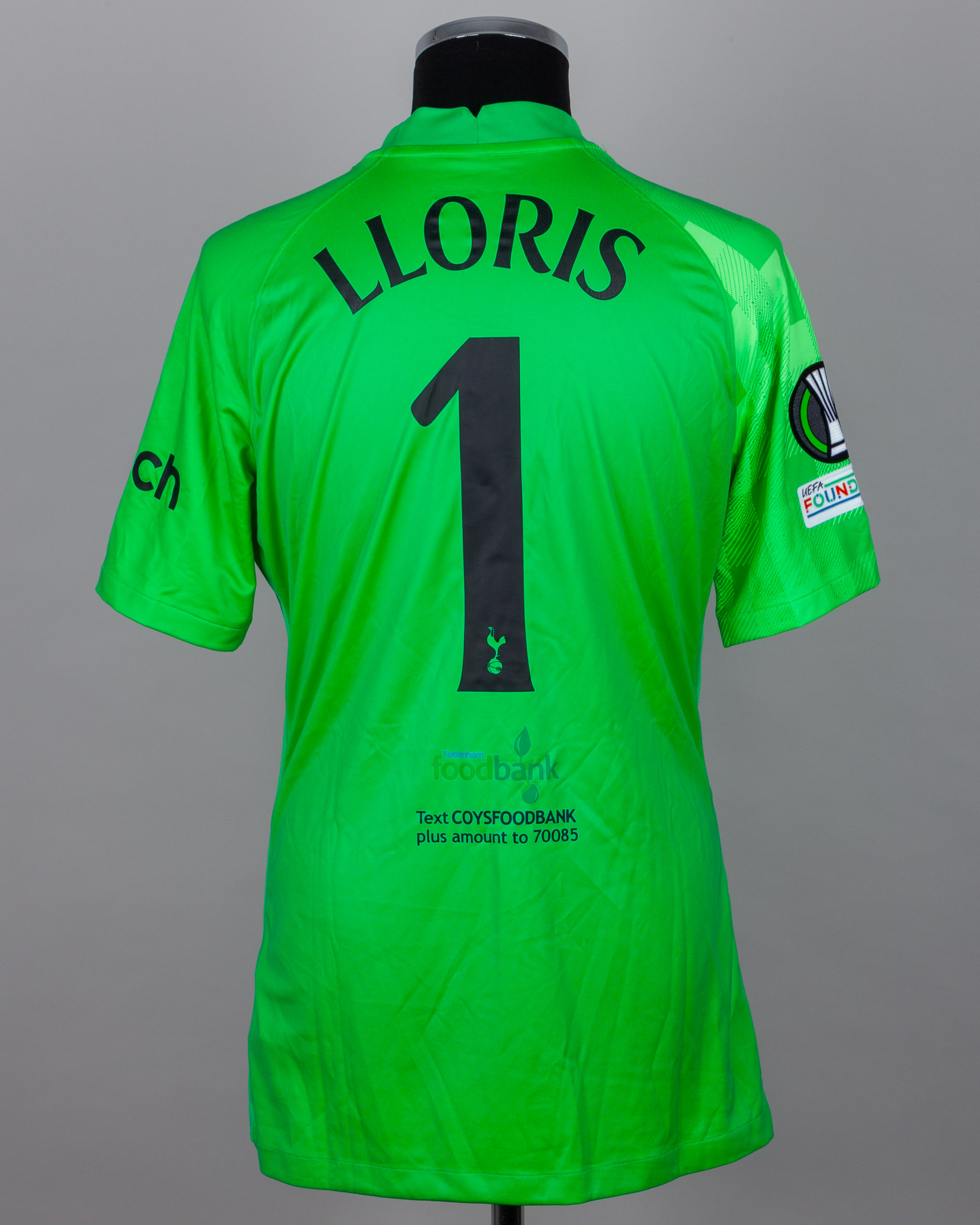Hugo Lloris green No.1 Tottenham Hotspur goalkeeper shirt, 2021-22, Nike, L, with crew-neck collar and printed badge, the reverse lettered LLORIS, the right sleeve with Europa Conference League flash