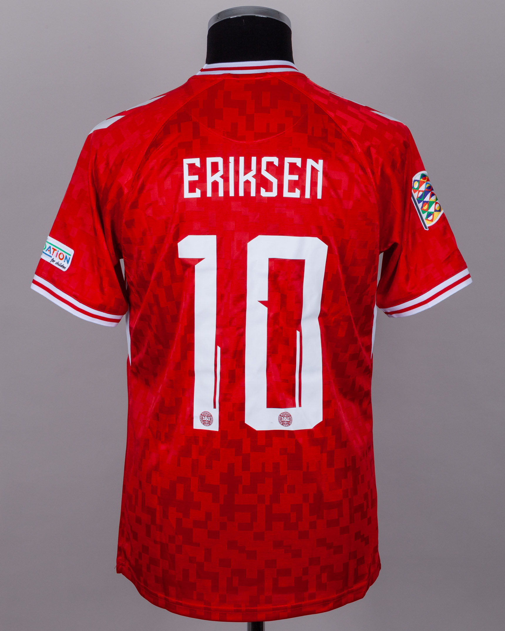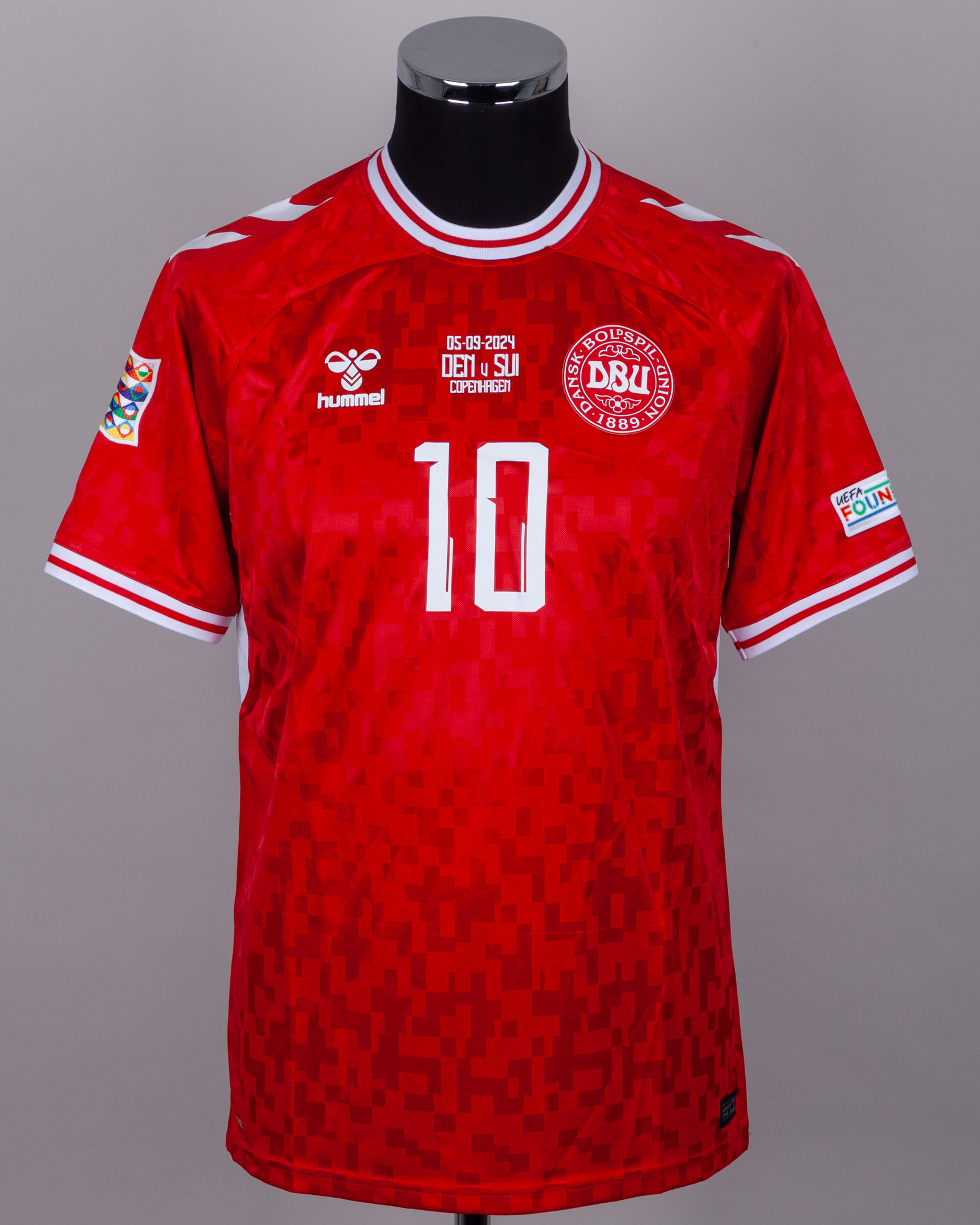 Christian Eriksen red No.10 Denmark v. Switzerland short-sleeved shirt, 2024, Hummel, M, with crew-neck collar and printed badge, with 05-09-2024 DEN v SUi COPENHAGEN decal, the reverse lettered ERiKSEN, the right sleeve with Nations League flash and the left sleeve with UEFA Foundations flash