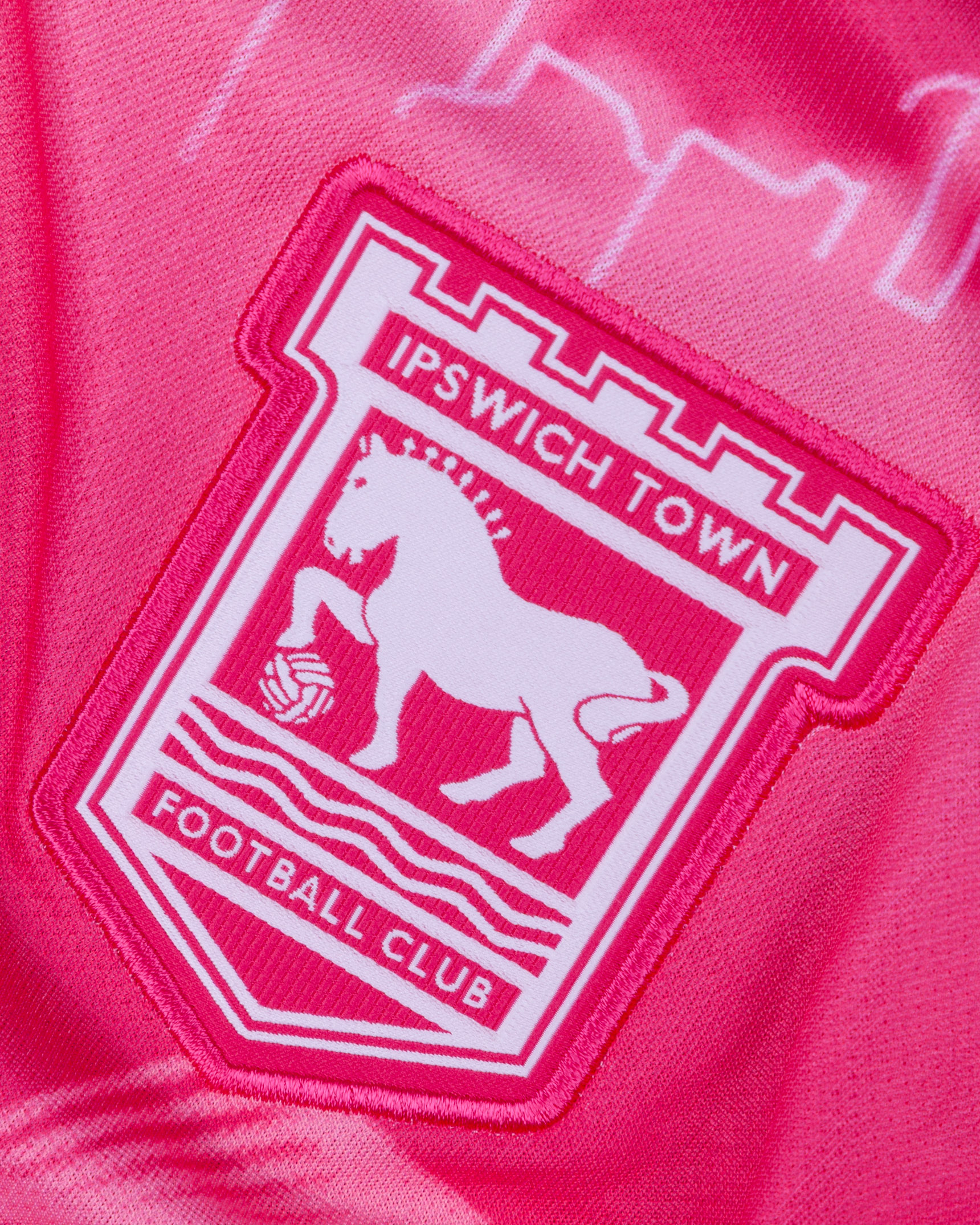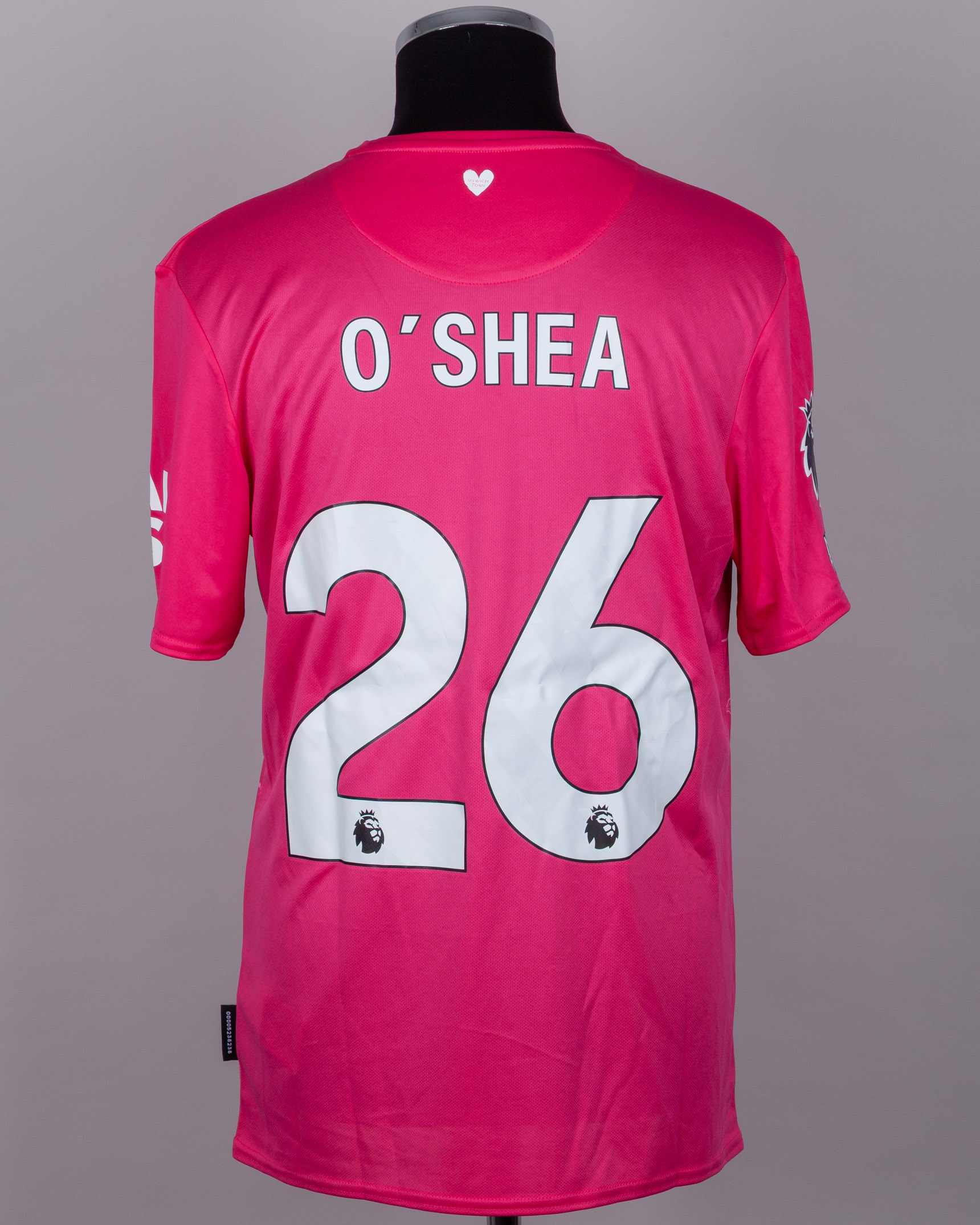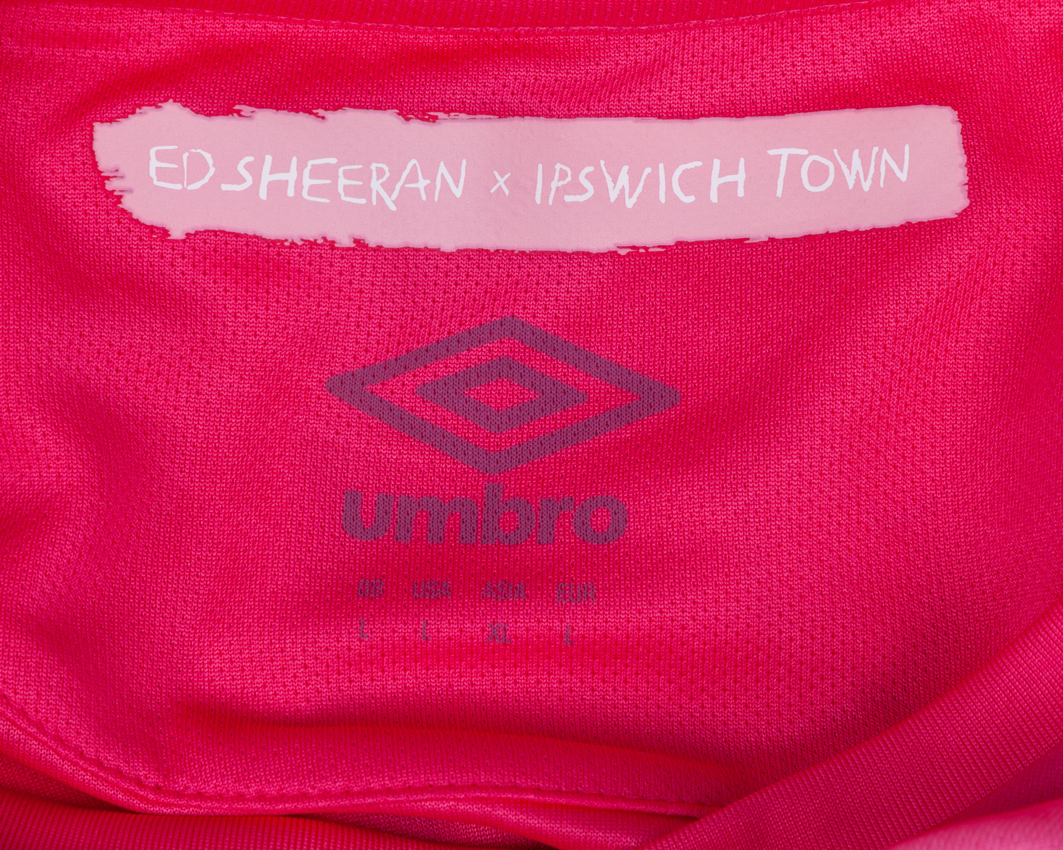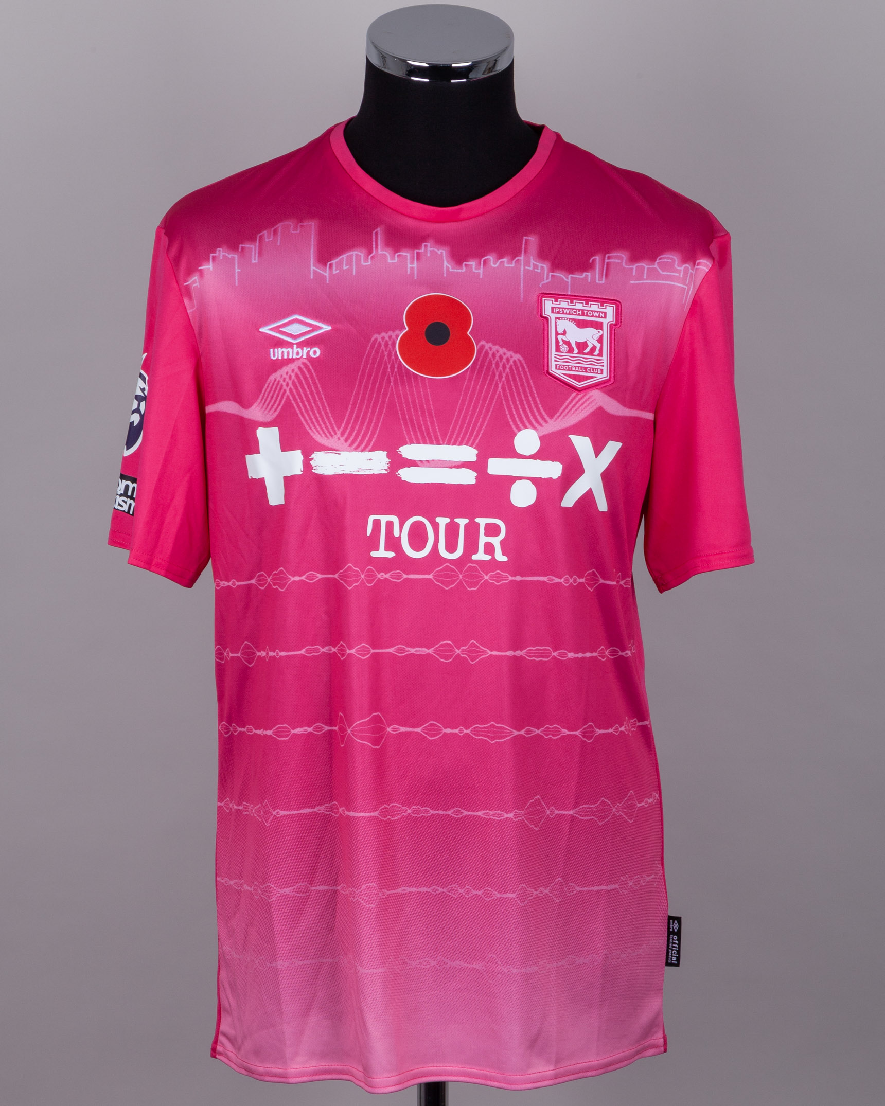 Dara O'Shea pink No.26 Ipswich Town v. Tottenham Hotspur short-sleeved shirt, 2024, Umbro, L, with crew-neck collar and embroidered cloth badge inscribed IPSWICH TOWN FOOTBALL CLUB, the reverse lettered O'SHEA, the right sleeve with Premier League and no room for racism flash