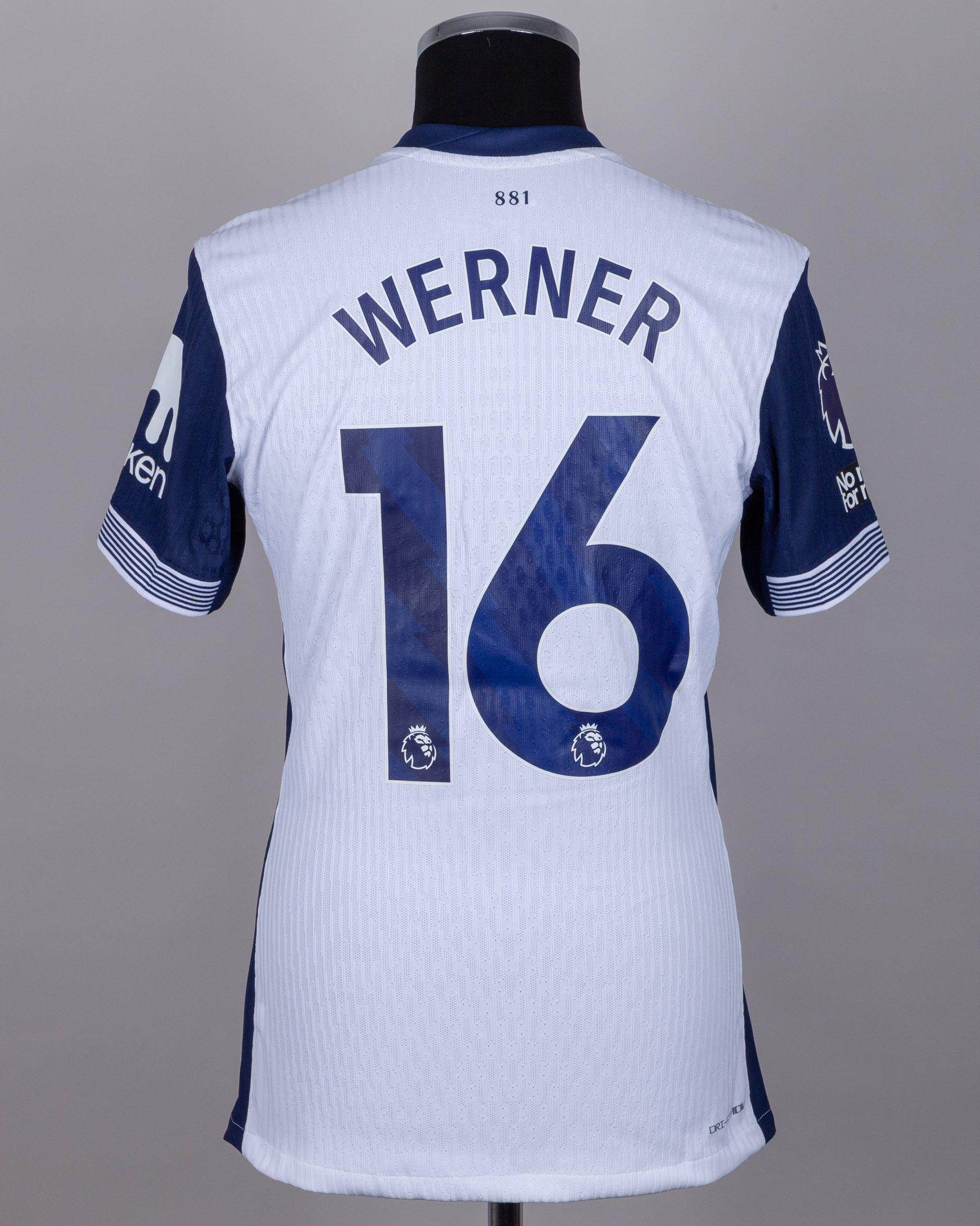 Timo Werner white and blue Tottenham Hotspur short-sleeved shirt, 2024-25, Nike, M, with crew-neck collar and printed badge, the reverse lettered WERNER, the right sleeve with Premier League and no room for racism flash
