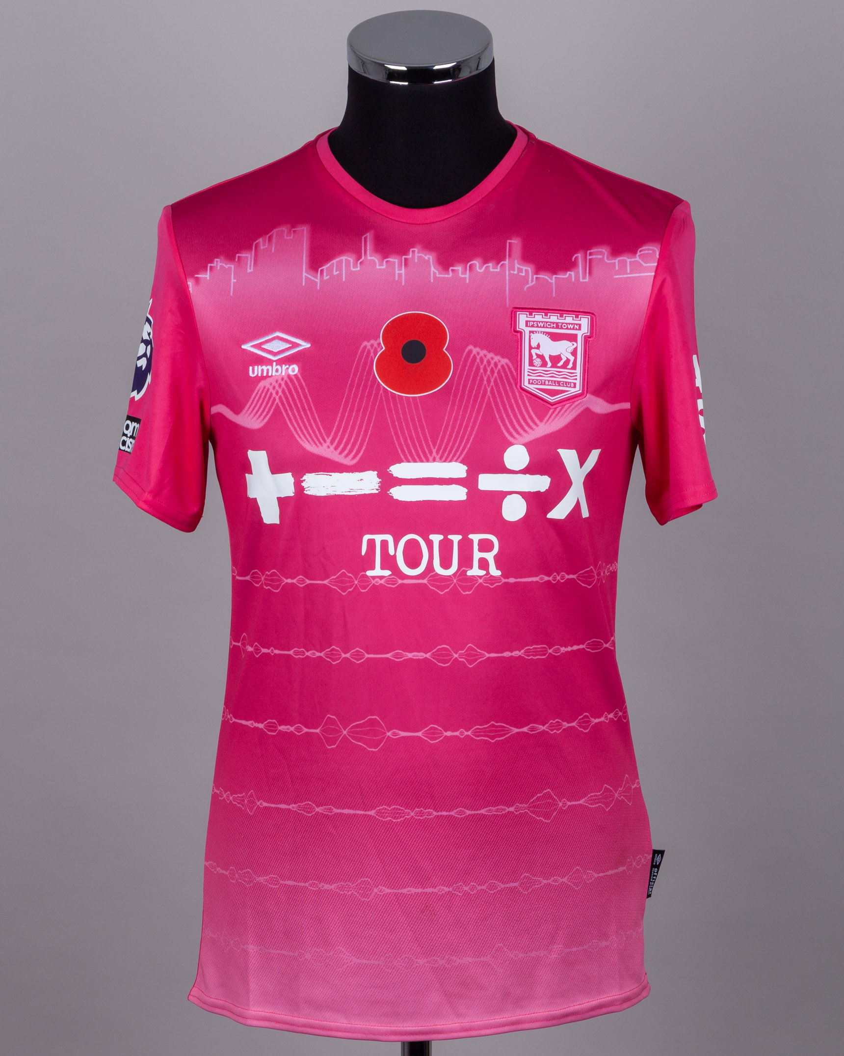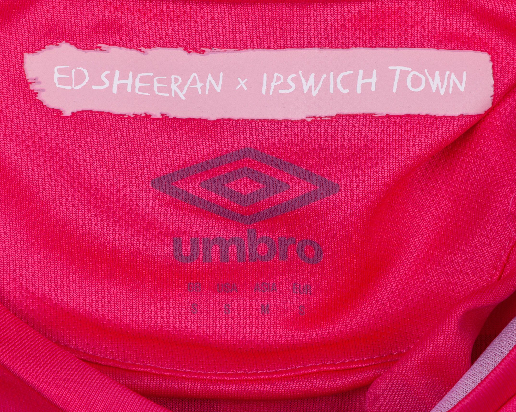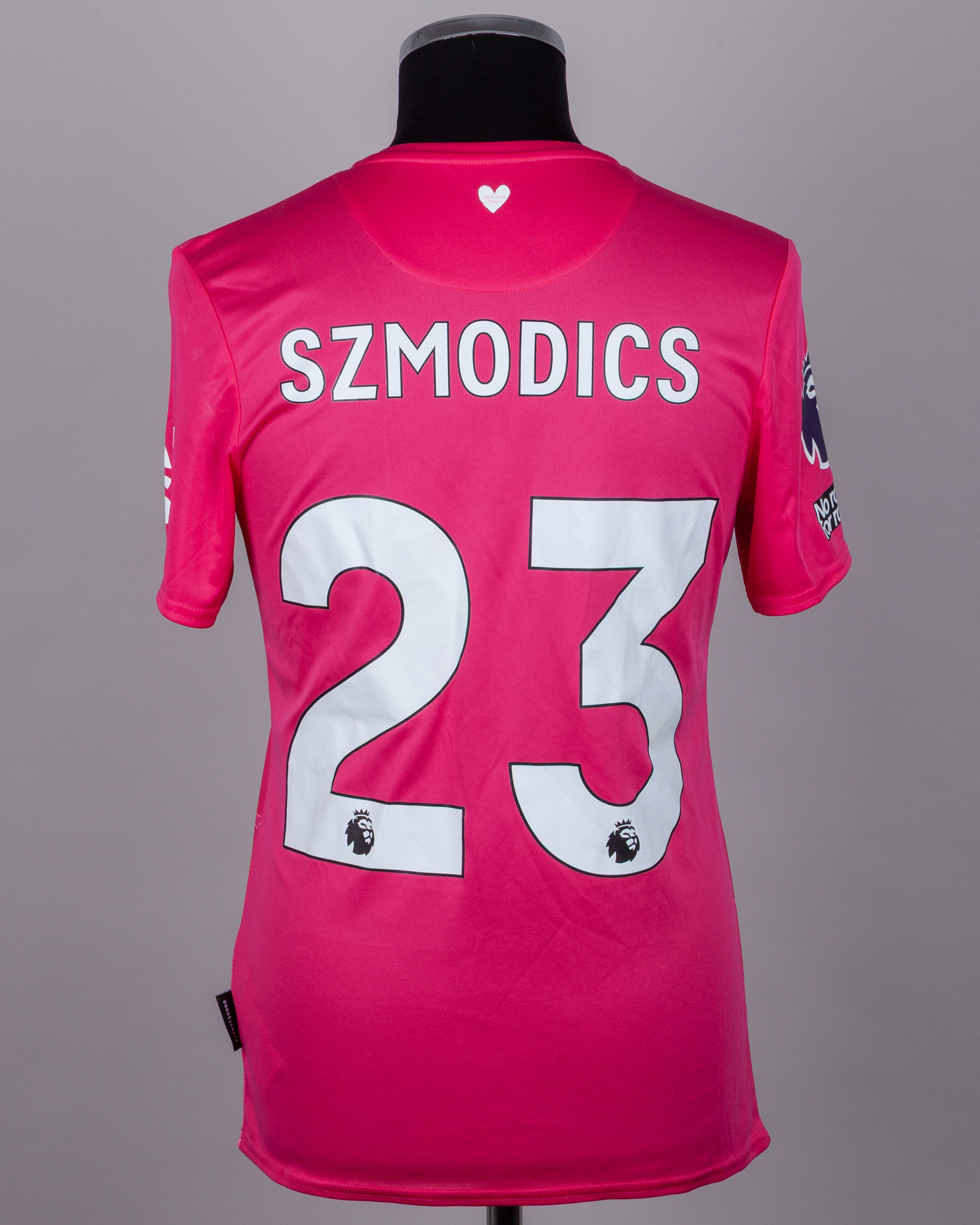 Sammie Szmodics pink No.23 Ipswich Town v. Tottenham Hotspur short-sleeved shirt, 2024, Umbro, S, with crew-neck collar and embroidered cloth badge inscribed IPSWICH TOWN FOOTBALL CLUB, the reverse lettered SZMODICS, the right sleeve with Premier League and no room for racism flash