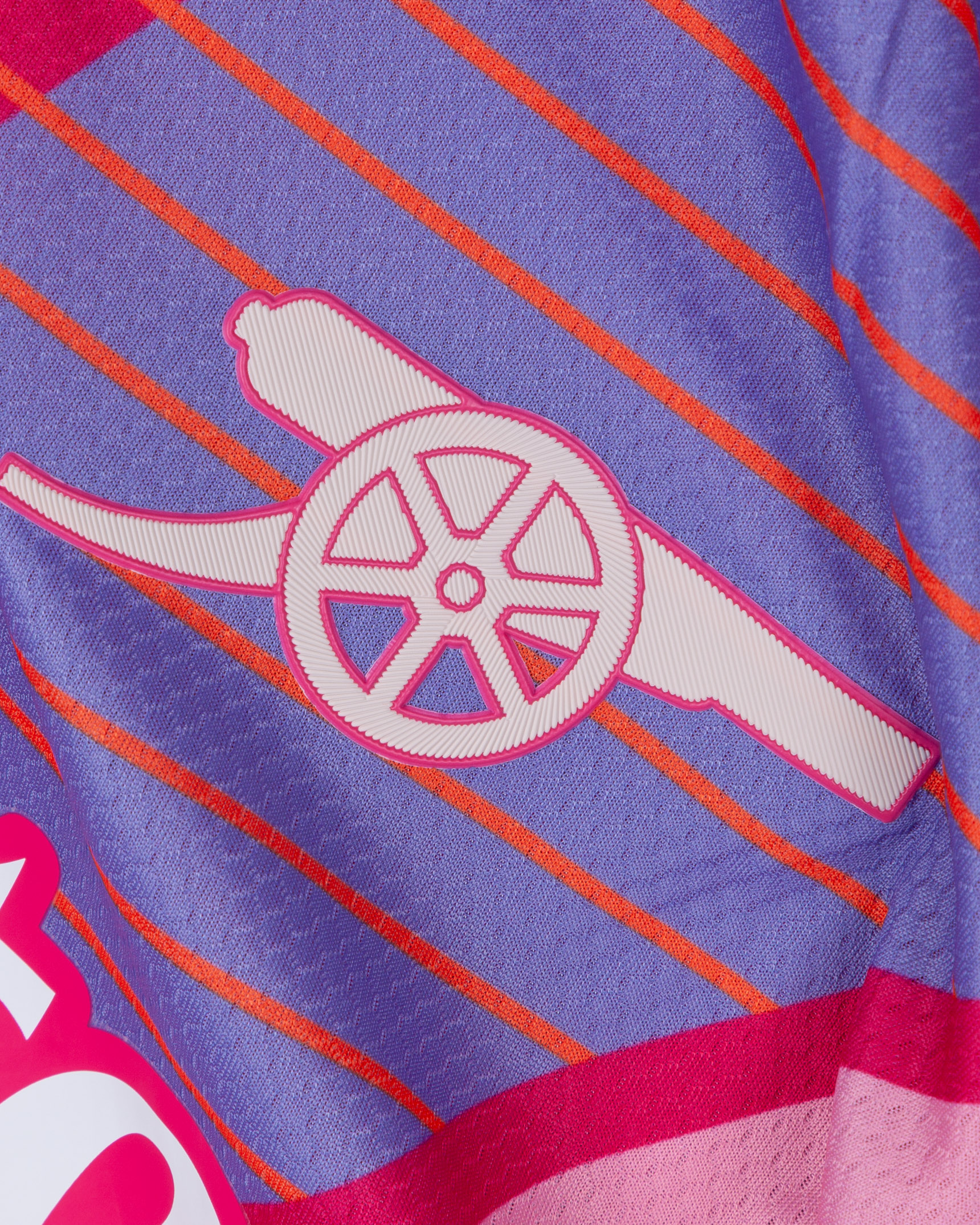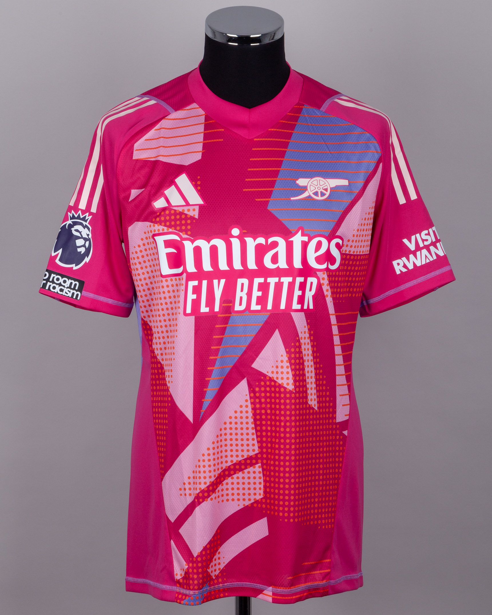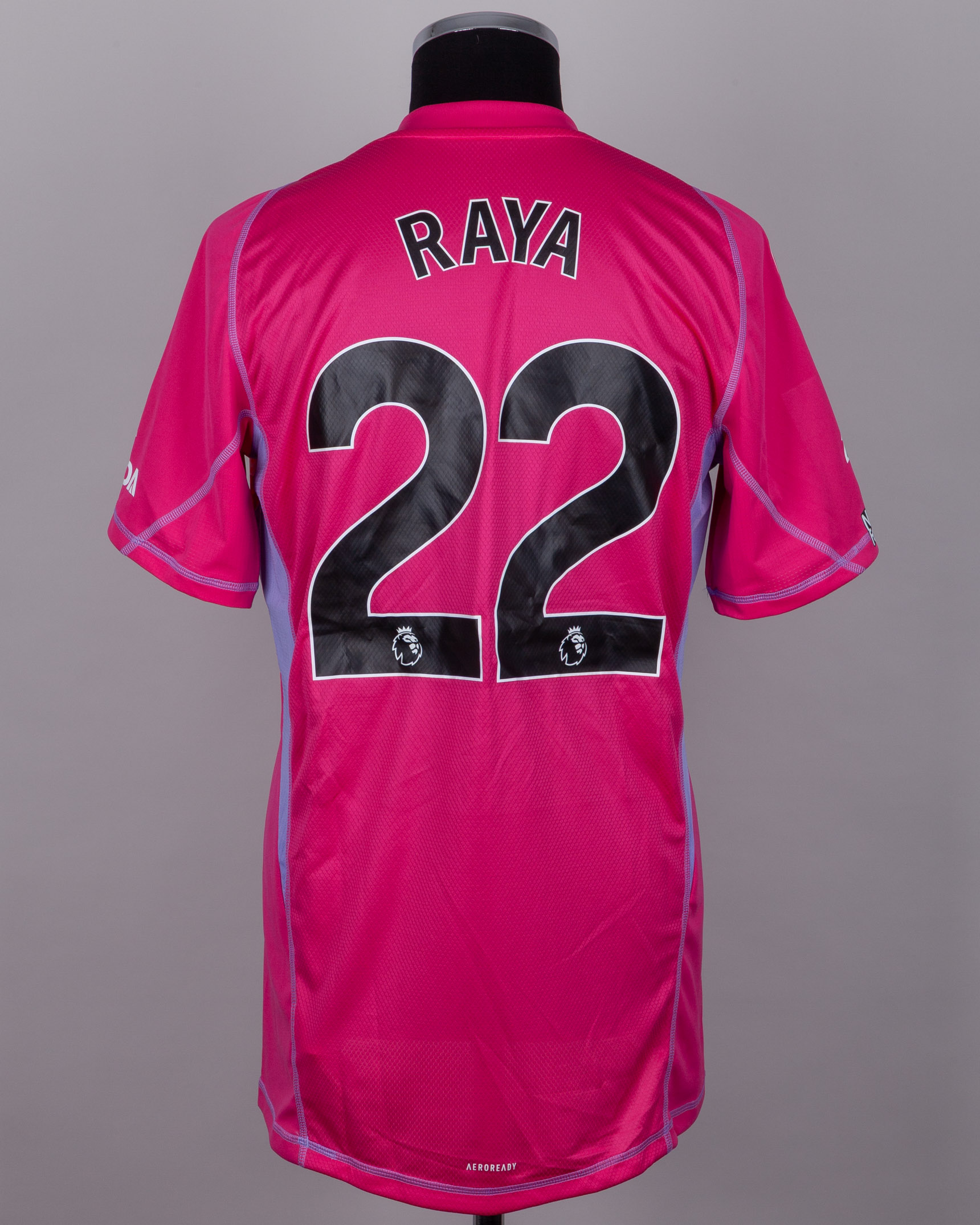 David Raya pink No.22 Arsenal v. Tottenham Hotspur short-sleeved shirt, 2024, Adidas, XL, with v-neck collar and printed badge, the reverse lettered RAYA, the right sleeve with Premier League and no room for racism flash