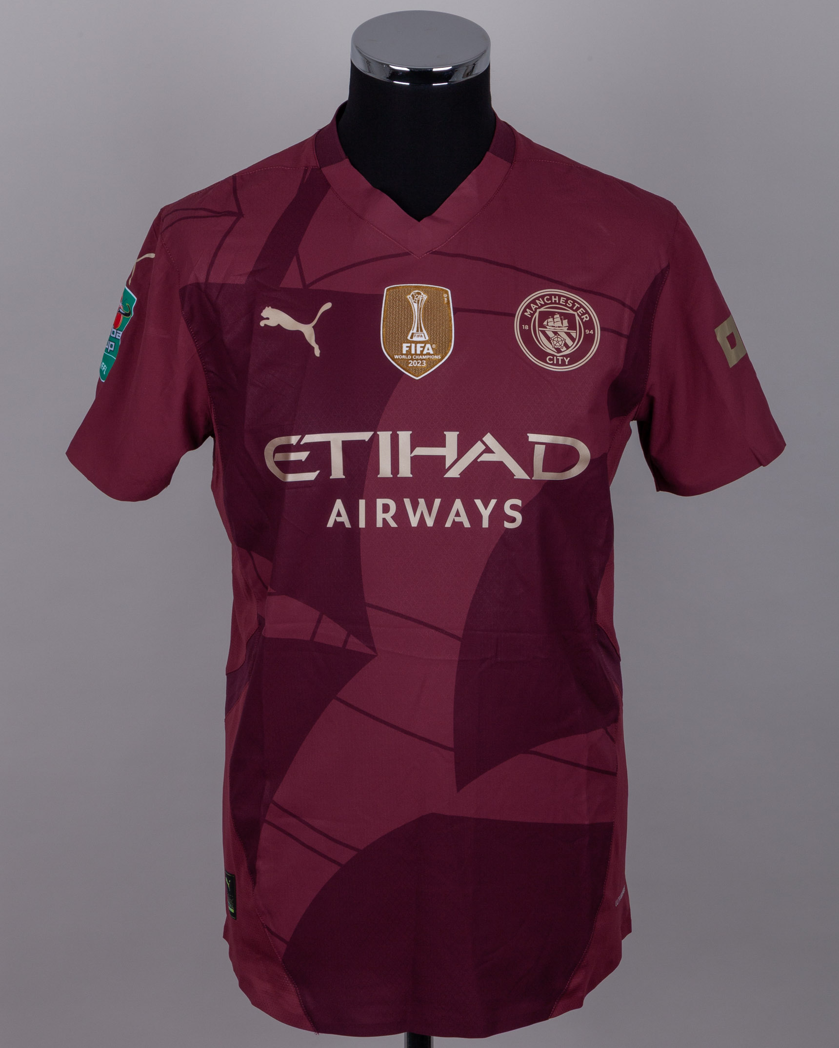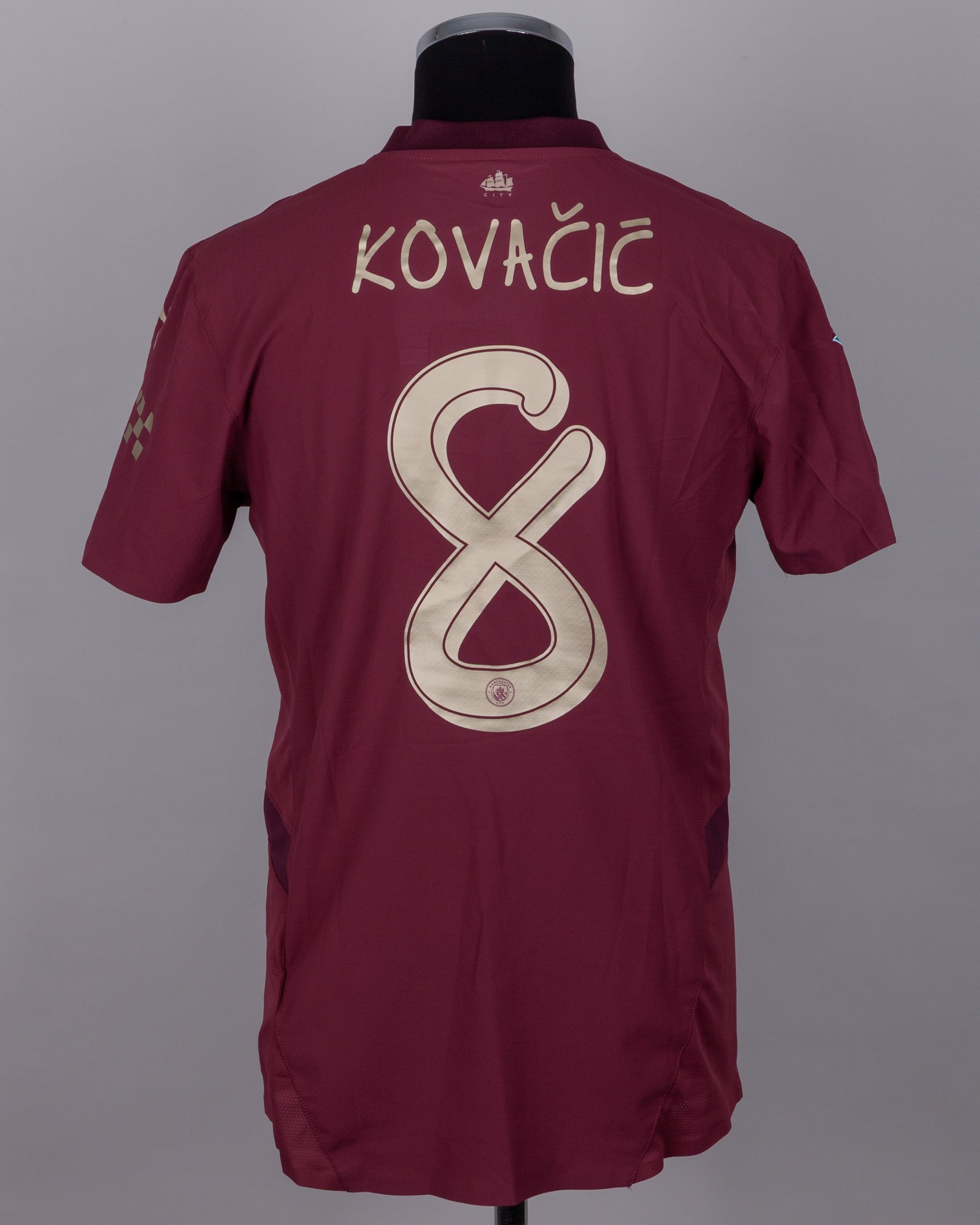 Mateo Kovacic Maroon No.8 Manchester City v. Tottenham Hotspur short-sleeved shirt, 2024, Puma, M, with v-neck collar and printed badge, the reverse lettered KOVACIC, the right sleeve with Carabao Cup flash