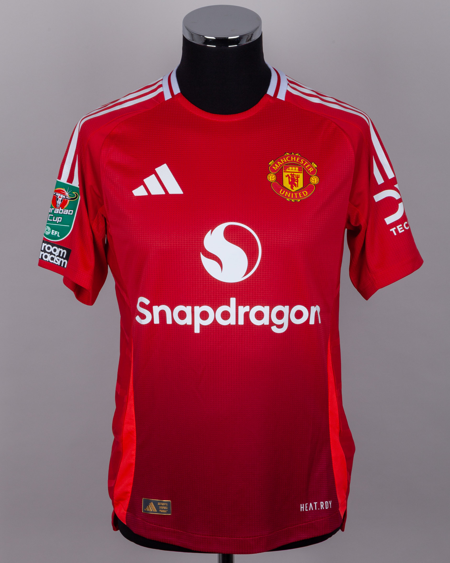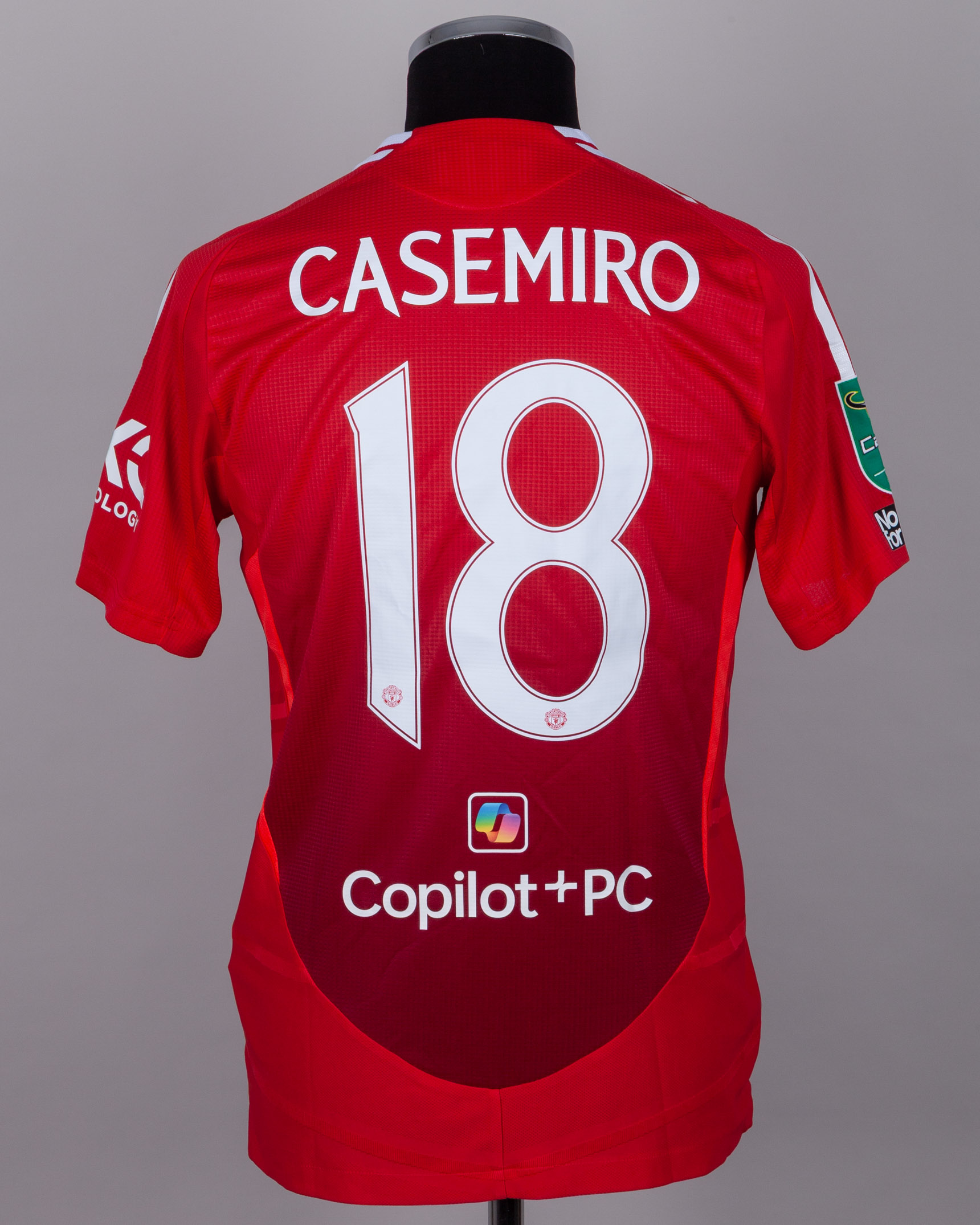 Casemiro red No.18 Manchester United v. Tottenham Hotspur short-sleeved shirt, 2024, Adidas, M, with crew-neck collar and printed badge, the reverse lettered CASEMIRO, the right sleeve with Carabao Cup flash